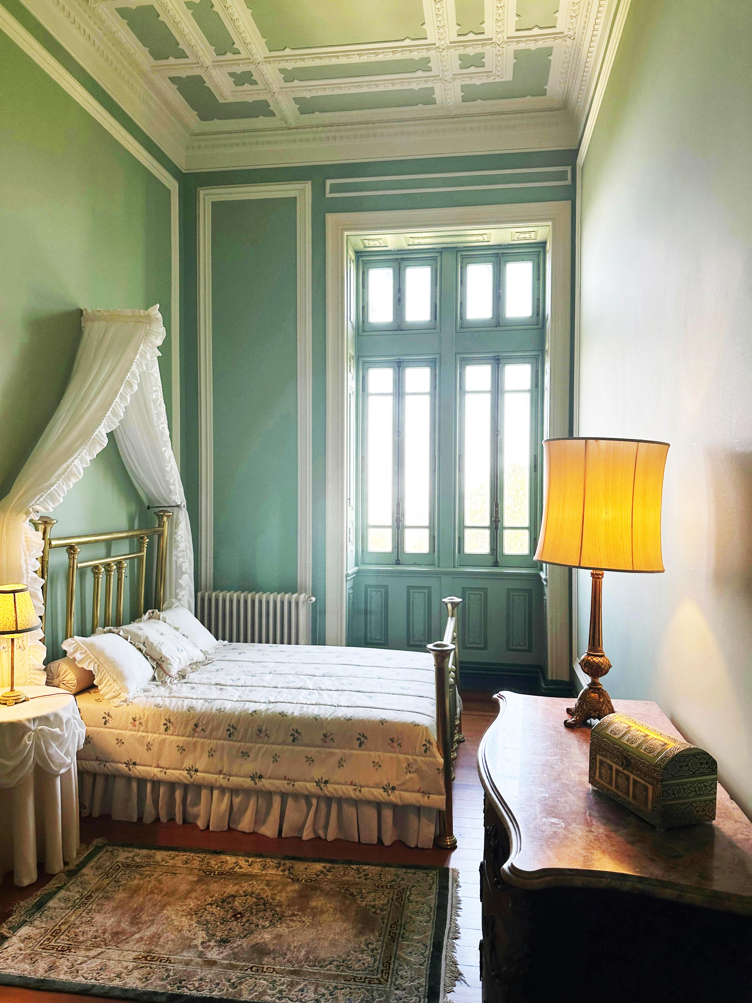 La raffinatezza francese si esprime anche nel modo in cui la stanza è decorata con fiori freschi, piante in vaso e dettagli naturali come i rami secchi.