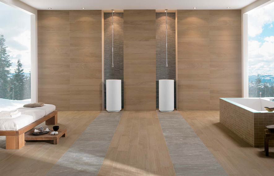 Per quanto riguarda la posa, i due rivestimenti devono trovarsi allo stesso livello grazie all’uso di una soglia separatrice, per esempio. Un’altra opzione è quella di aggiungere un sostrato a uno dei due materiali dopo aver calcolato la differenza di spessore. È anche possibile scegliere delle piastrelle effetto legno da pavimento perché abbiano lo stesso spessore delle piastrelle con altro effetto a cui sono combinate.