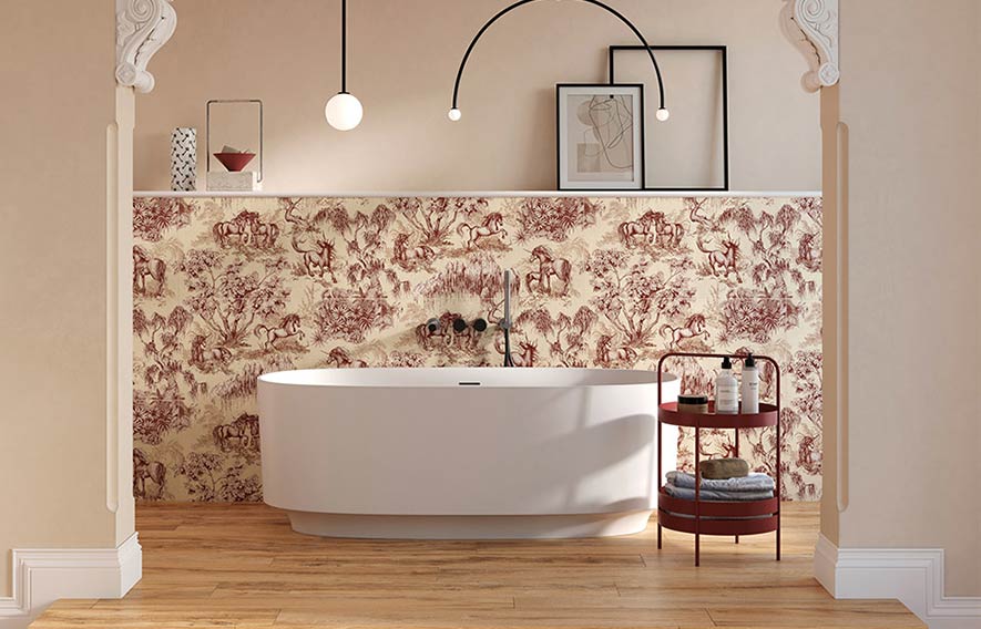 Questo modo di combinare piastrelle e parquet crea un look personalizzato e permette inoltre, come un pavimento destrutturato, di isolare alcuni elementi per valorizzarli. Per esempio i nostri bagni possono diventare il luogo perfetto in cui la bellezza si combina con la resistenza. In effetti le piastrelle da rivestimento possono essere posate dietro la vasca da bagno o sui rivestimenti della doccia per strutturare lo spazio.