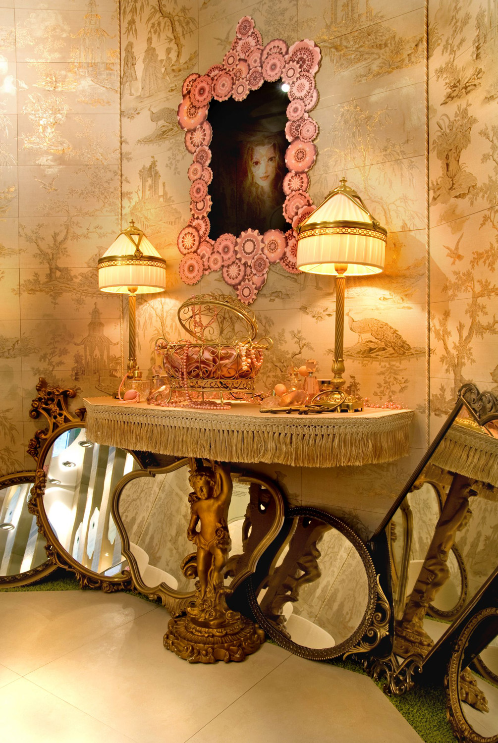 In fondo al corridoio di ingresso si arriva al padiglione rivestito di Toile de Jouy abitato da una affascinante fata silvana. Se osservate con attenzione potete vederla mentre si specchia nel suo specchio magico…