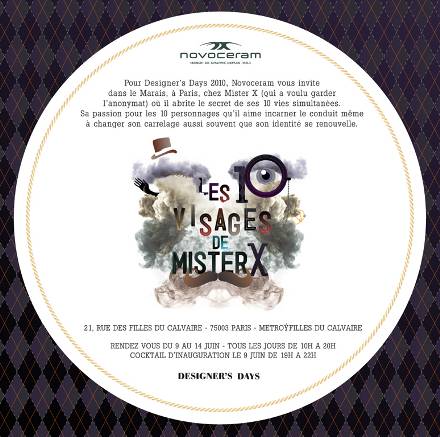 In occasione dei Designer’s Days 2010, Novoceram vi invita nel Marais, nel cuore di Parigi, nella dimora dove Mister X custodisce il segreto delle sue 10 vite. La passione per i 10 personaggi che ama interpretare, lo conduce addirittura a cambiare il pavimento ogni volta che la sua identità si rinnova.