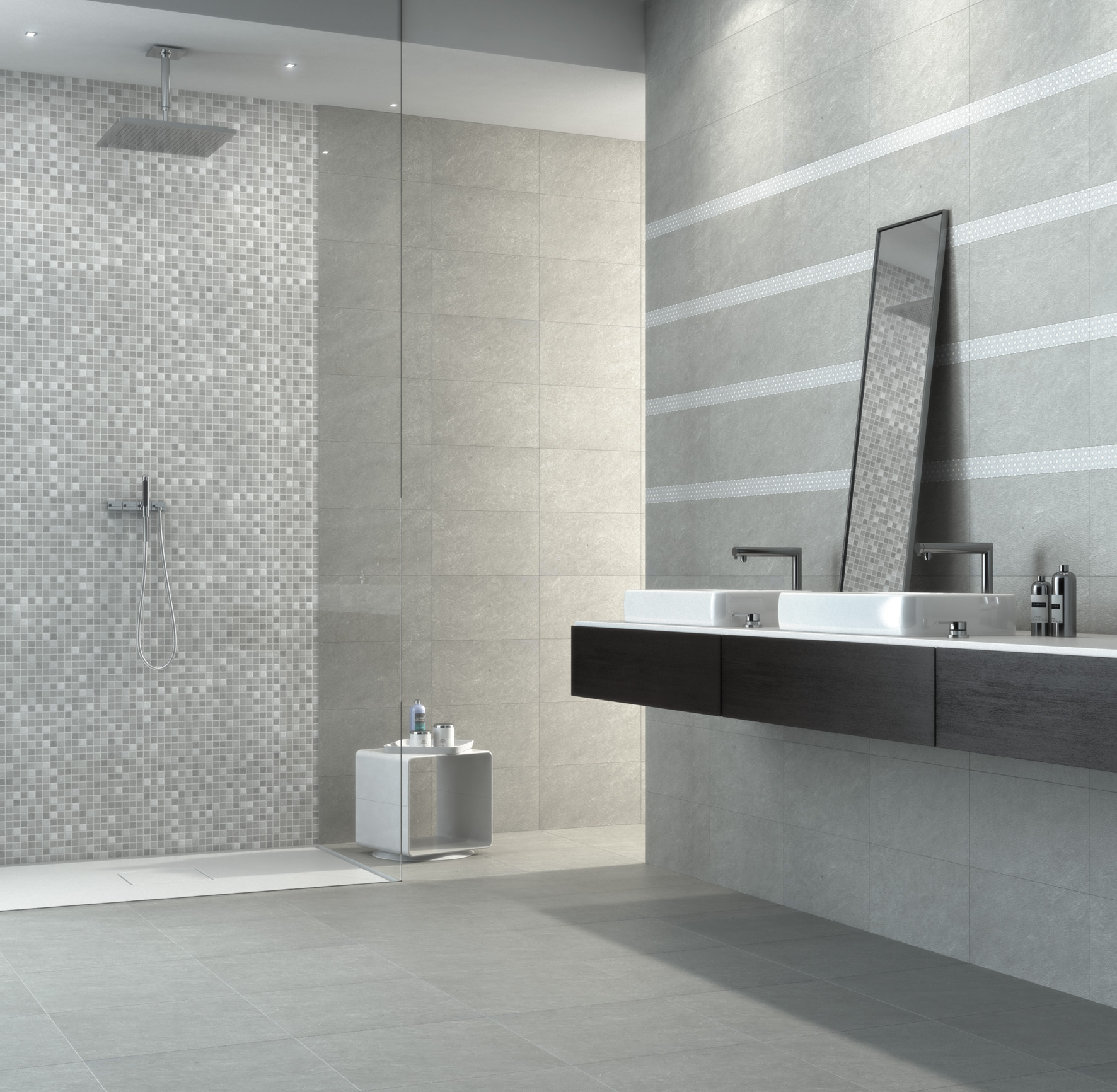 L’offerta è completata da un listello in formato 5,5×45 cm, proposto nella versione calda – in abbinamento con i colori Opale e Ivoire – e fredda, in abbinamento al colore Perle e da un inserto a effetto mosaico da stuccare in opera, proposto altresì nelle due versioni calda e fredda. La possibilità di stuccare le fughe preincise tra le tessere garantisce un risultato estetico del tutto analogo a quello di un mosaico tradizionale a un costo molto inferiore.