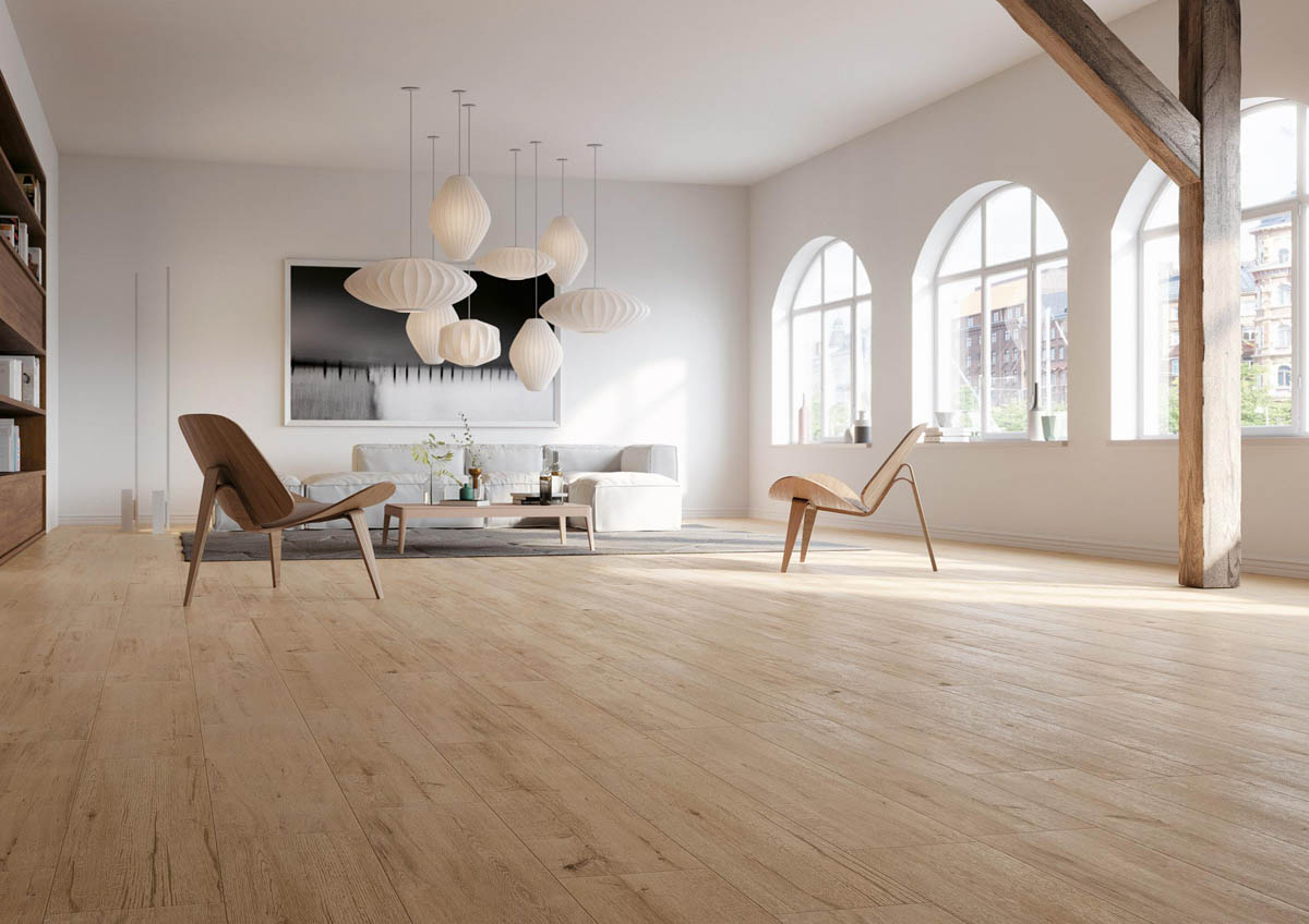 In risposta a questo bisogno di natura, il calore confortevole de legno è stato largamente declinato nella decorazione di interni. Ad esempio la ceramica si allunga per assomigliare ai listoni del legno imitandone anche l’aspetto esteriore.