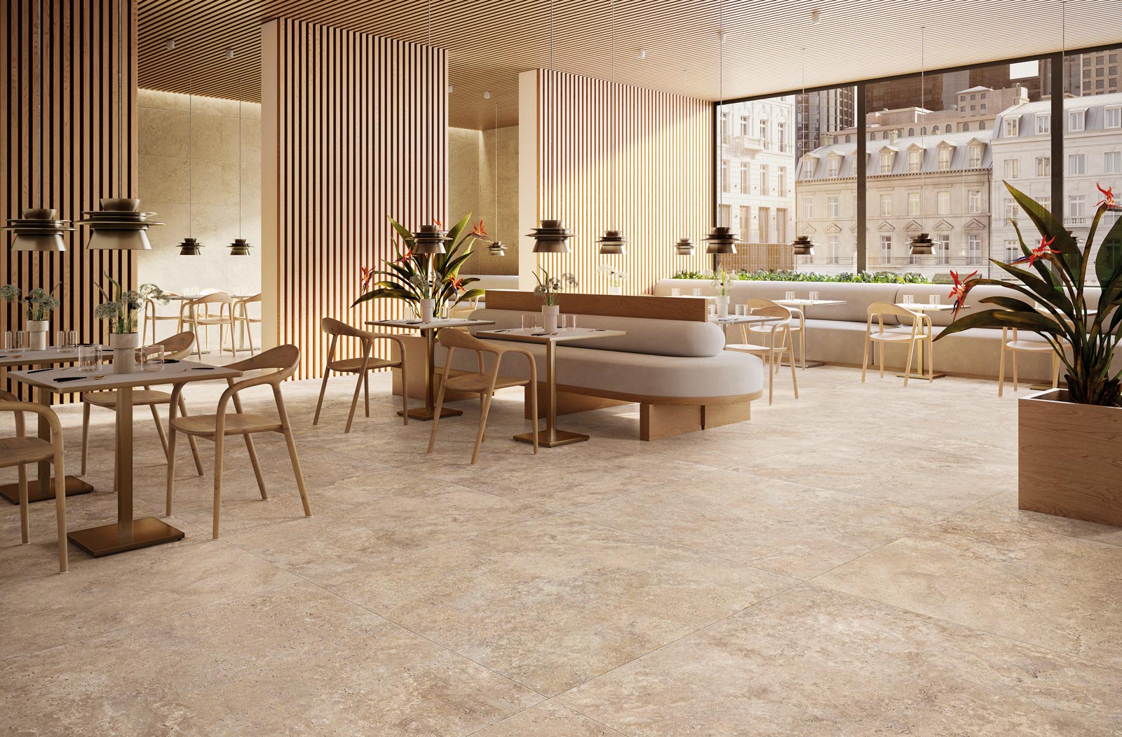 - Tiber Natural che rispetta la naturale stonalizzazione della pietra originale, caratteristica che crea un suggestivo gioco di chiaroscuro quando viene declinato nel formato quadrato 80×80 e rettangolare 60×120.