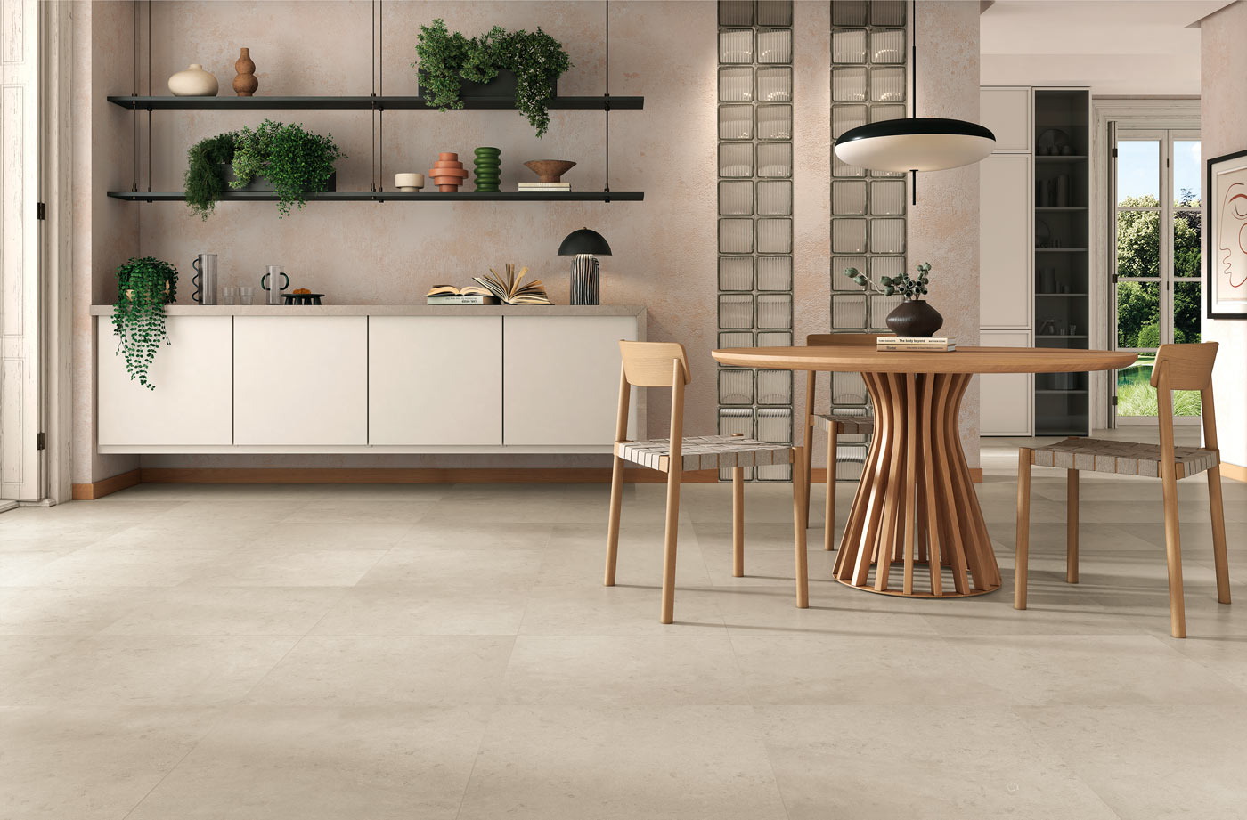 Inaya è l’interpretazione ceramica di una roccia di natura sedimentaria dall’aspetto leggero e omogeneo, arricchito da particolari inclusioni fossili tipiche di questa tipologia di pietra. Le “limestones” (pietre calcaree) sono composte per la maggior parte proprio da sedimenti di materiale fossile, che alle volte può rimanere integro e “intrappolato” nel momento in cui la pietra si compatta.