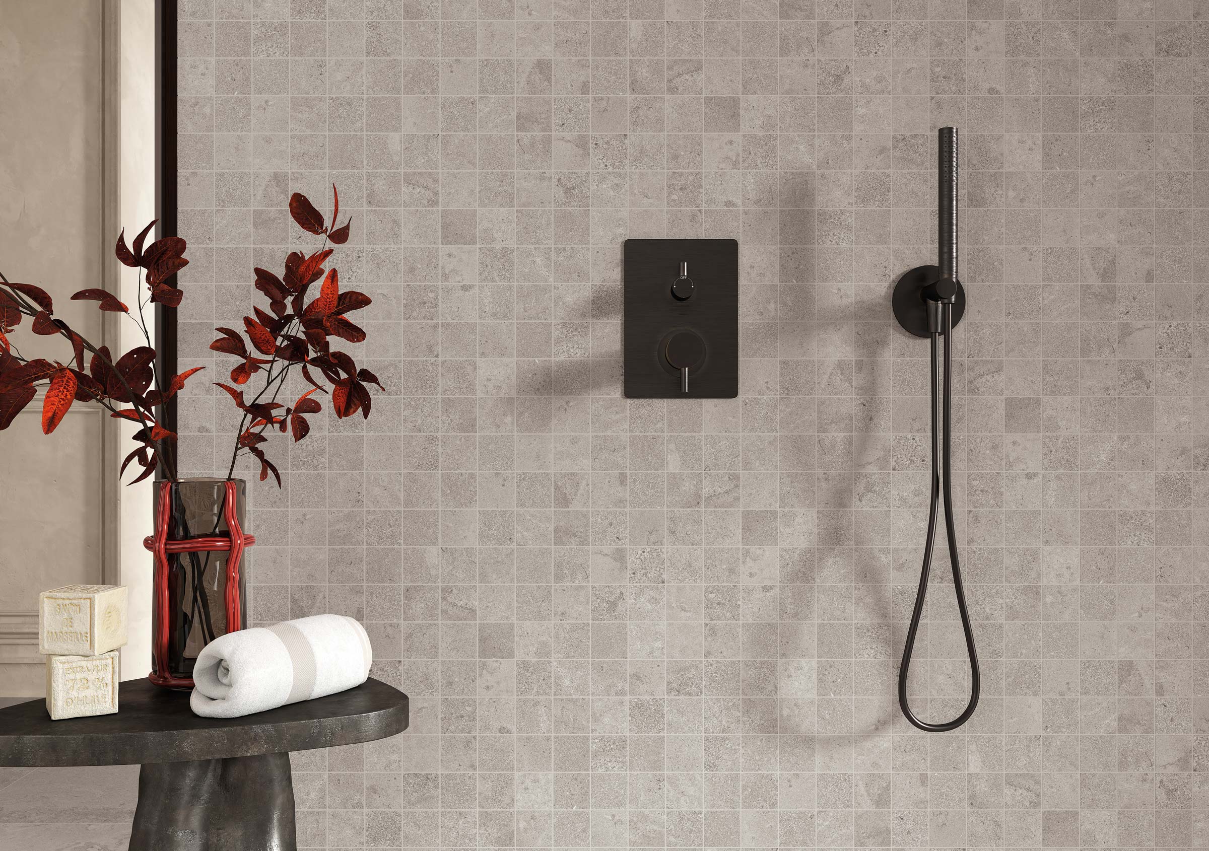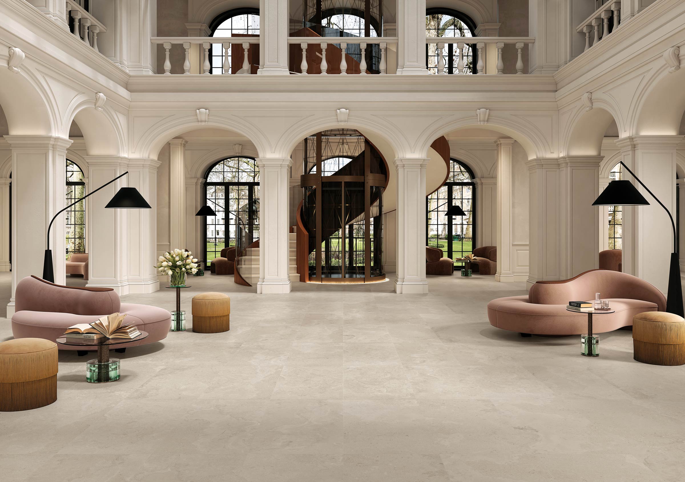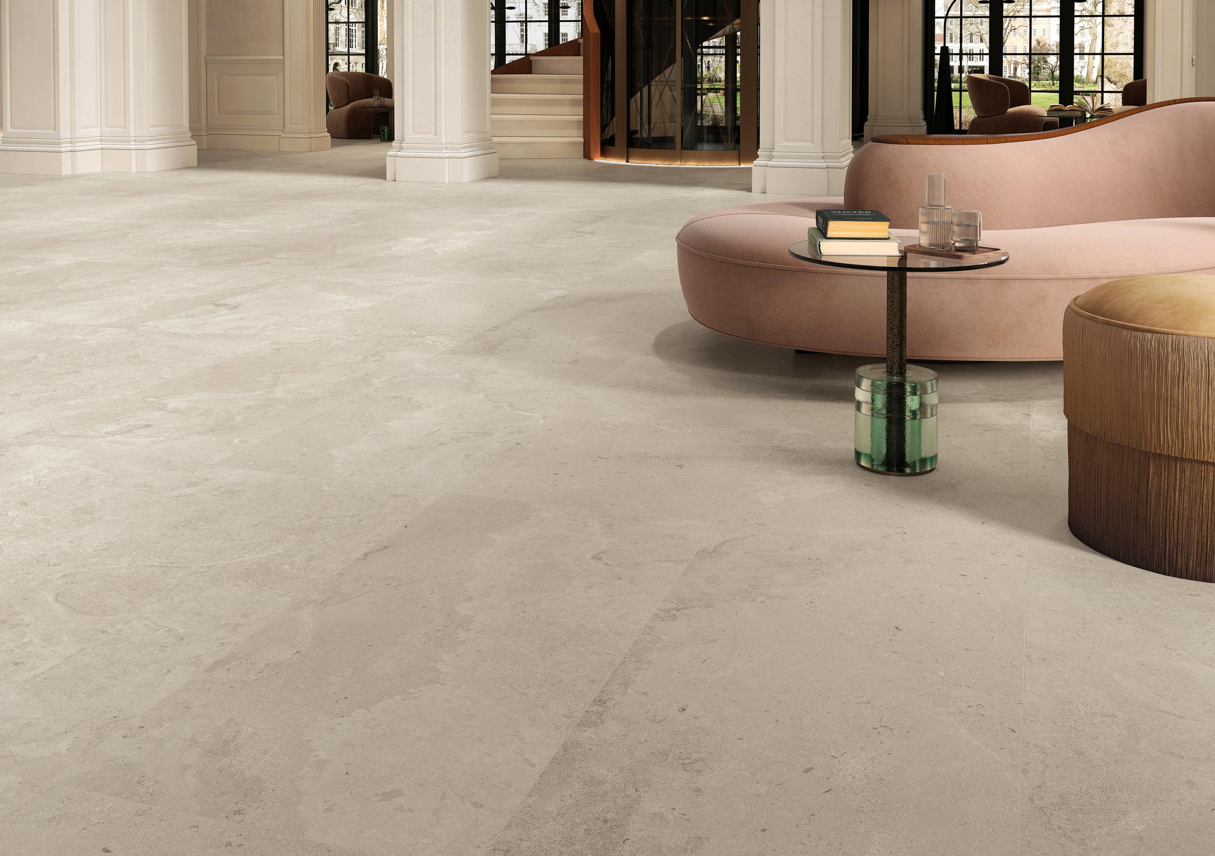 La grana compatta e uniforme della pietra di Portland si ritrova in tutte le declinazioni colore di Kairn: Natural, che riproduce fedelmente la calda tonalità grigia del materiale originale, Gris, che si ispira alla tonalità del cemento per reinventare una versione più scura e moderna e infine Sable, una proposta dai toni più caldi.