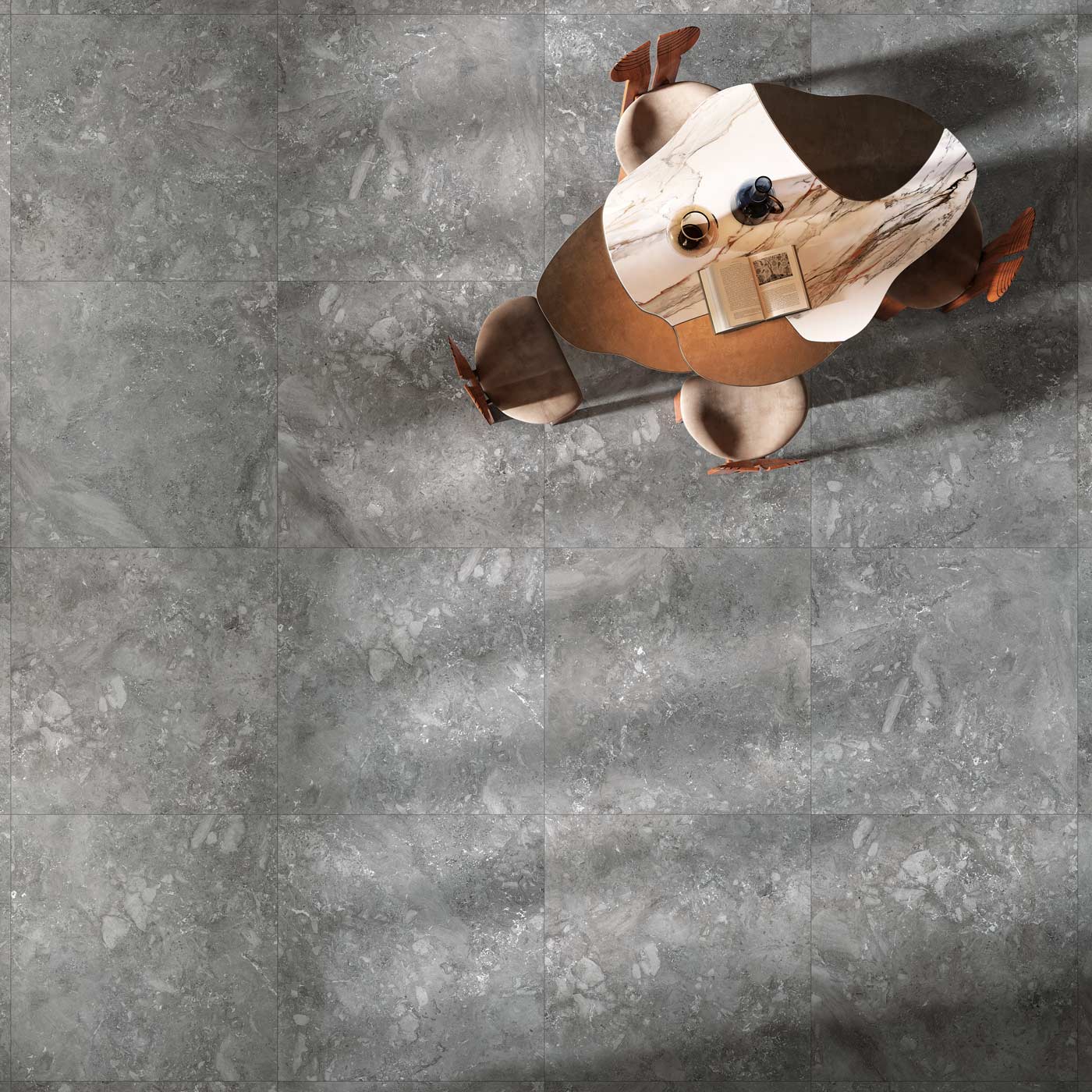 Kryo è l’interpretazione ceramica di una dolomia brecciata originaria del Brasile che racchiude in sé l’aspetto venato del marmo e la compattezza dei cristalli del granito.
