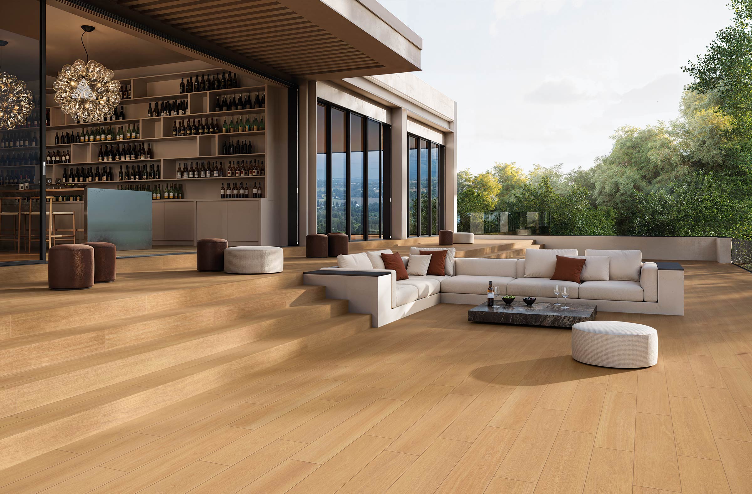 Oaka è disponibile in spessore 9,0 nei formati 20×180 e 20×120 con finitura R10 – B. Per il medesimo spessore, completa la gamma la proposta esterno in 20×120 con finitura strutturata e caratteristiche antiscivolo R11 – C.