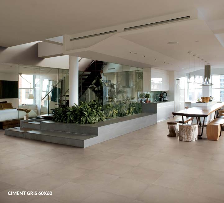 L’aspetto neutro e sobrio del cemento ceramico prende vita con la luce con le sue tinte di una delicatezza ineguagliabile. Rivela sotto i suoi toni freddi, delicati riflessi e giochi di piccole crepe che mettono in evidenza il suo aspetto stonalizzato e le sue caratteristiche industriali. Solitamente è associato a una decorazione contemporanea moderna e minimal e dà un tocco di eleganza.