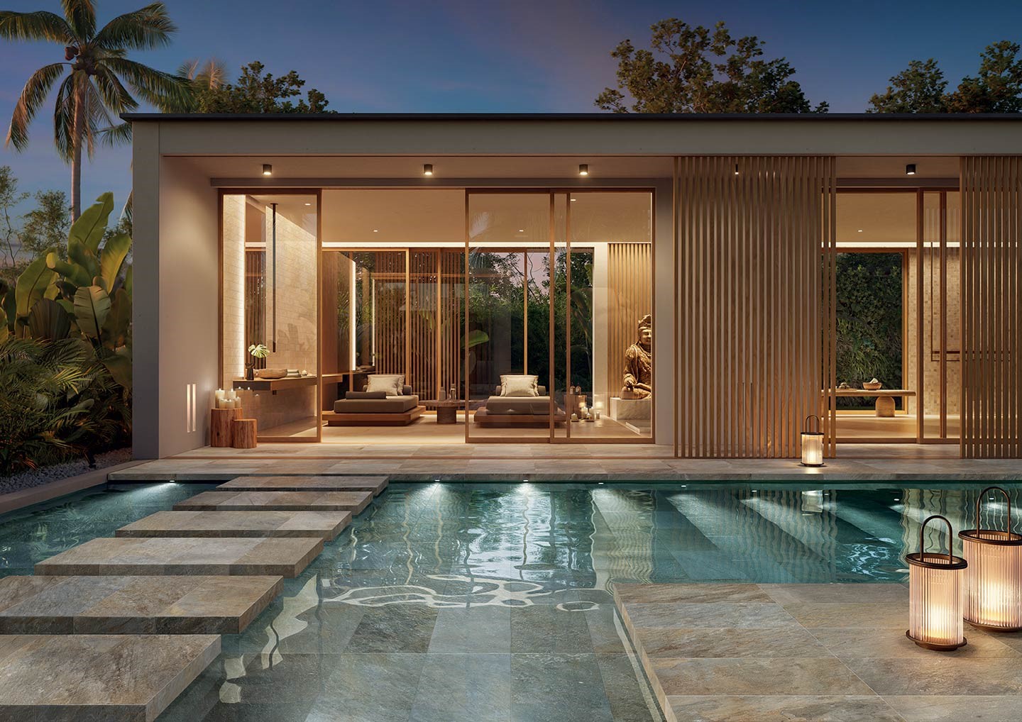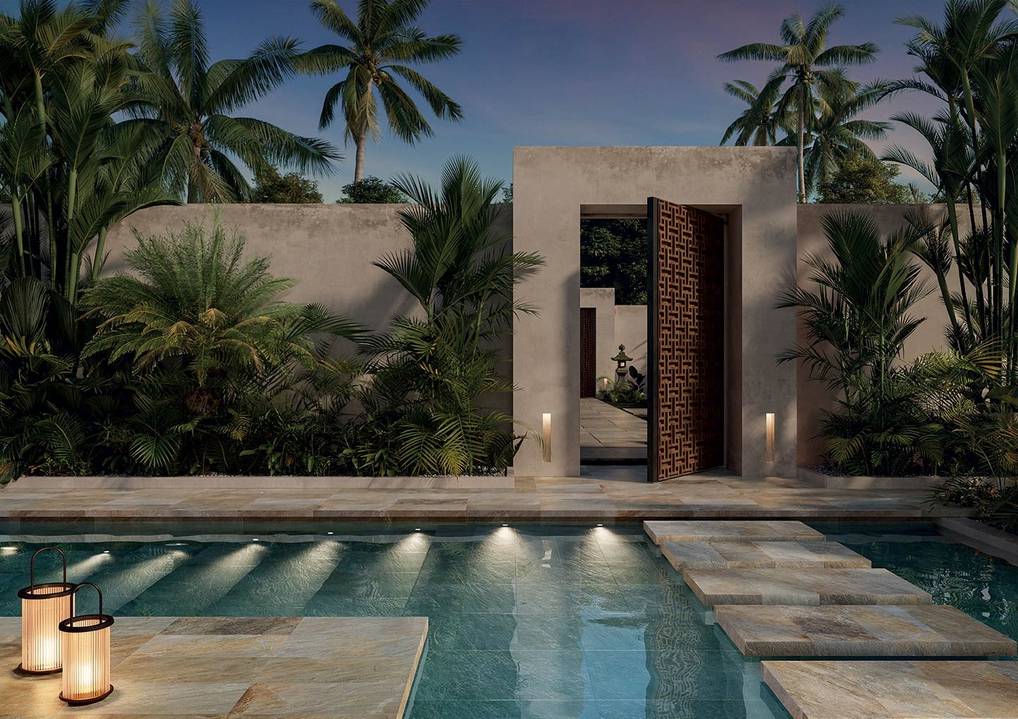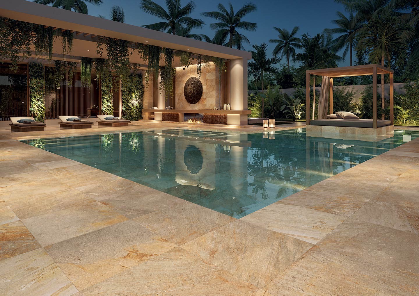 Le piastrelle effetto pietra di Bali sono utilizzate principalmente per rivestire e decorare le piscine esterne, soprattutto grazie ai loro colori naturali unici. I suoi paradisiaci riflessi arancioni e verdi conferiscono a qualsiasi acqua limpida un aspetto balinese. Installando una piastrella effetto pietra di Bali sul fondo della piscina e intorno ai bordi, potrete godere di un rivestimento degno delle più belle piscine a sfioro balinesi.