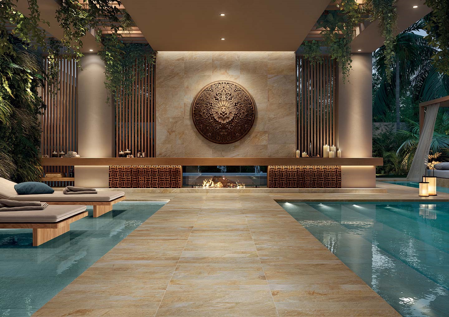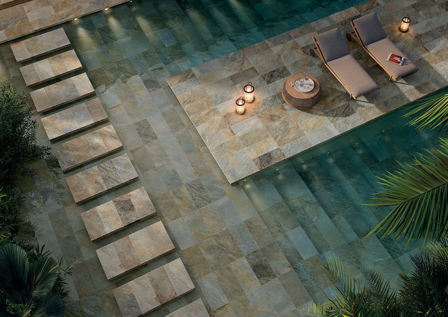 Le piastrelle effetto pietra di Bali sono la scelta ideale per rivestire una piscina, sia per motivi tecnici che estetici. Con le sue proprietà antiscivolo e i suoi sublimi riflessi smeraldo, vi soddisferà fin nei minimi dettagli. I suoi colori celestiali vi permetteranno di godere di una piscina dall’aspetto raffinato e rilassante, al pari delle più grandi spa di lusso. Le piastrelle in pietra di Bali vi daranno l’impressione di immergervi nelle più belle lagune indonesiane da casa vostra. La vostra piscina aggiungerà un certo fascino ai vostri esterni.
