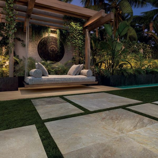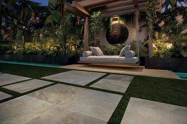 Le piastrelle effetto pietra di Bali non sono adatte solo per le piscine e le zone umide della casa. Anche la terrazza o i vialetti del giardino possono beneficiare di un rivestimento realizzato con questo materiale unico. Una piastrella effetto pietra di Bali è perfetta per esterni sobri ed esotici. Grazie alla robustezza di questo tipo di pavimentazione, è possibile posizionare facilmente i mobili da giardino su di essa senza timore di danneggiarla.