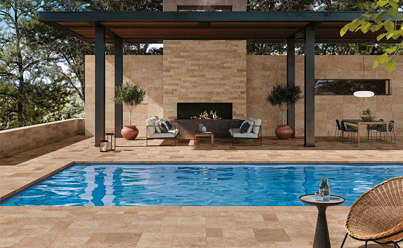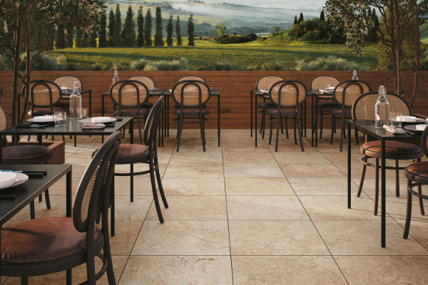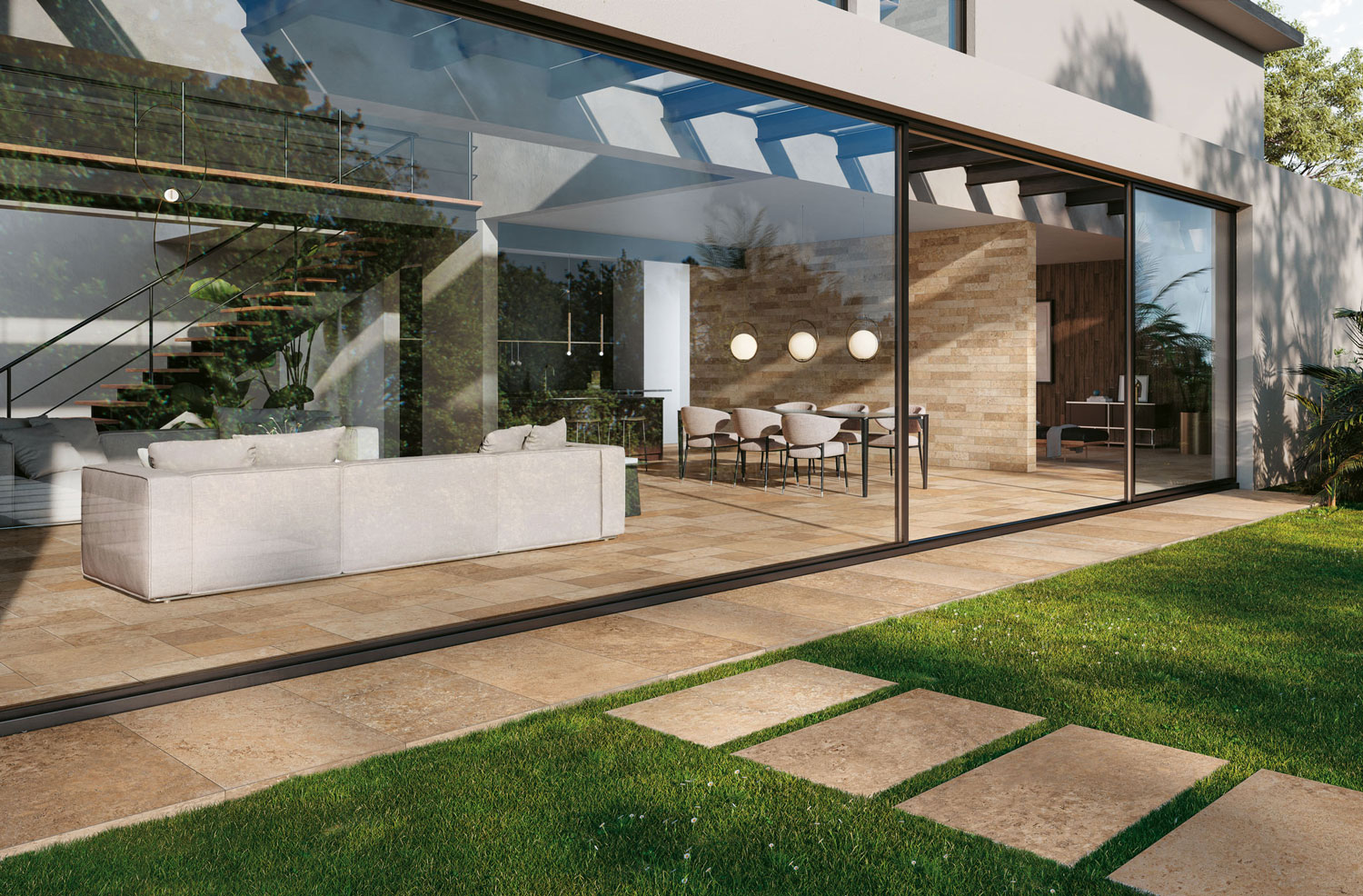 Infine, con una superficie antisdrucciolo e uno spessore di 20mm, la ceramica effetto travertino è disponibile anche nella gamma Outdoor Plus, concepita appositamente per gli spazi esterni. In questo caso è possibile fare ricorso anche a diversi metodi di posa come la posa su ghiaia, su erba o sopraelevata su piedini e la posa tradizionale incollata può essere evitata. Questa scelta estetica dà a ogni spazio esterno, dal giardino alla terrazza passando per il balcone, un design senza tempo e originale creato dalla delicatezza delle diverse sfumature di beige e la fedele riproduzione del materiale a cui sono ispirati.