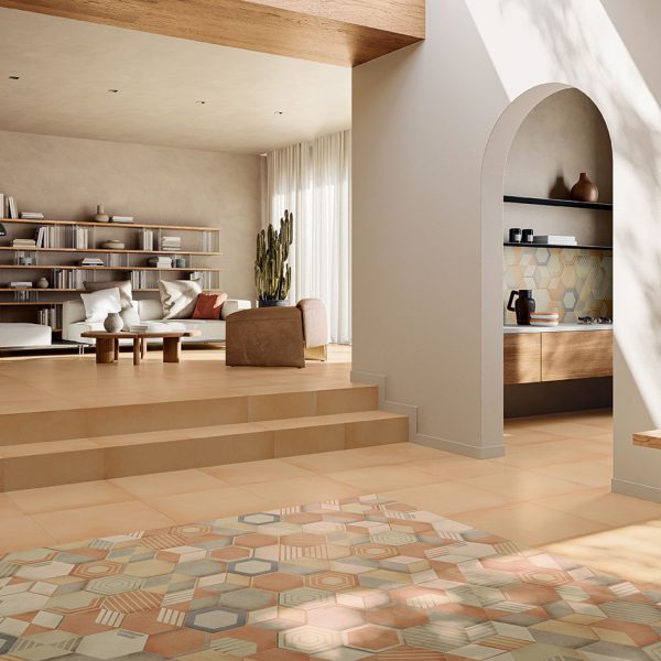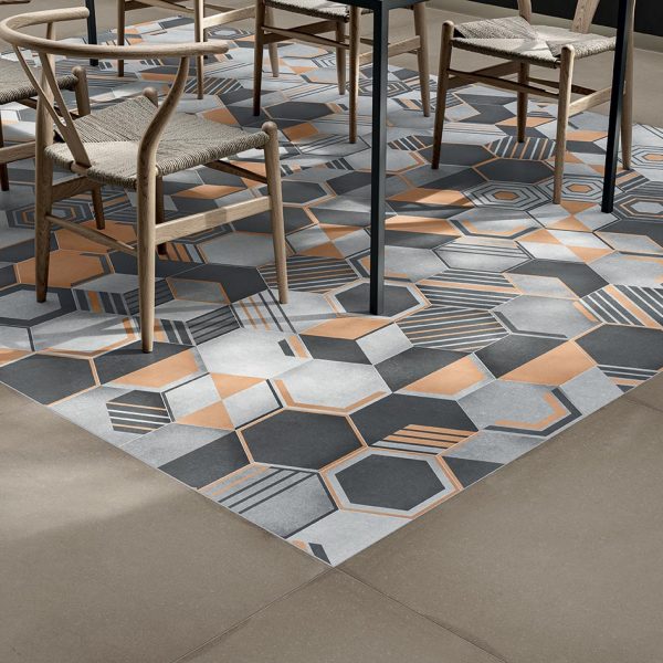 Popolare per essere il più antico materiale per piastrelle, le piastrelle esagonali effetto cotto aggiungeranno carattere alla stanza con il loro aspetto piuttosto rustico. Con il suo bel colore terracotta, questo tipo di piastrelle è molto popolare anche perché è molto facile da mantenere in quanto non richiede alcun trattamento speciale a differenza del cotto.