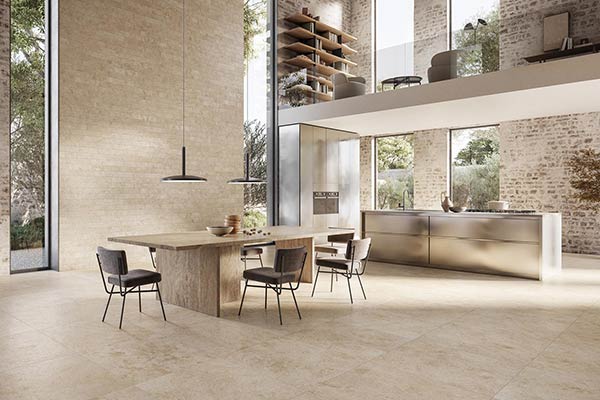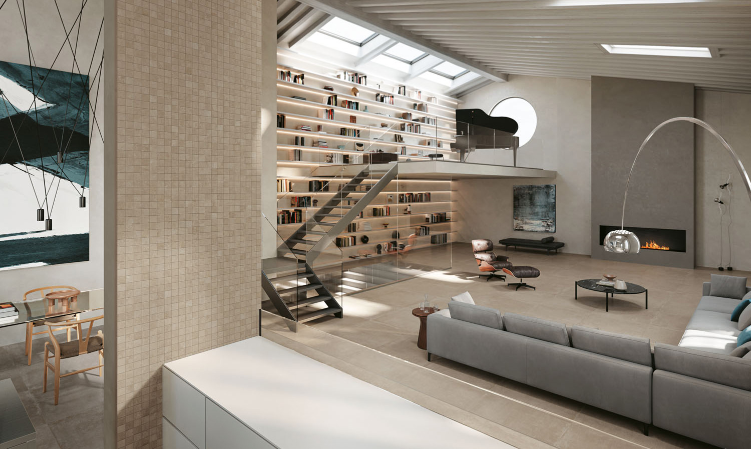 Il design del mosaico di piastrelle si può adattare anche alle altre stanze come il soggiorno e la sala da pranzo. In effetti, per quanto questo formato sia generalmente usato come decoro a rivestimento, il gres porcellanato resiste bene all’usura e, anche se posato a pavimento, l’aspetto delle piastrelle a mosaico non si deteriora.