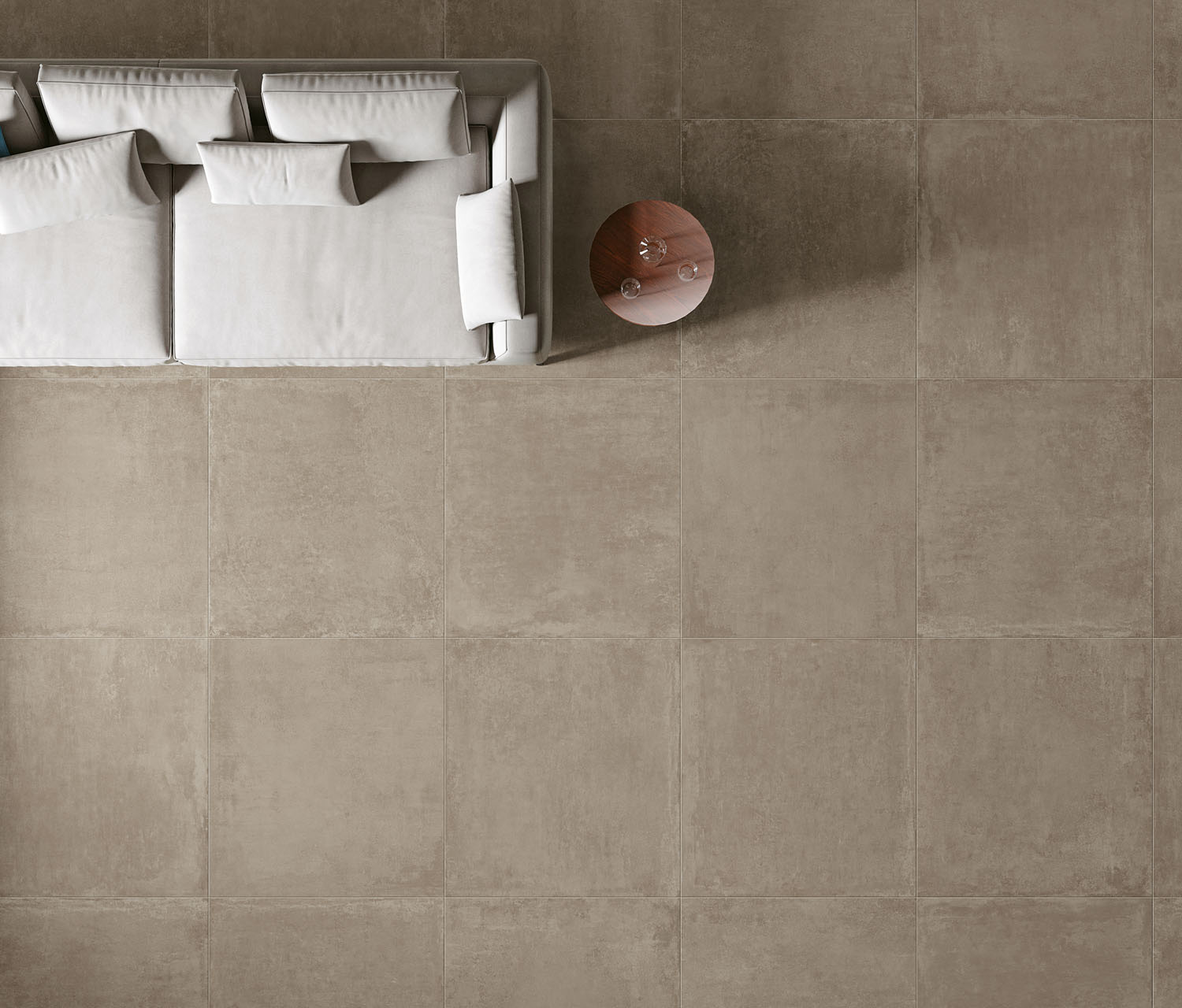 Il grande formato 90×90 è disponibile anche nell’effetto cemento, che in questo caso assume un aspetto piuttosto industriale. Ricorda perfettamente l’ambiente delle officine e dei loft, soprattutto perché la superficie delle piastrelle reca persino i segni lasciati dagli strumenti utilizzati per modellarle. Questa autenticità riflette lo spirito rilassato che abita i loft newyorkesi e che si sta facendo strada nei nostri appartamenti e nelle nostre case.