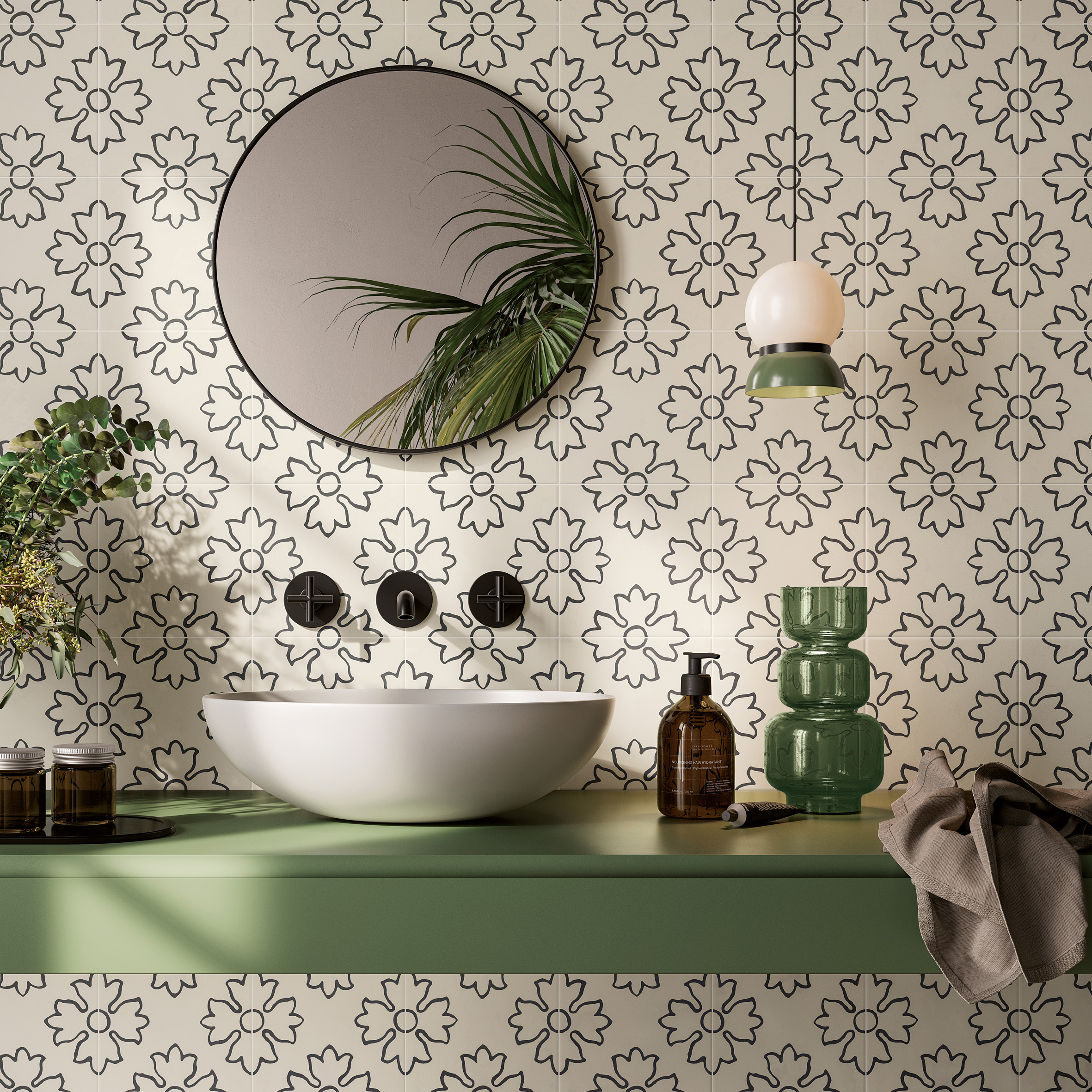 La collezione Bohème esplora la ricca storia delle cementine e trae ispirazione dai loro tradizionali motivi decorativi. Novoceram ha reinterpretato questo effetto in chiave moderna e ha capovolto la logica del loro processo di fabbricazione partendo dallo studio delle maschere in metallo utilizzate per realizzarle. Questo “effetto timbro” valorizza le linee di separazione, invece delle campiture colorate, facendole diventare protagoniste degli otto pattern di Bohème, così che l’imperfezione irregolare e artigianale nel disegno diventa una vera qualità estetica.