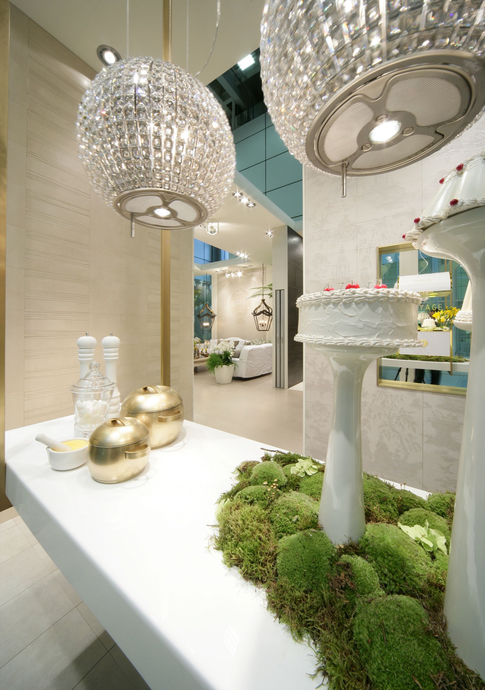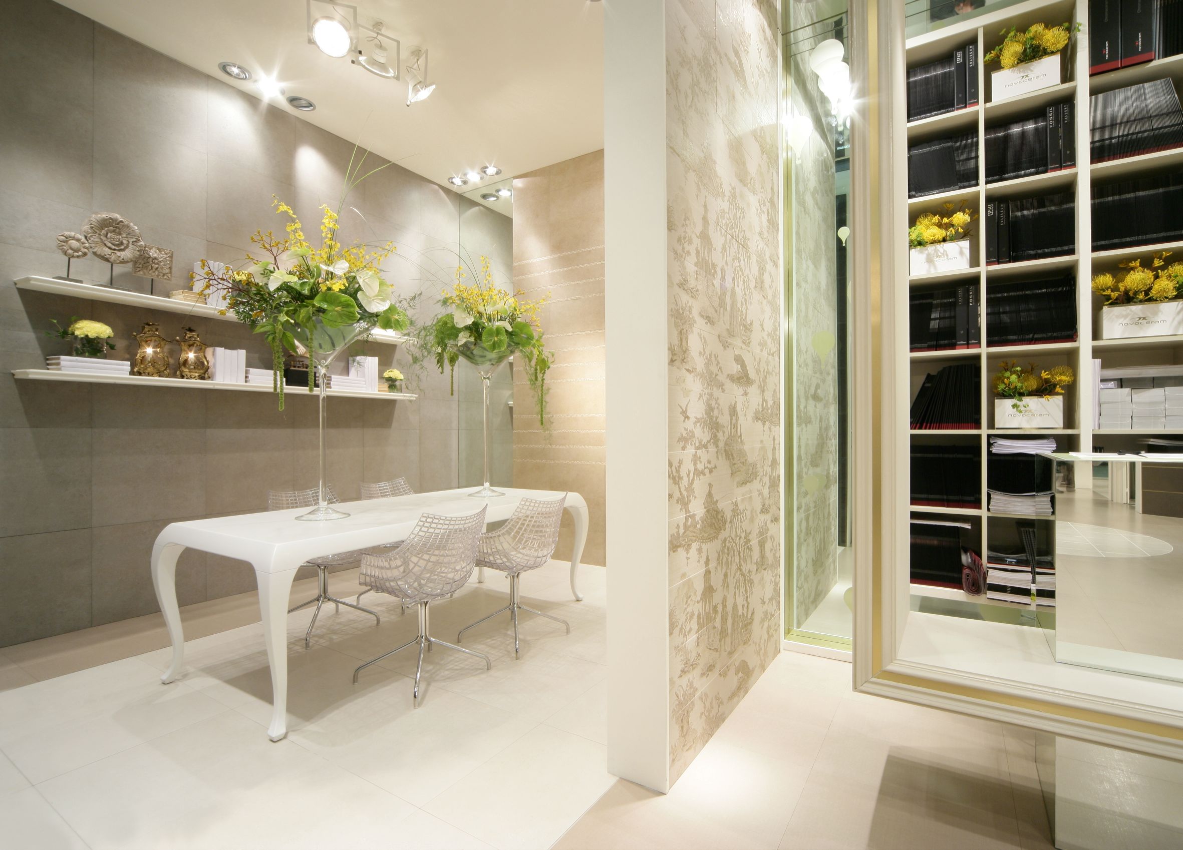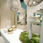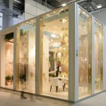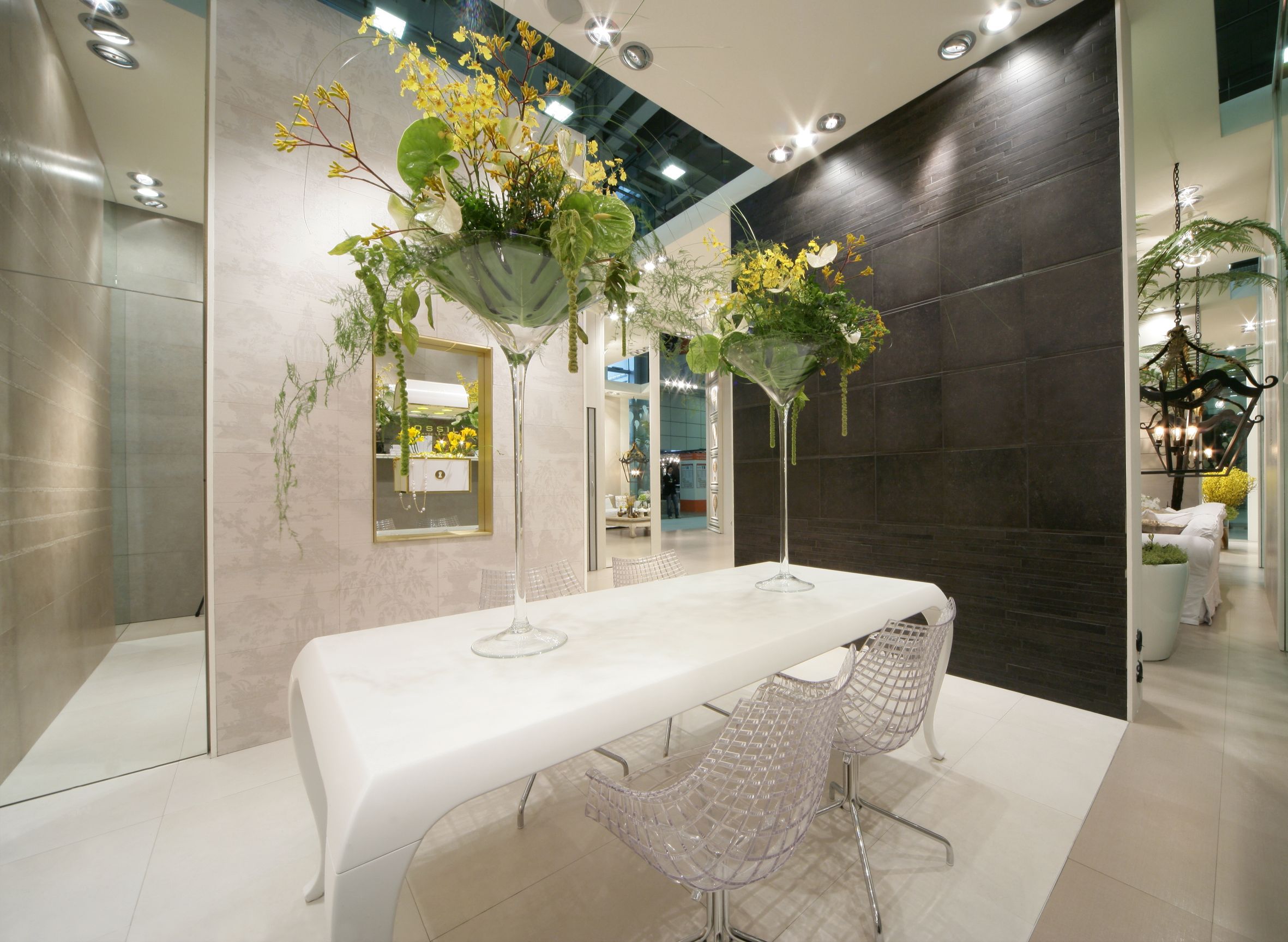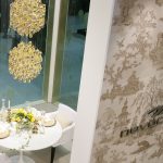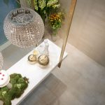 Il percorso dello stand si snoda attraverso una sequenza di ambienti luminosi e scintillanti affacciati su un grande living invaso di orchidee bianche dove Novoceram ha voluto evocare tutto il fascino dello stile francese con un allestimento audace e sontuoso che continua il percorso di scoperta dei diversi modi di abitare “à la française” iniziato con lo stand Coté Charme e proseguito con lo stand Jardin des Sens.