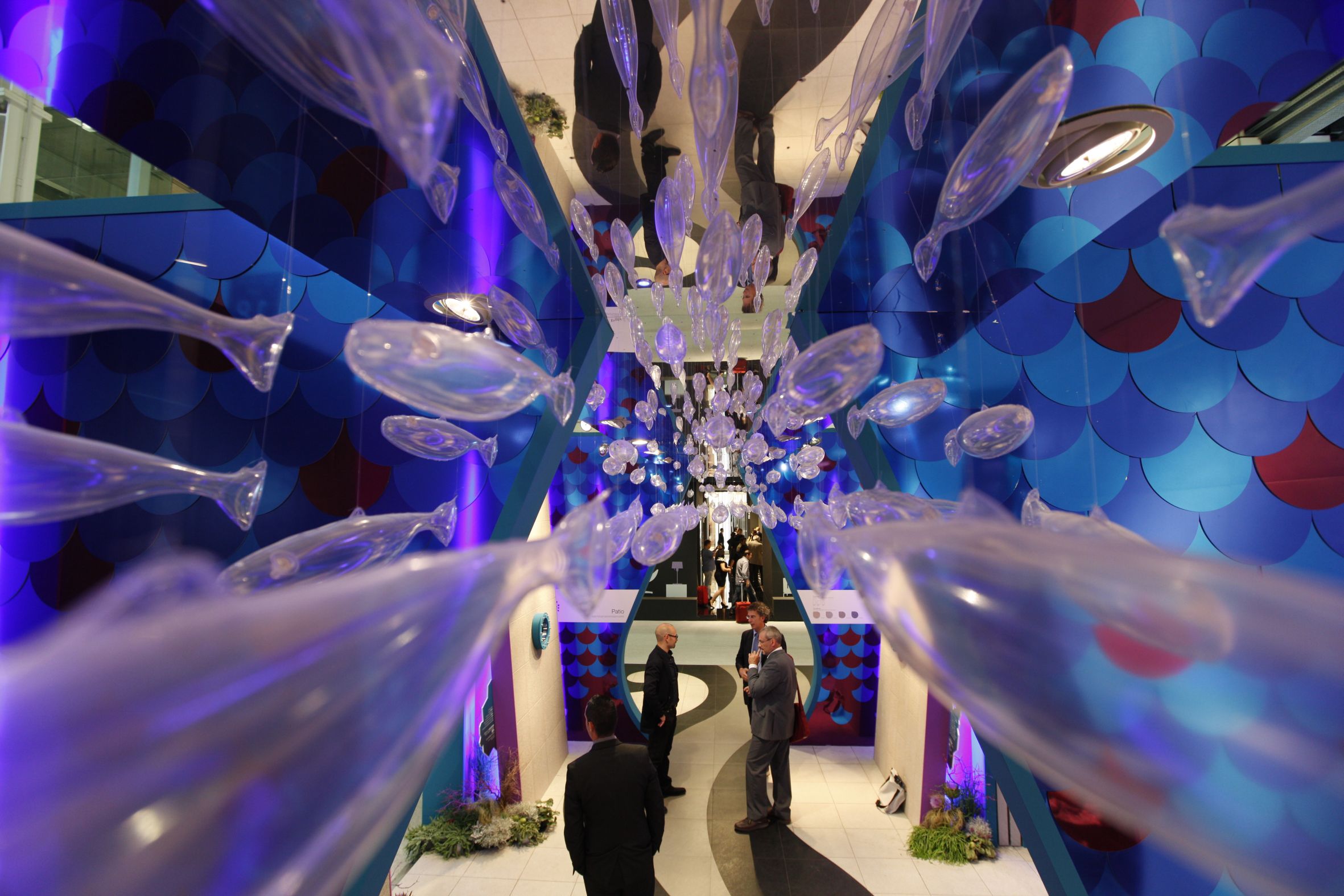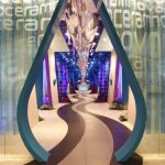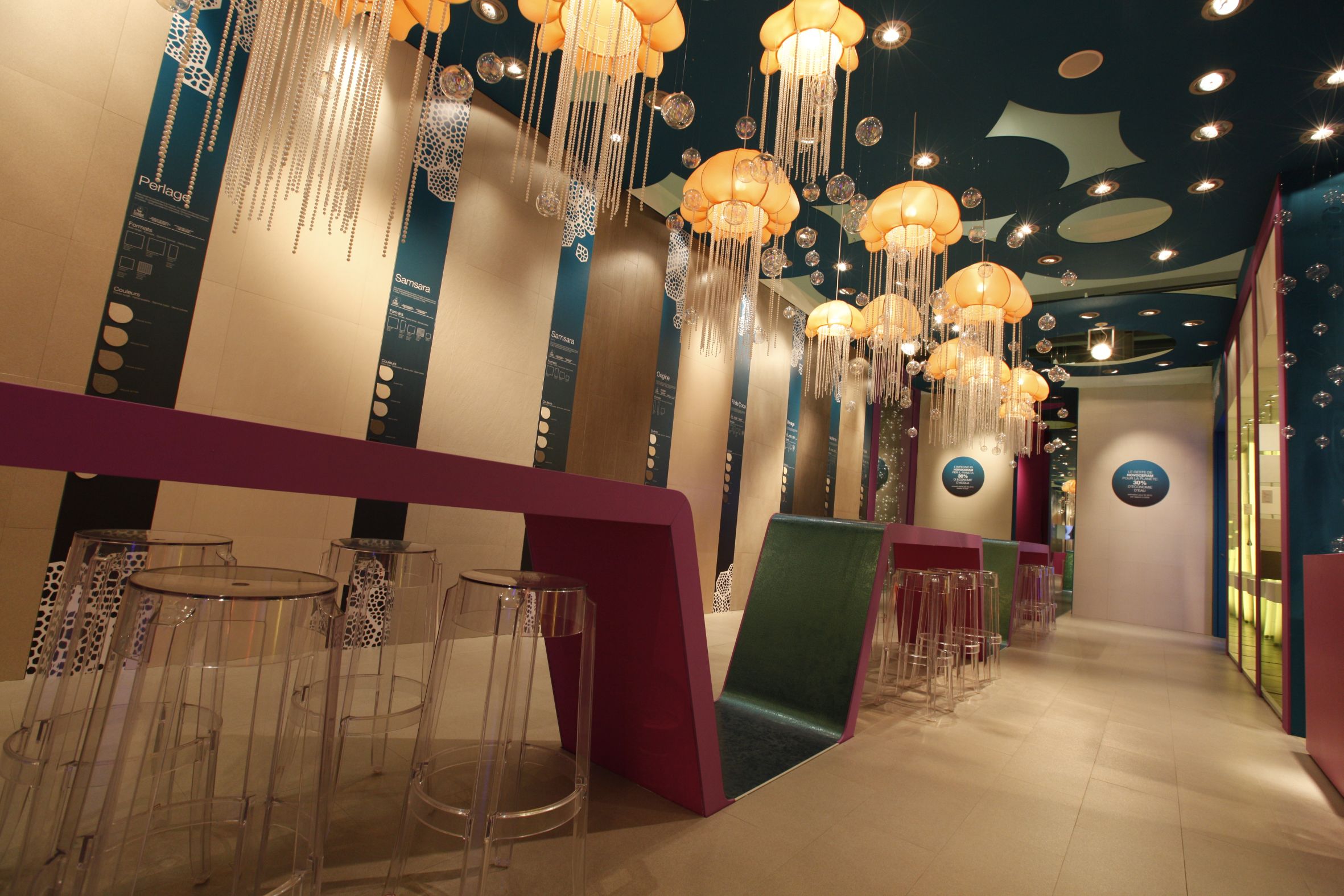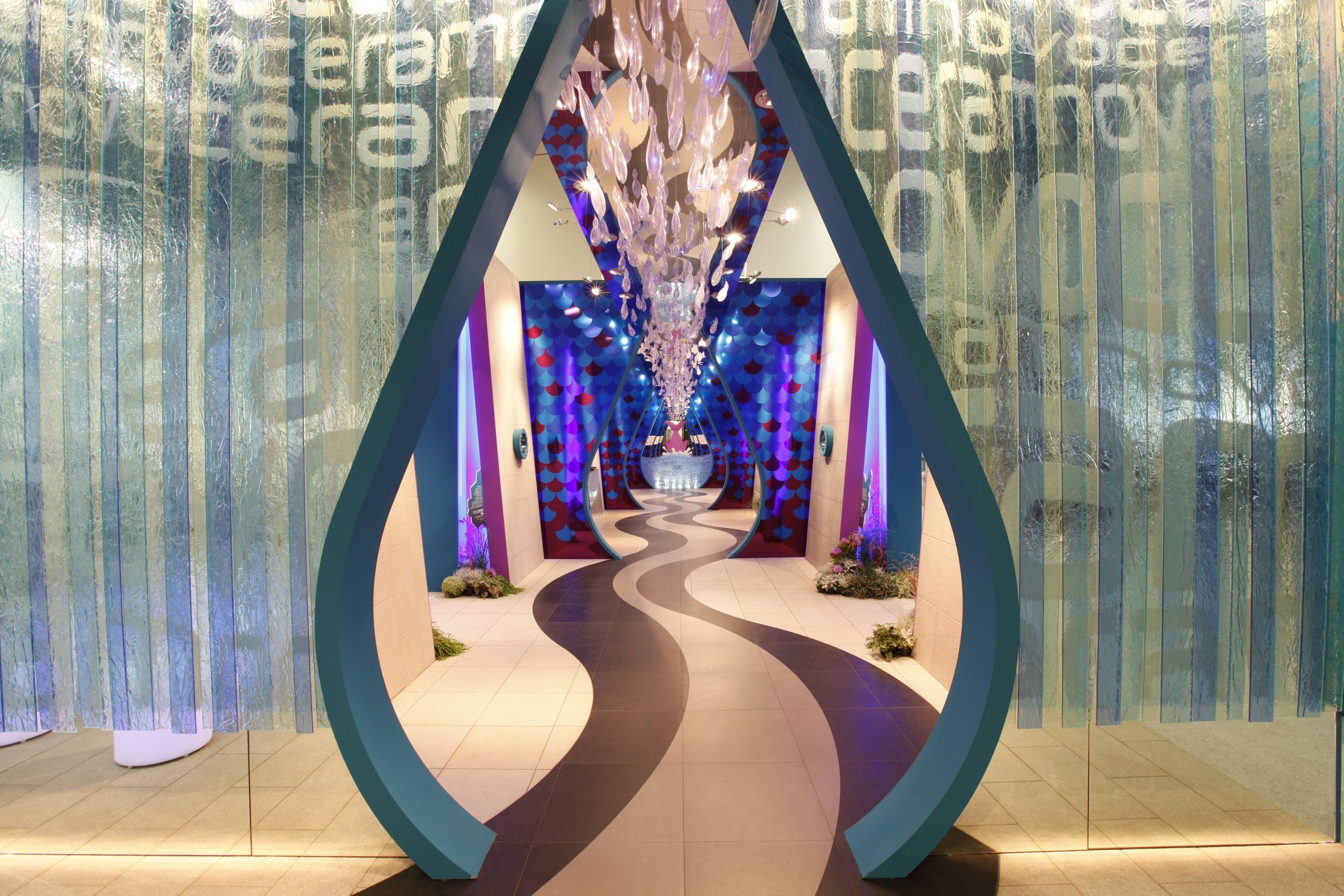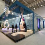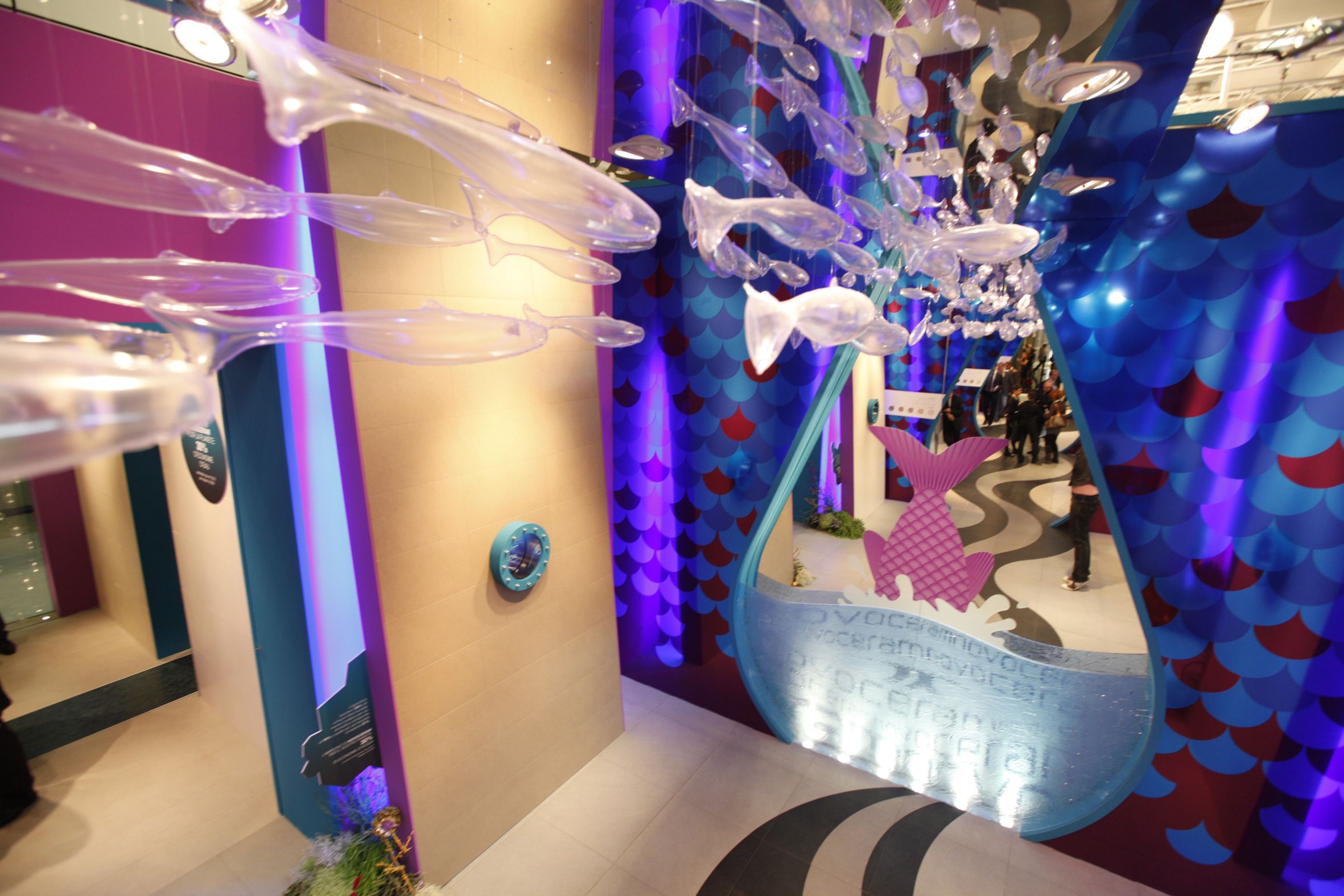Il messaggio ecologico si è coniugato alle sorprese fiabesche che contraddistinguono lo stile inconfondibile impresso dal designer alle scenografie della griffe francese: il dettaglio di un organismo acquatico ingrandito sulle pareti esterne annuncia il concept dello stand e invita i visitatori a trafiggere l’immenso muro di «acqua virtuale», sulla scia di un interminabile banco di pesci cristallini sospesi al soffitto. All’interno, la sorpresa di una atmosfera subacquea avvolge gli ospiti di “Ô“, ritmata dalle pareti coperte di squame metallizzate e animata da una colonia di meduse luminose.