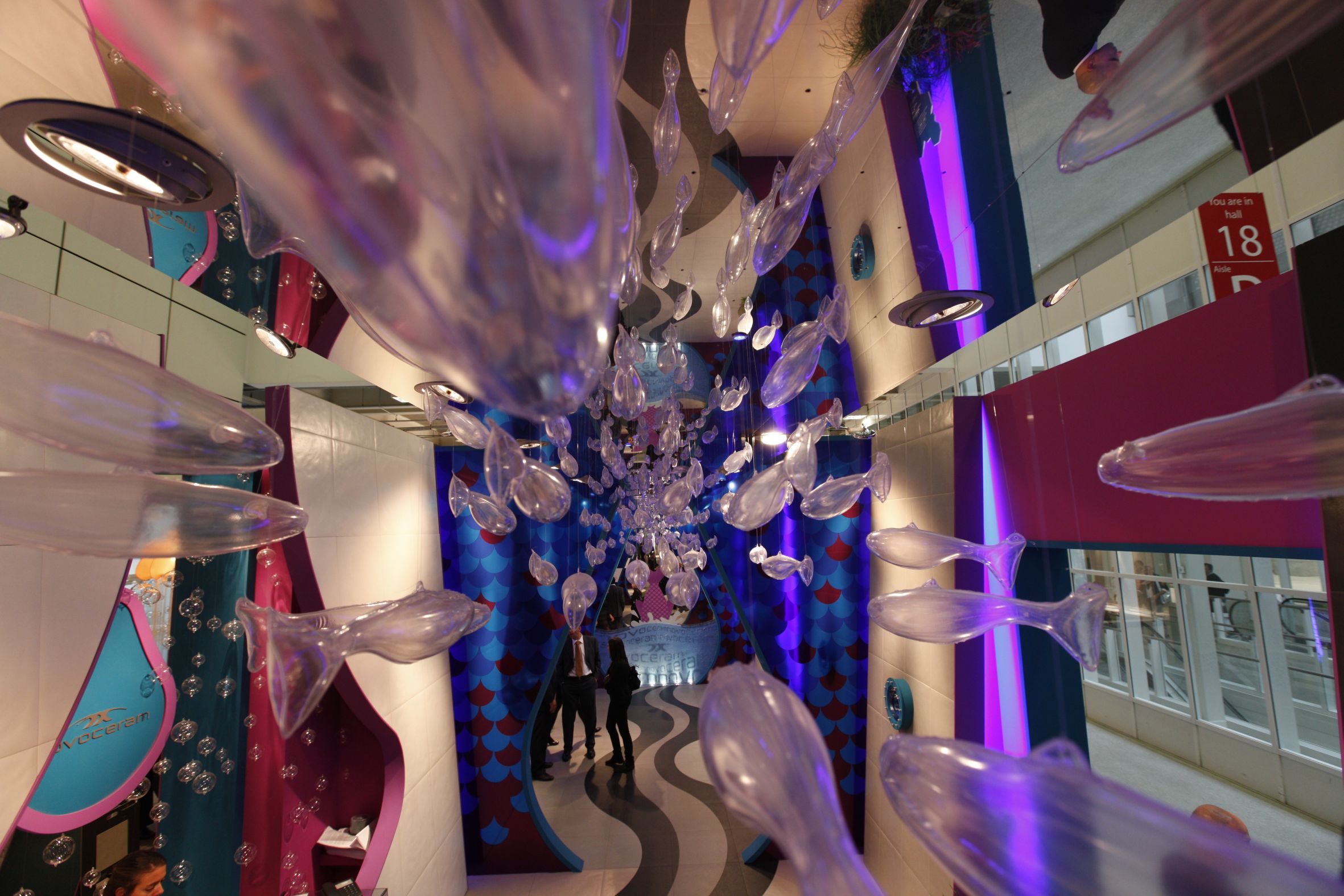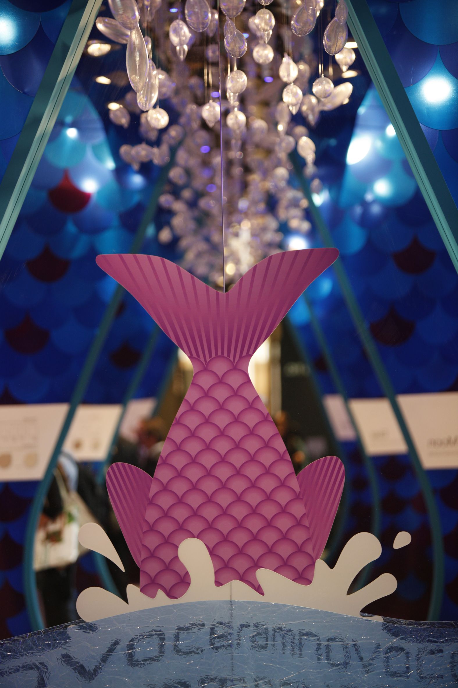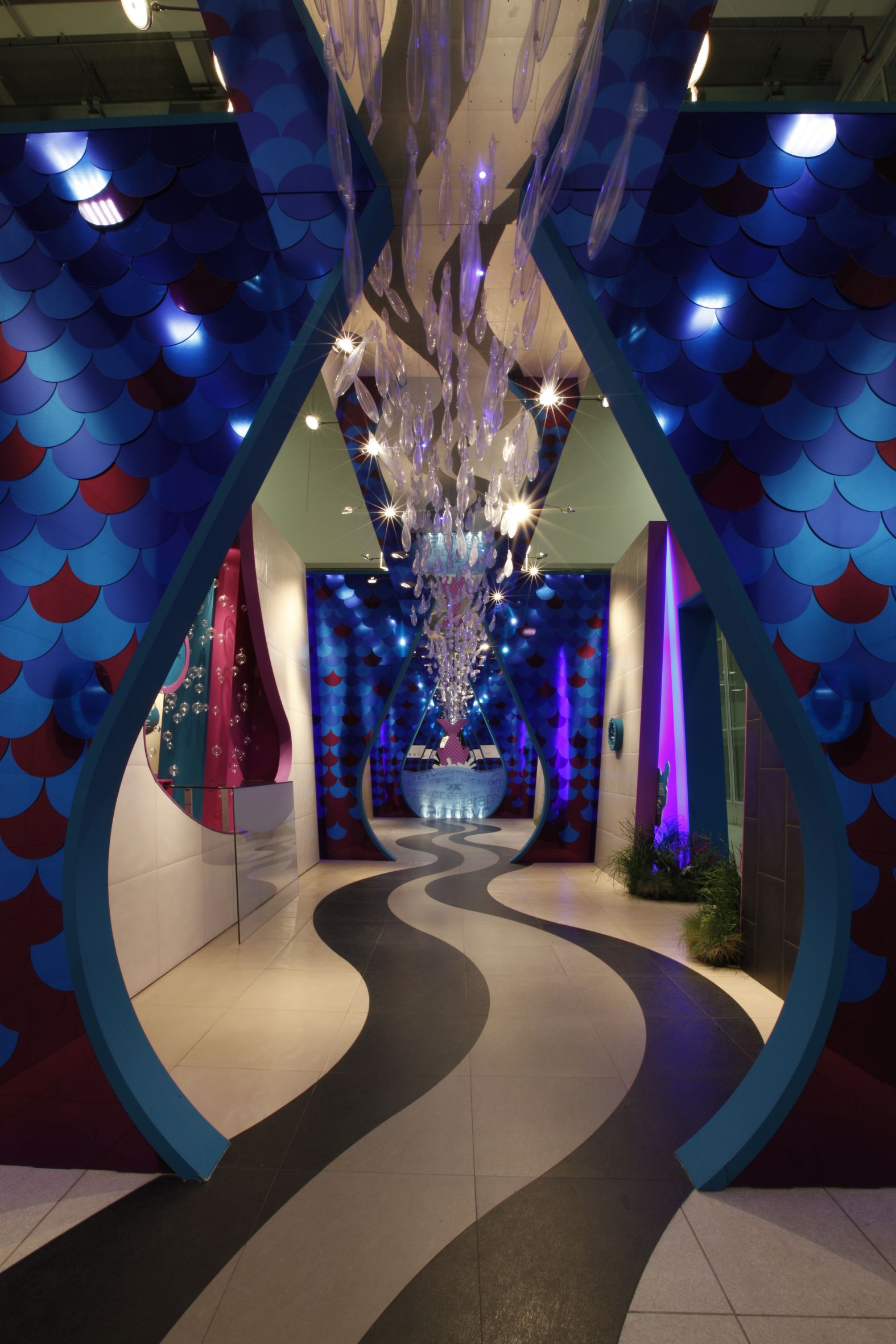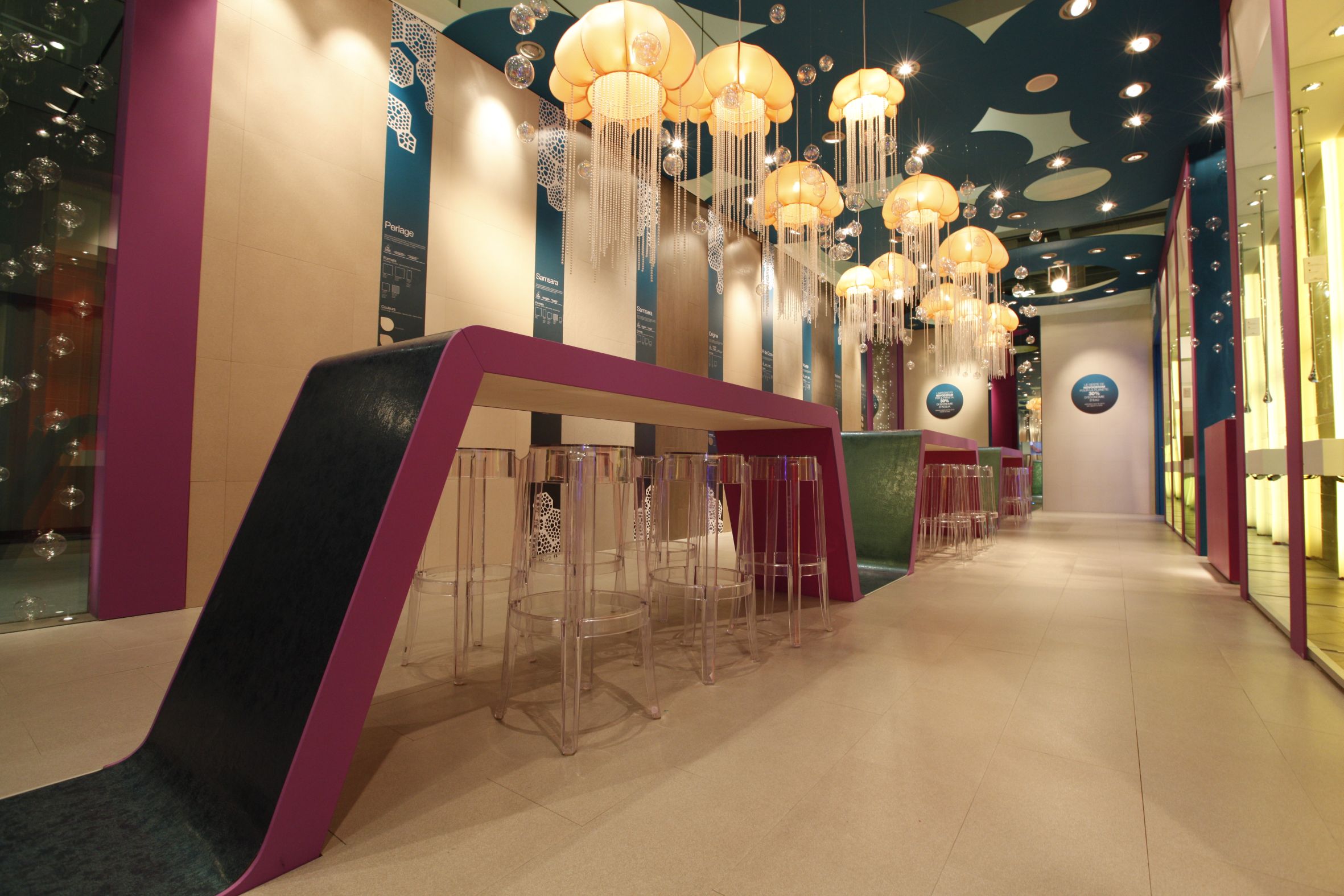 Il messaggio ecologico si è coniugato alle sorprese fiabesche che contraddistinguono lo stile inconfondibile impresso dal designer alle scenografie della griffe francese: il dettaglio di un organismo acquatico ingrandito sulle pareti esterne annuncia il concept dello stand e invita i visitatori a trafiggere l’immenso muro di «acqua virtuale», sulla scia di un interminabile banco di pesci cristallini sospesi al soffitto. All’interno, la sorpresa di una atmosfera subacquea avvolge gli ospiti di “Ô“, ritmata dalle pareti coperte di squame metallizzate e animata da una colonia di meduse luminose.