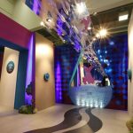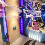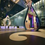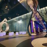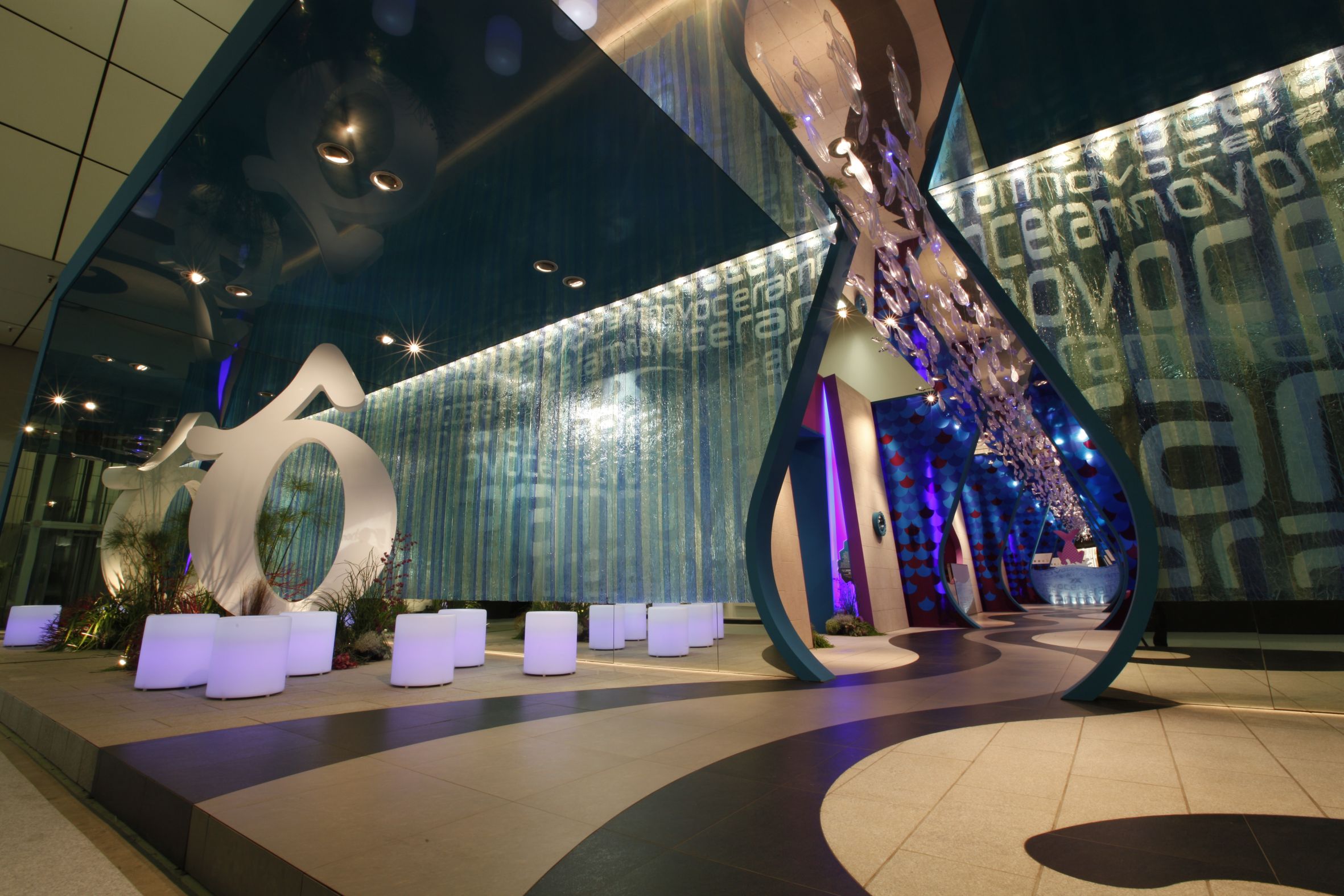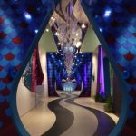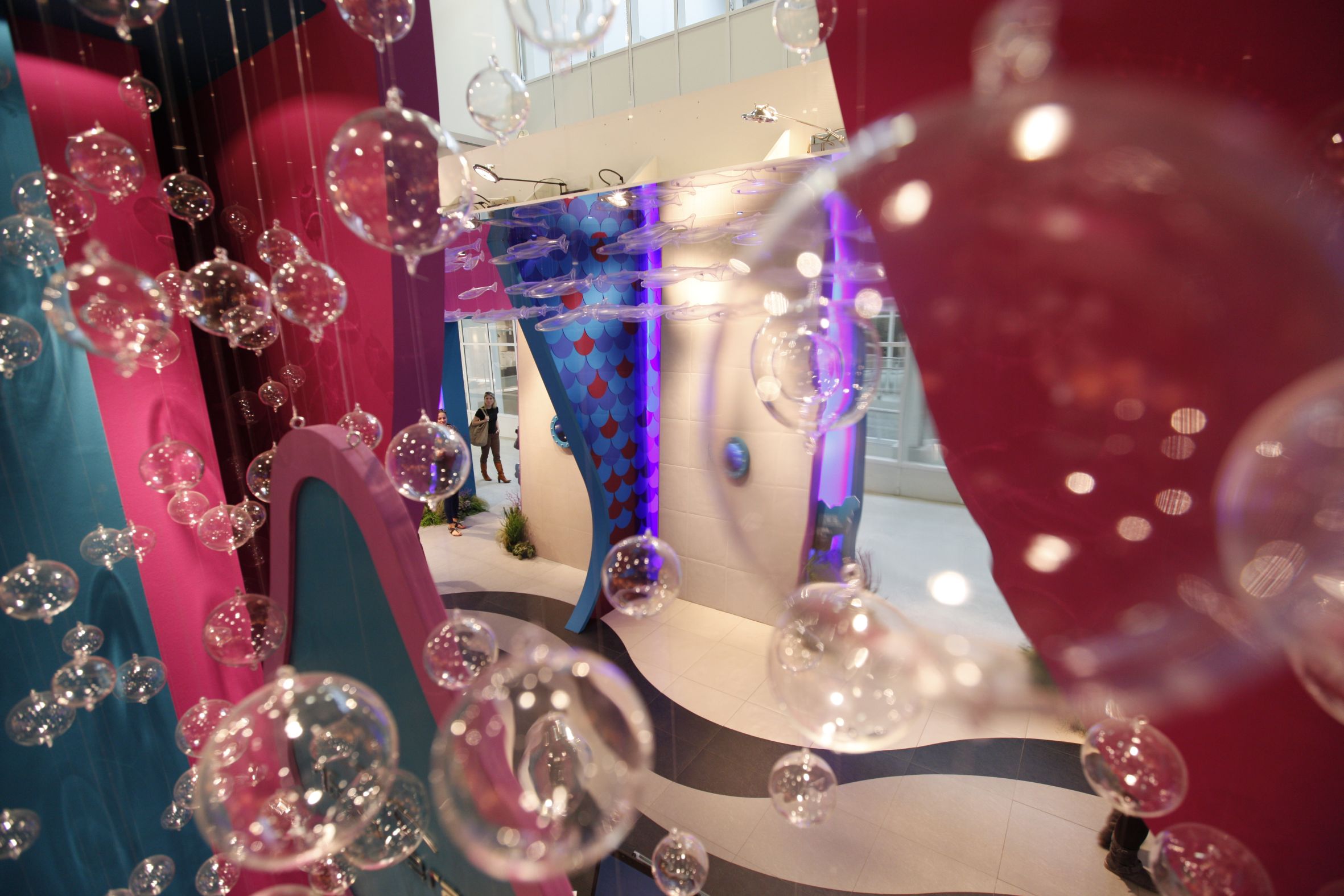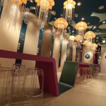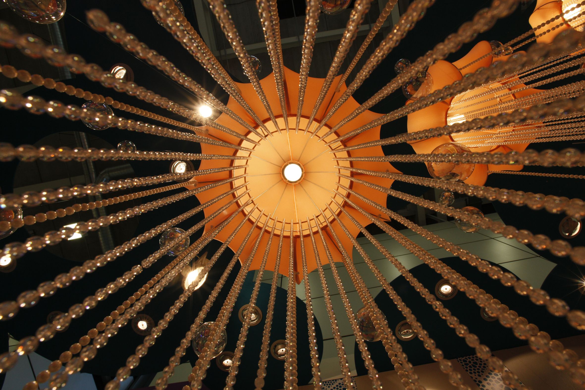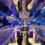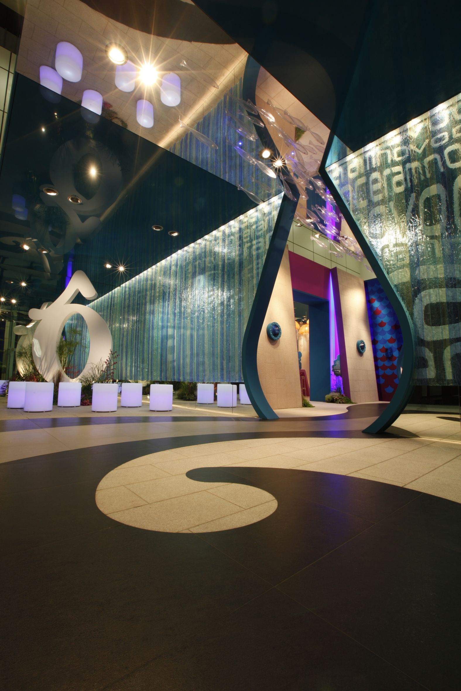 Il messaggio ecologico si è coniugato alle sorprese fiabesche che contraddistinguono lo stile inconfondibile impresso dal designer alle scenografie della griffe francese: il dettaglio di un organismo acquatico ingrandito sulle pareti esterne annuncia il concept dello stand e invita i visitatori a trafiggere l’immenso muro di «acqua virtuale», sulla scia di un interminabile banco di pesci cristallini sospesi al soffitto. All’interno, la sorpresa di una atmosfera subacquea avvolge gli ospiti di “Ô“, ritmata dalle pareti coperte di squame metallizzate e animata da una colonia di meduse luminose.