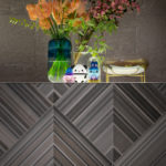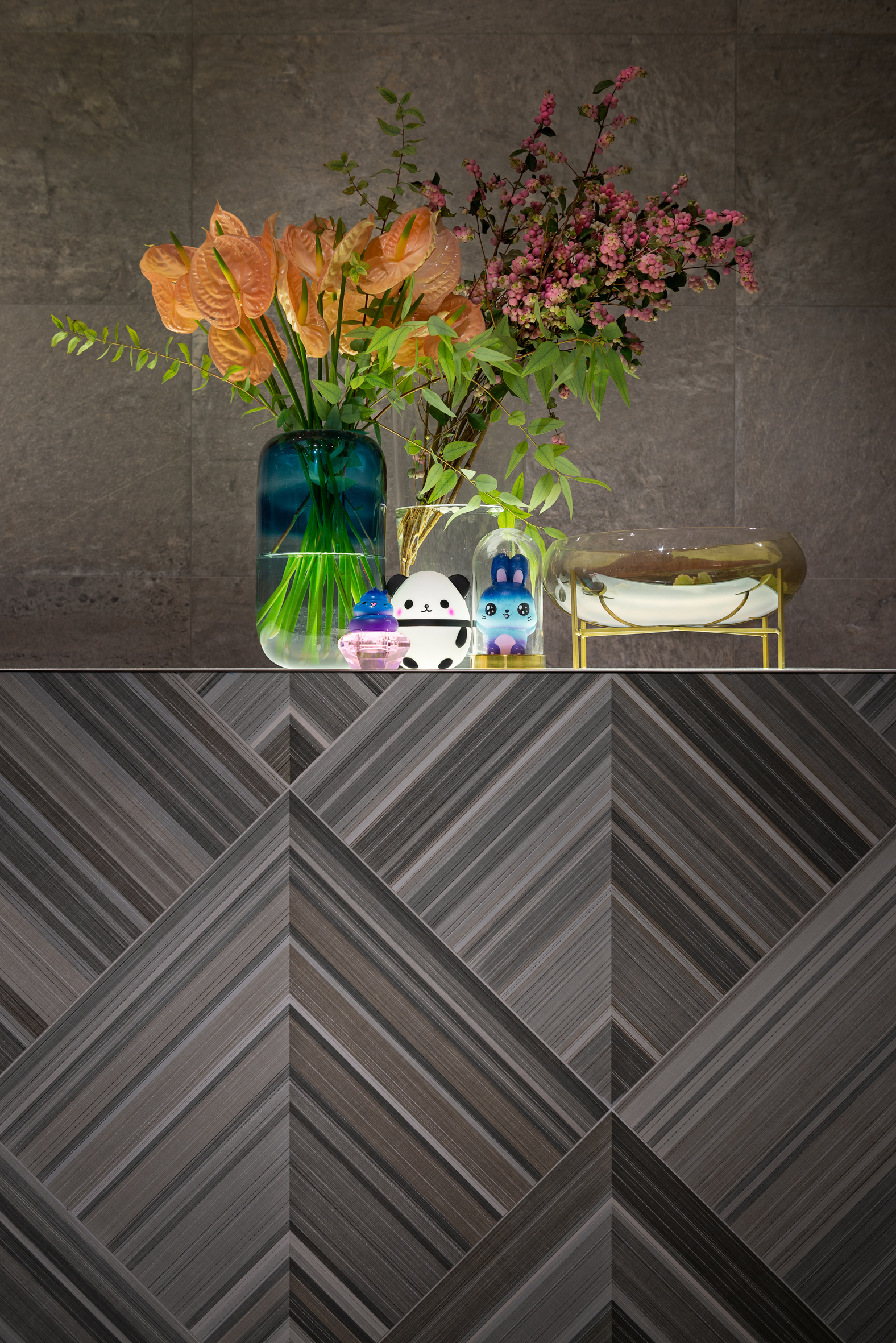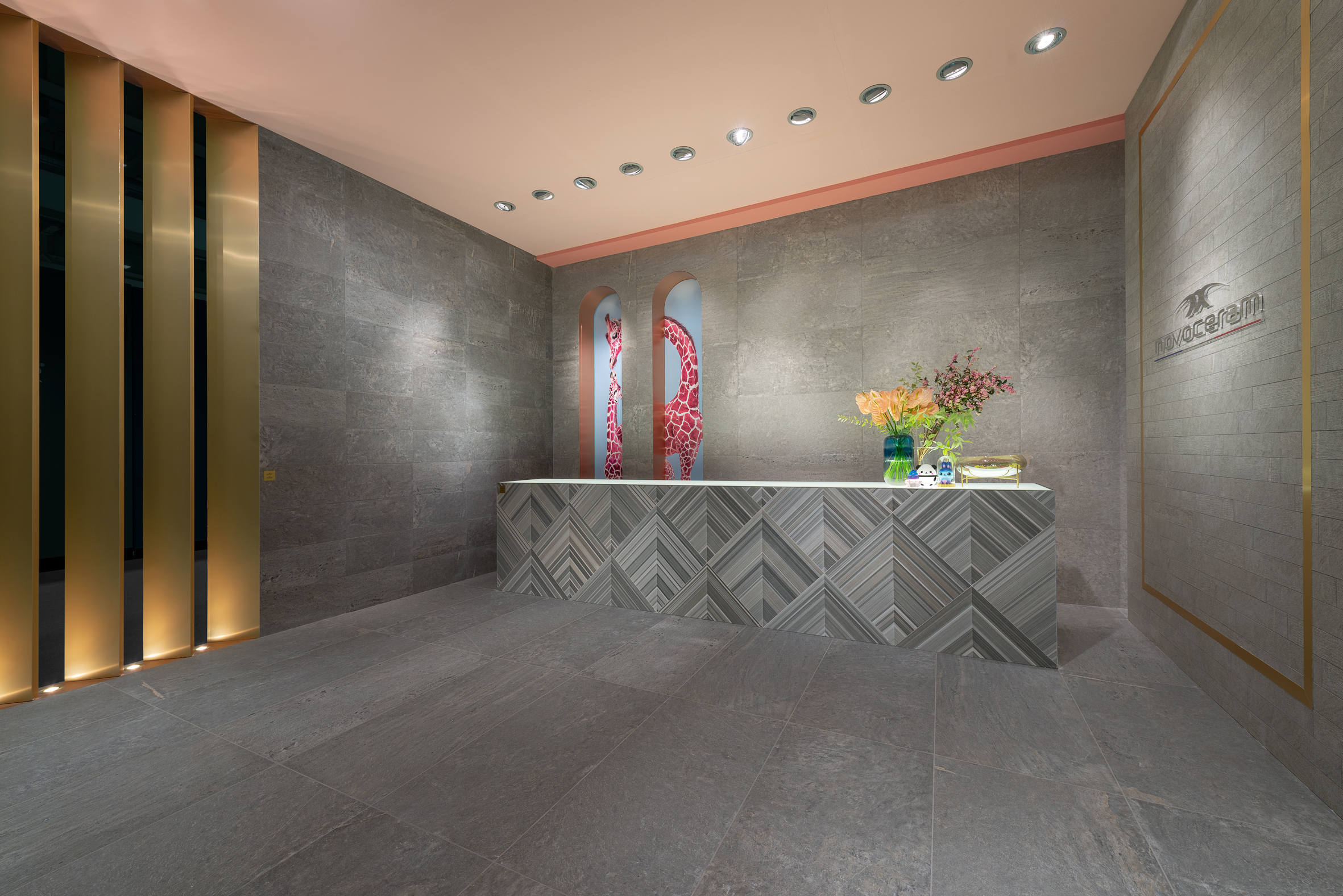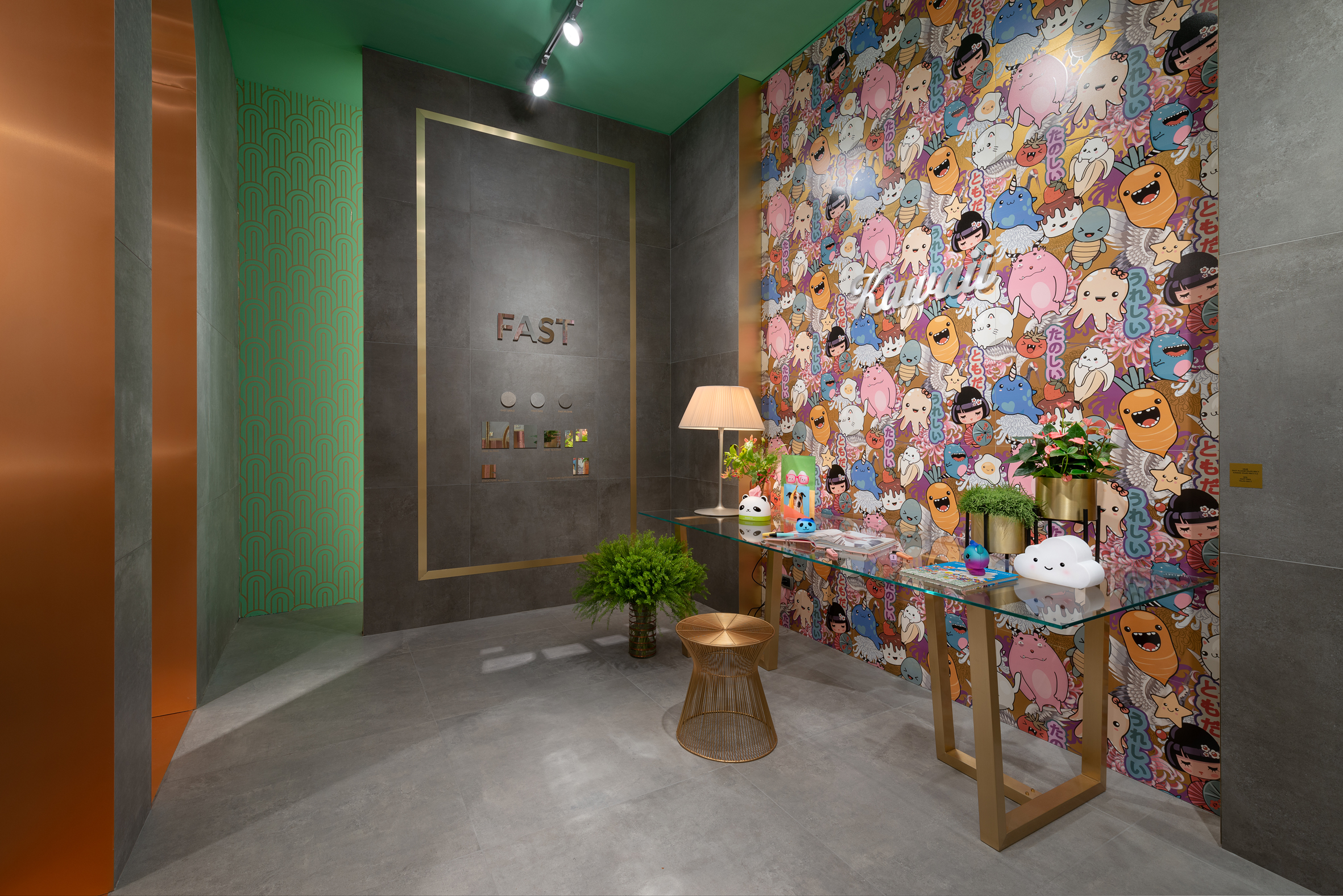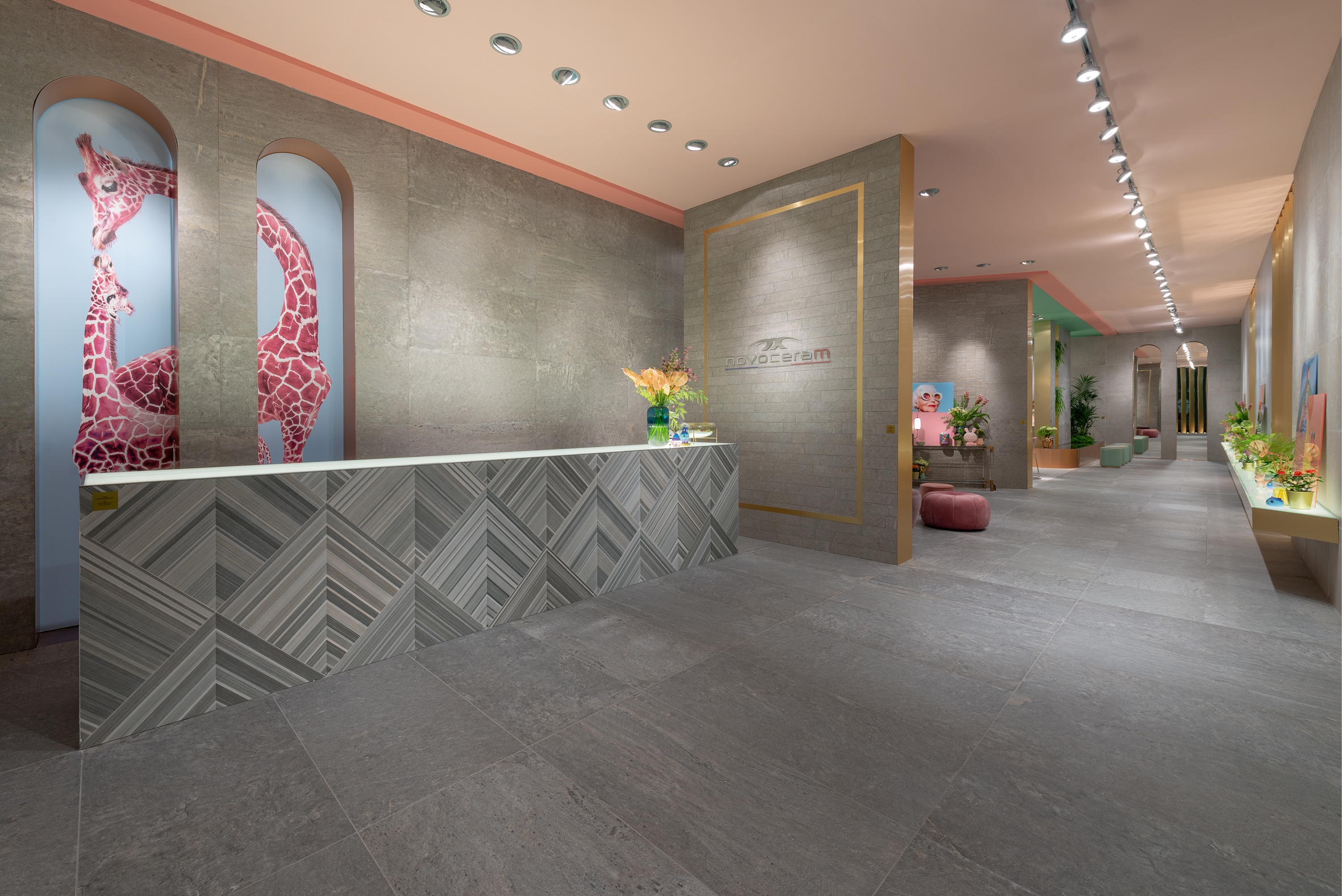 Già dalla reception, lo stile geometrico della collezione Dilemme, ceramica per pavimenti e rivestimenti, si esprime nella tridimensionalità delle linee che ricordano le sete Shantung. Il salone, luogo ideale per le chiacchiere, è rivestito di Tiber, una novità che riproduce fedelmente il travertino, una delle pietre più utilizzate nell’architettura romana. Nell’ufficio, l’inattesa collezione Kawaii si svela, un modo per Novoceram per esprimere la sua originalità. Kawaii è ispirata alla omonima estetica nipponica frizzante e piena di ironia degli ani ’70.