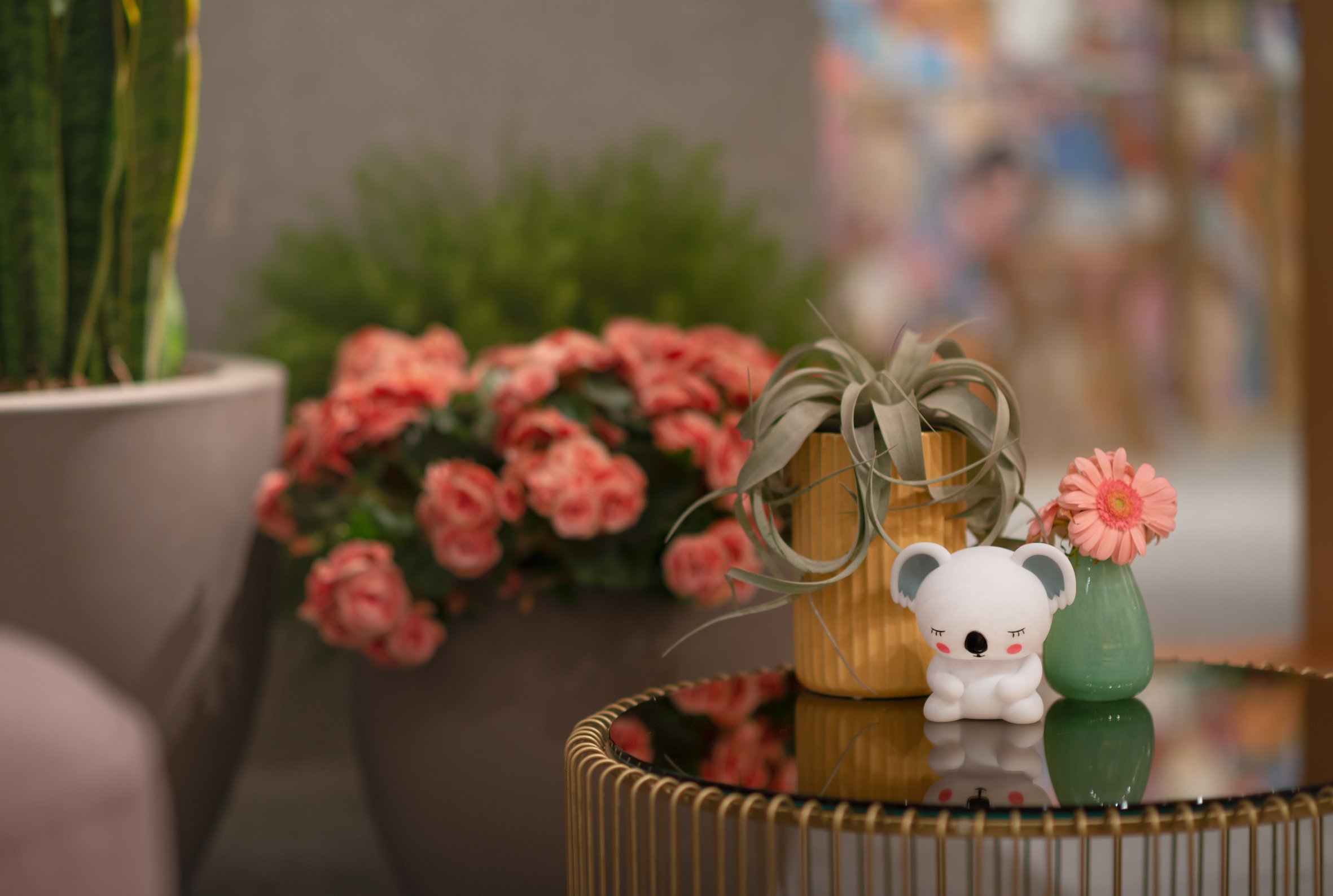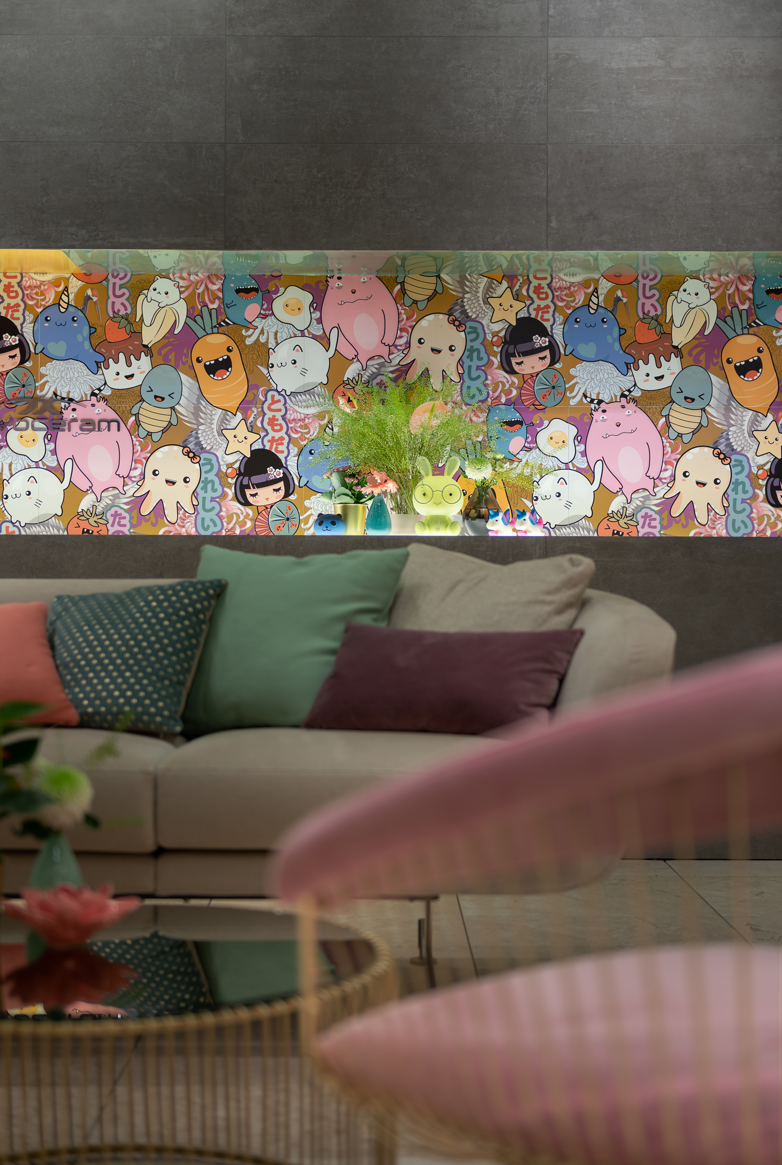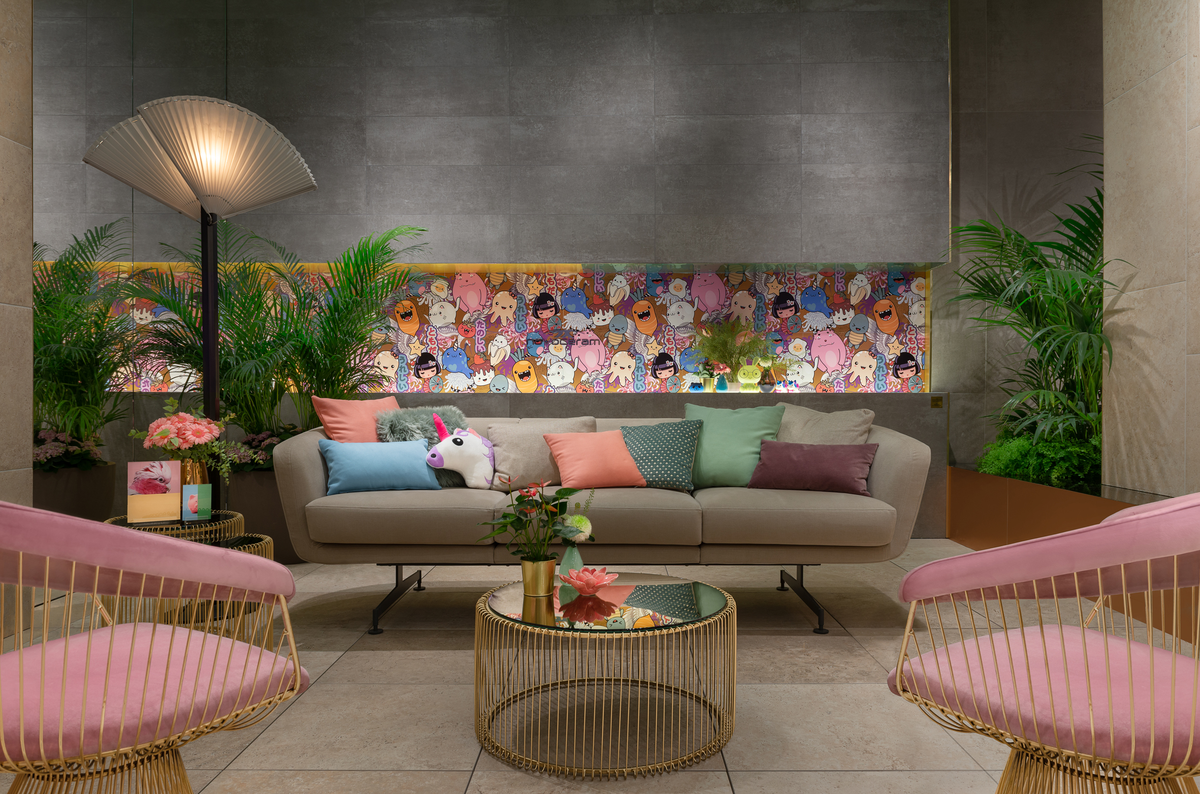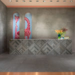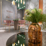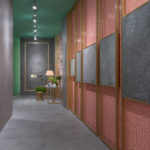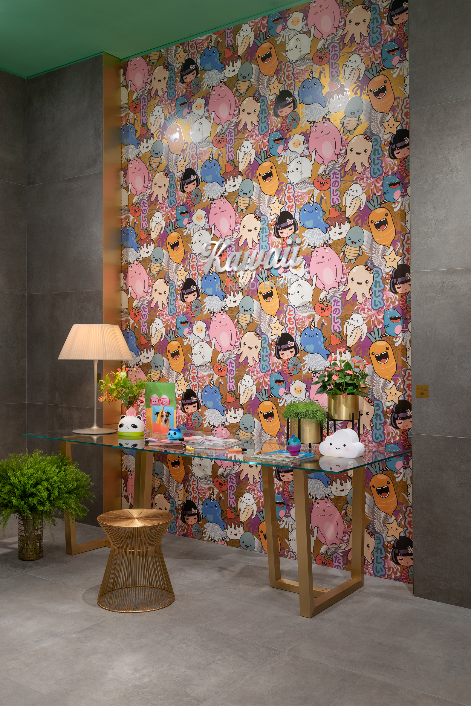 Già dalla reception, lo stile geometrico della collezione Dilemme, ceramica per pavimenti e rivestimenti, si esprime nella tridimensionalità delle linee che ricordano le sete Shantung. Il salone, luogo ideale per le chiacchiere, è rivestito di Tiber, una novità che riproduce fedelmente il travertino, una delle pietre più utilizzate nell’architettura romana. Nell’ufficio, l’inattesa collezione Kawaii si svela, un modo per Novoceram per esprimere la sua originalità. Kawaii è ispirata alla omonima estetica nipponica frizzante e piena di ironia degli ani ’70.