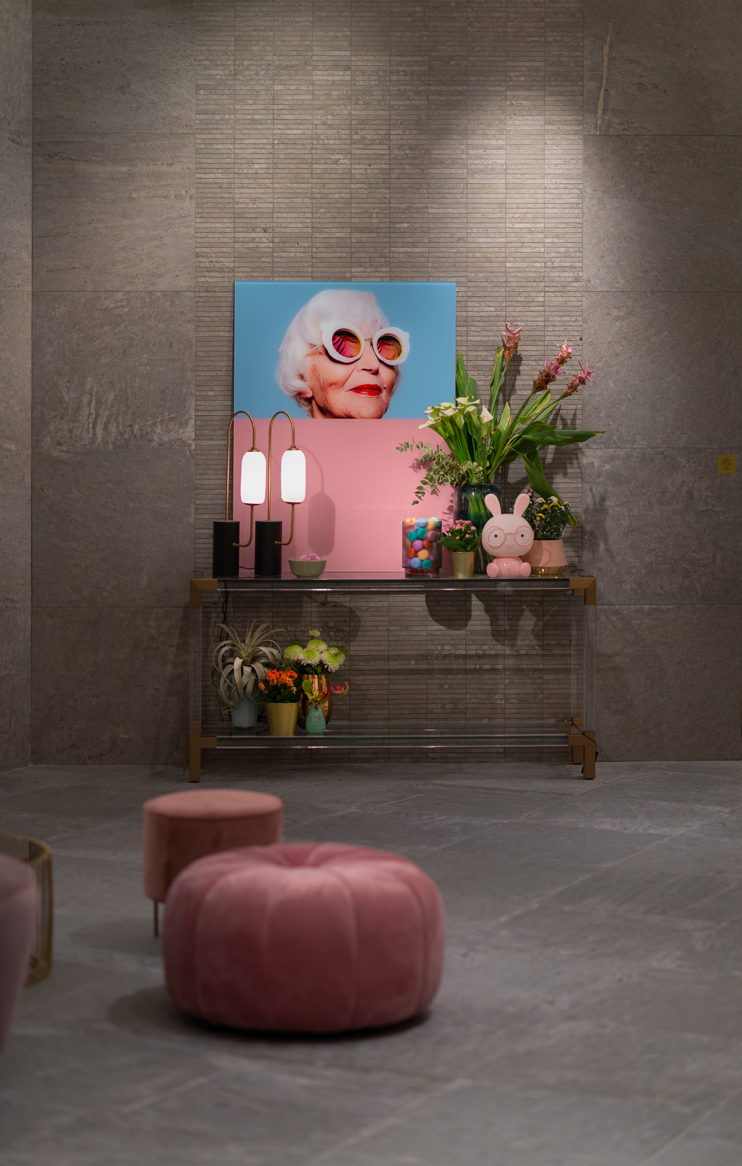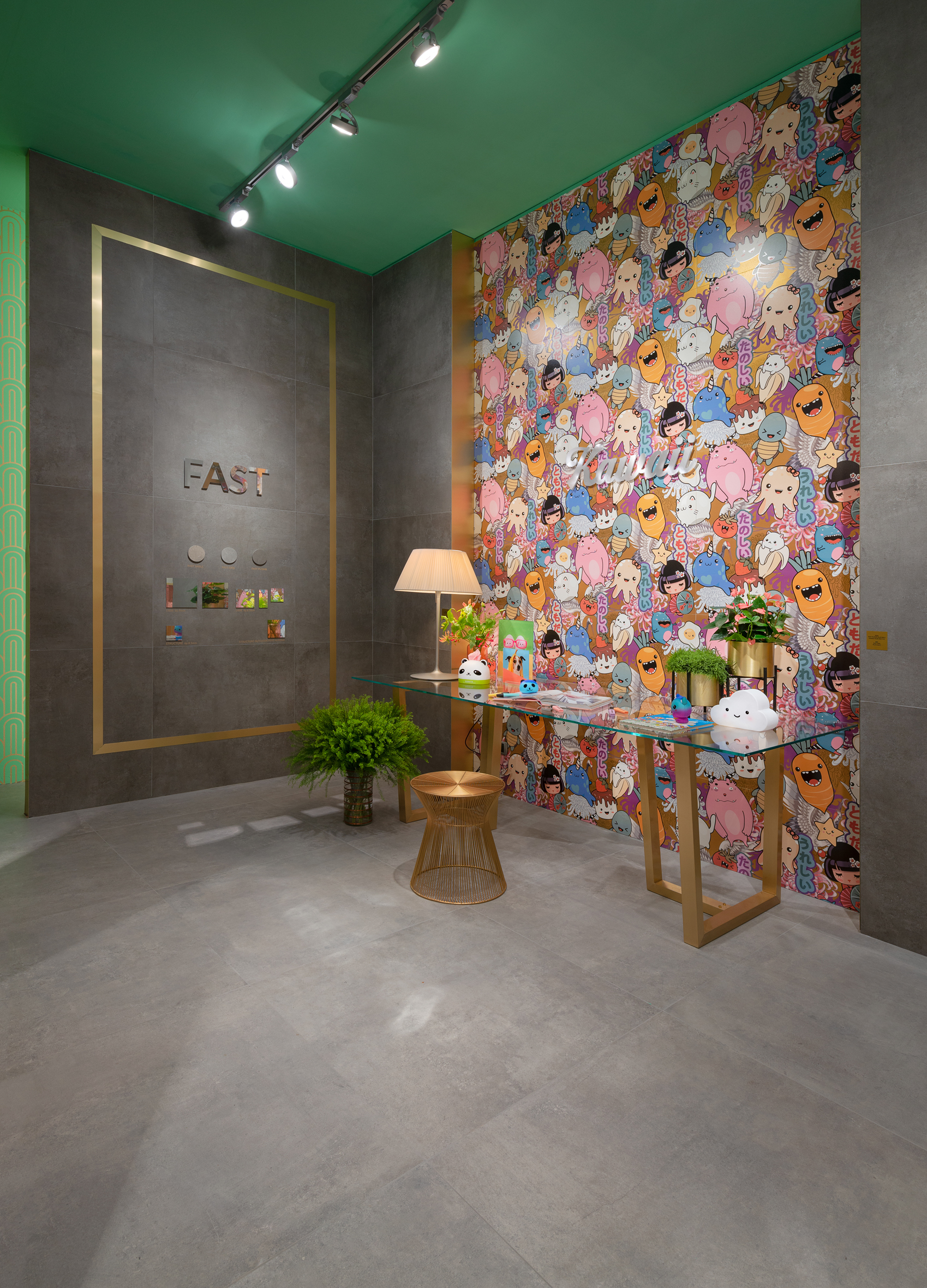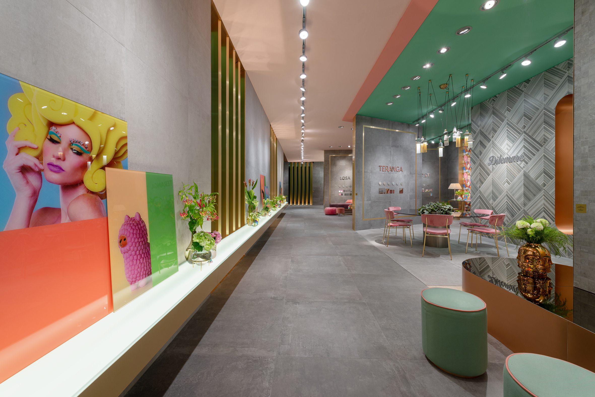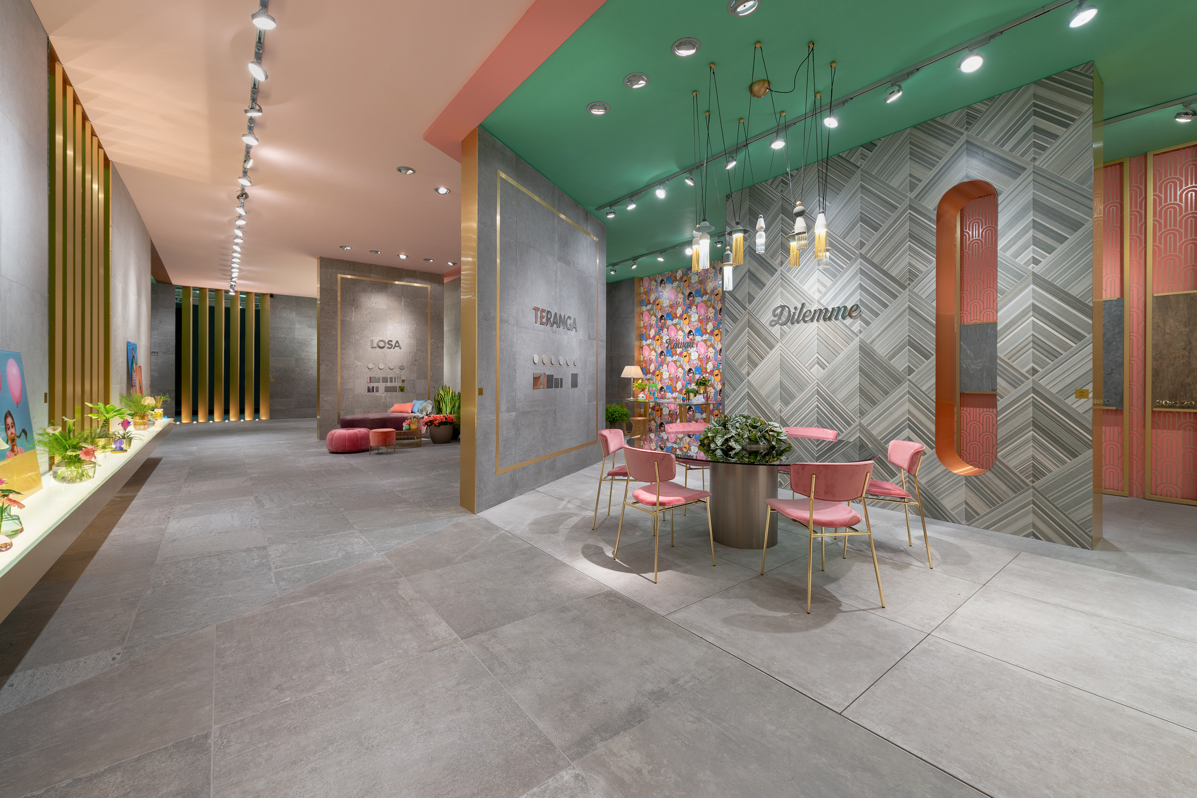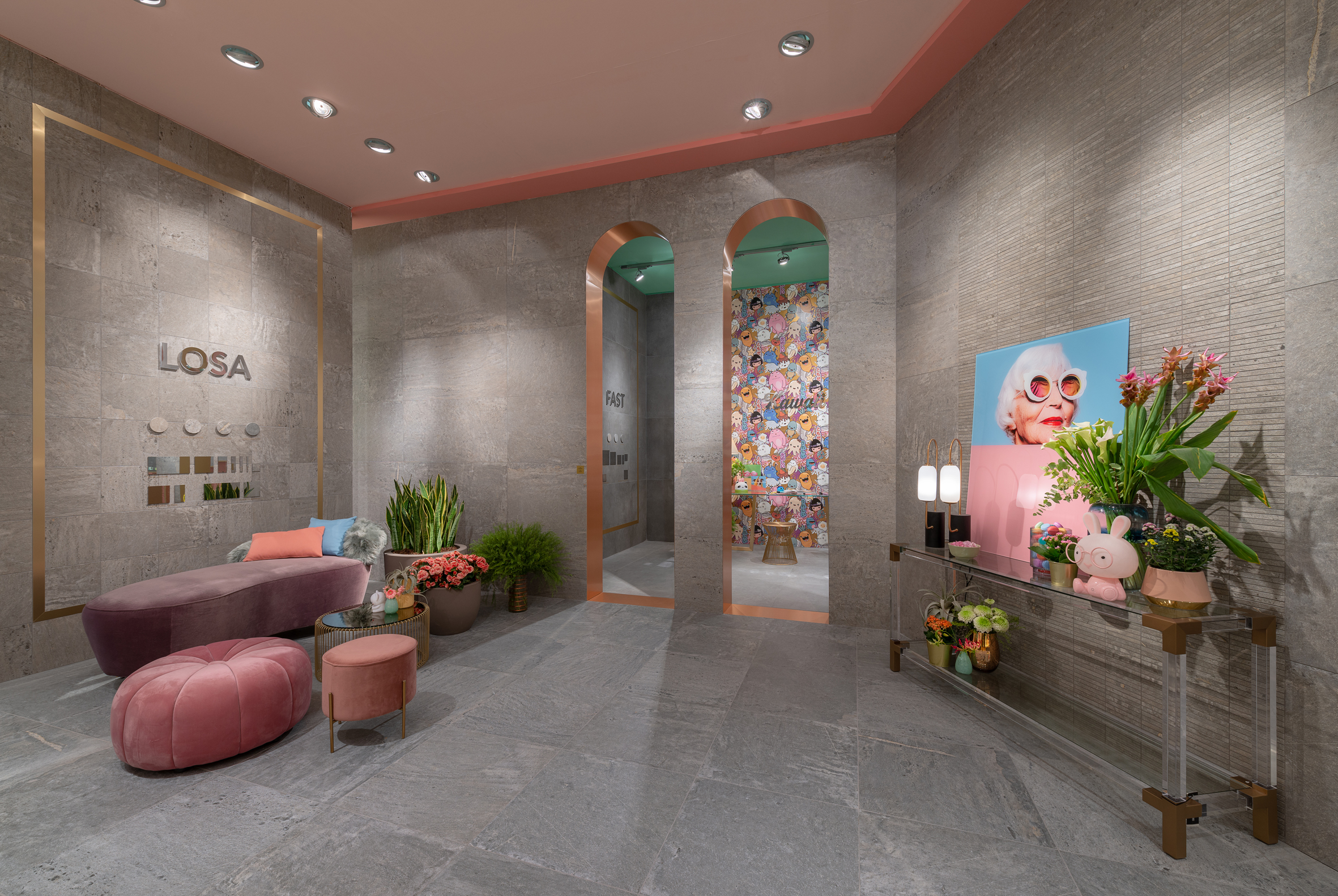 Una collezione di quadri ironici e irriverenti si appoggia e contrasta con le collezioni Teranga e Losa. Teranga è una collezione ceramica effetto cemento piena di dettagli e screpolature, declinata in 6 colori e nel nuovo formato 90×90 cm e 80×80 cm. Infine la colezione Losa, una gramma ricca per l’interno e l’esterno declinata in numerosi formati dal 5×60 al 120×120. Questa ceramica dall’effetto molto naturale riproduce fedelmente la Losa (pietra omonima a cui è ispirata).