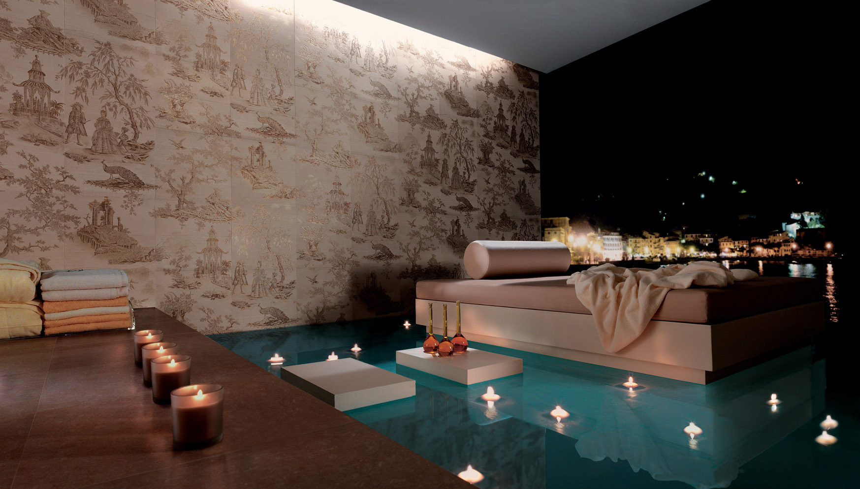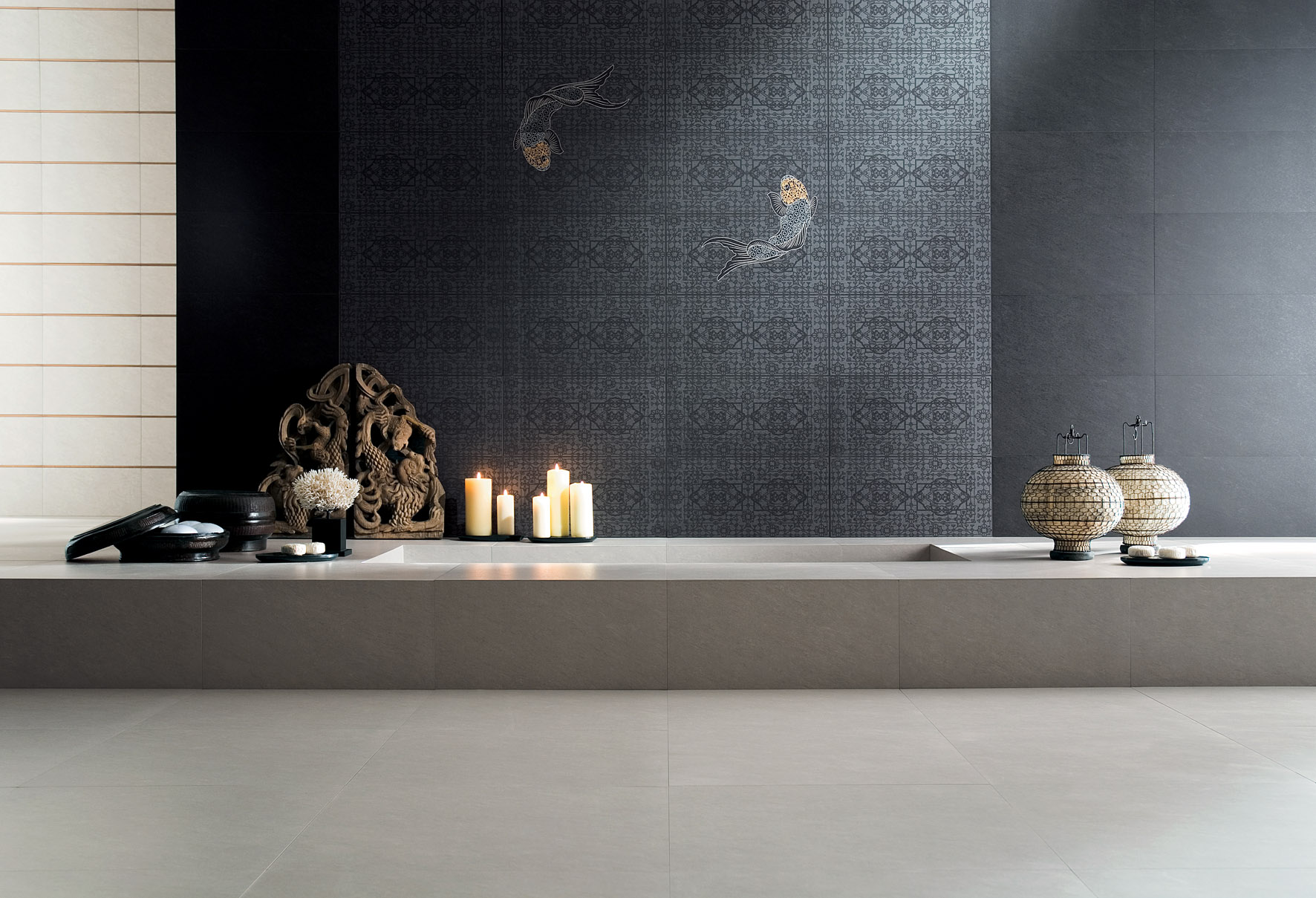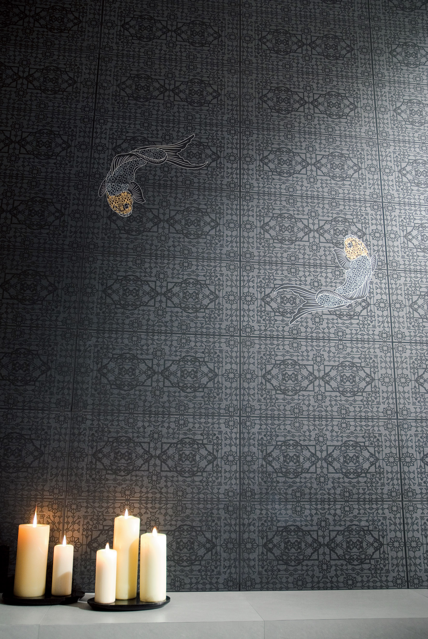 Le Piastrelle Effetto Carta da Parati di Novoceram uniscono l’eleganza intramontabile della tappezzeria ai vantaggi tecnici della Ceramica. Florilège rievoca il fascino dei motivi orientali tipici della tappezzeria del XVIIesimo secolo ed è una composizione di piastrelle di formato 135x180cm a pasta bianca che dona, attraverso la finezza e leggerezza di colore, un tocco esotico alle pareti della sala da bagno, del salone o della cucina. TrèsJouy è un prezioso accostamento di piastrelle a pasta bianca di formato 90x135cm ; ispirato dal tessuto Toile de Jouy, sa esaltare le pareti d’interni con un sottile gioco di luce e oro, per creare uno scrigno prezioso, sofisticato ed elegante. Con uno stile più orientaleggiante, Aquarium, un accostamento di piastrelle in grès porcellanato di 90x135cm, trasmette invece un’atmosfera zen e rilassante. Dai colori neutri e rasserenanti, queste piastrelle Effetto Carta da Parati raffiguranti delle carpe Koï, trasformano la sala da bagno in un santuario del benessere.