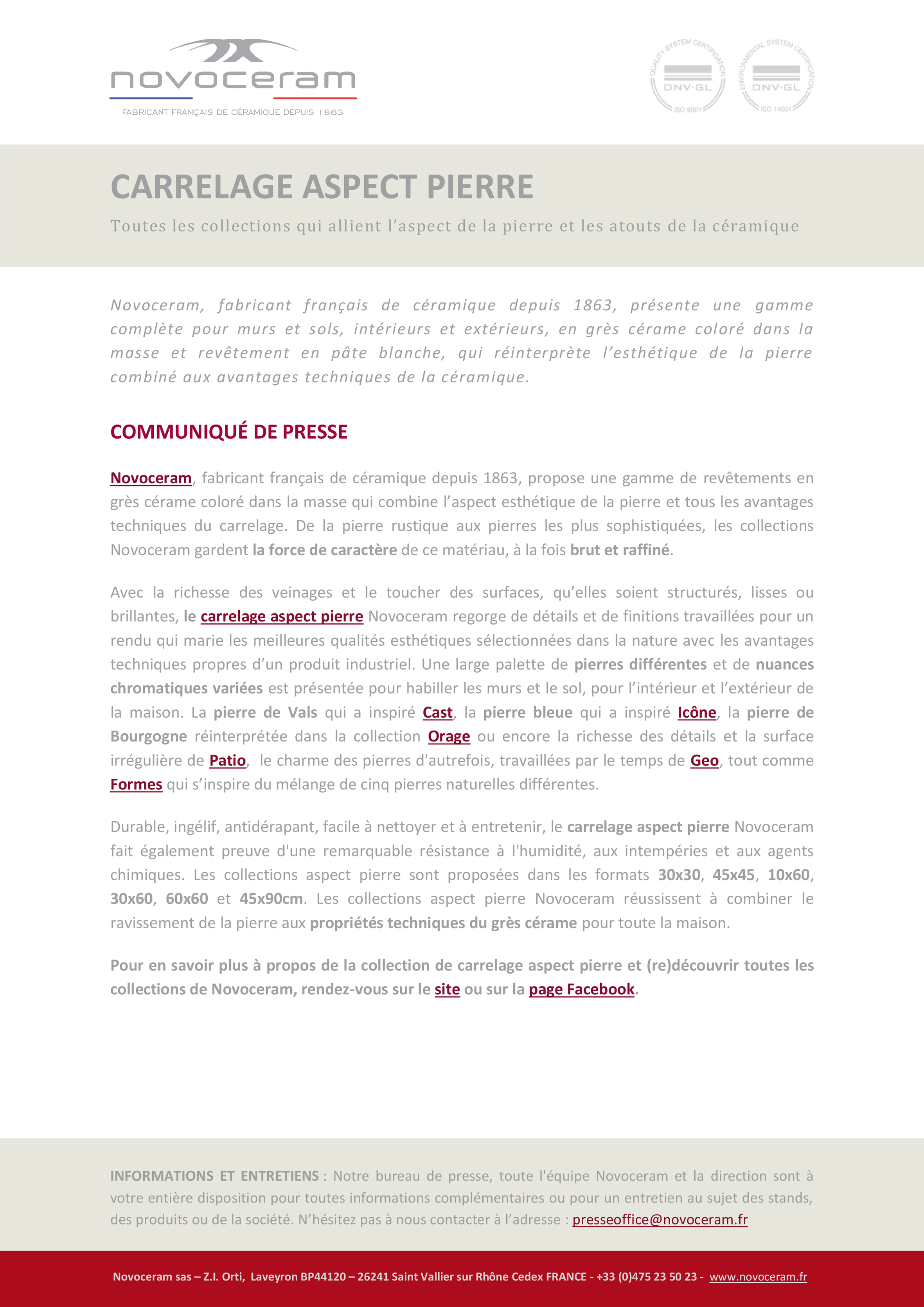 Il nostro ufficio stampa, tutta l’équipe Novoceram e la direzione sono a vostra completa disposizione per fornirvi ogni altra informazione aggiuntiva o per un’intervista sugli stand, sui prodotti o sull’azienda. Non esitate a contattarci all’indirizzo: pressoffice@novoceram.fr.