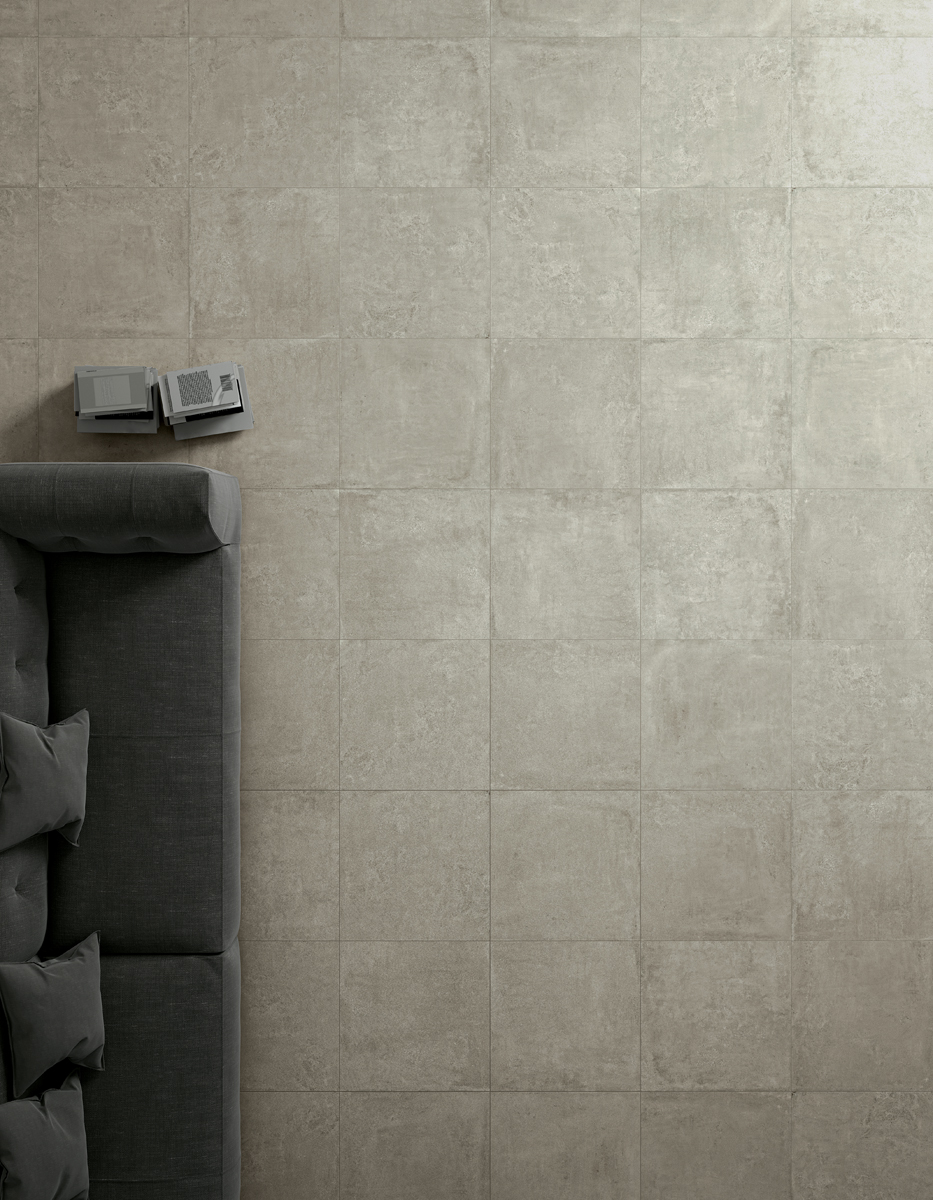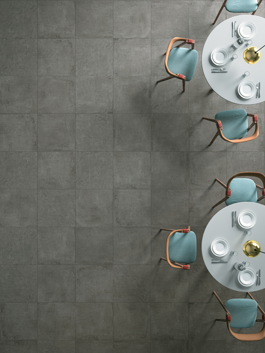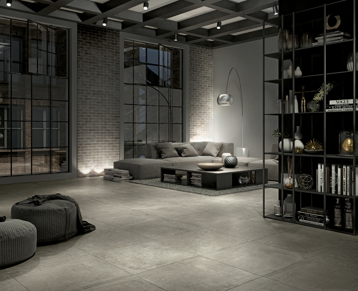 L’effetto di cemento grezzo sfumato di Fast è perfetto per tutti gli spazi residenziali e commerciali in stile contemporaneo unendo tutti i vantaggi tecnici del gres porcellanato all’estetica del cemento