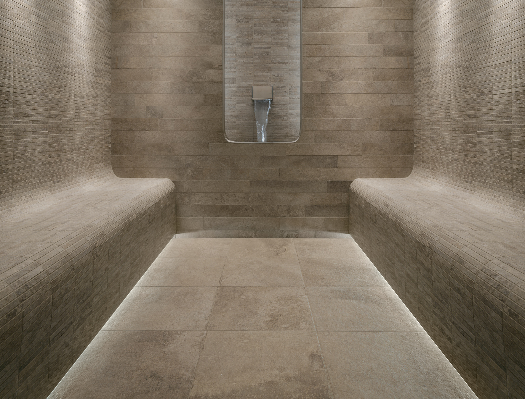 Geo è la riproduzione esatta, fin nei minimi dettagli, della pavimentazione in pietra del sagrato di un’antica chiesa nel nord Italia. Nei secoli, le intemperie, i muschi, i licheni, hanno segnato la superficie della pietra quasi cancellandone l’aspetto originario e sostituendosi ad esso, rendendola una materia nuova, una creazione del tempo. Ogni particolare è fedelmente riprodotto dalle piastrelle in gres porcellanato per esterno Geo: le sfumature cromatiche, i riflessi metallescenti, la tridimensionalità della superficie attaccata dal tempo.