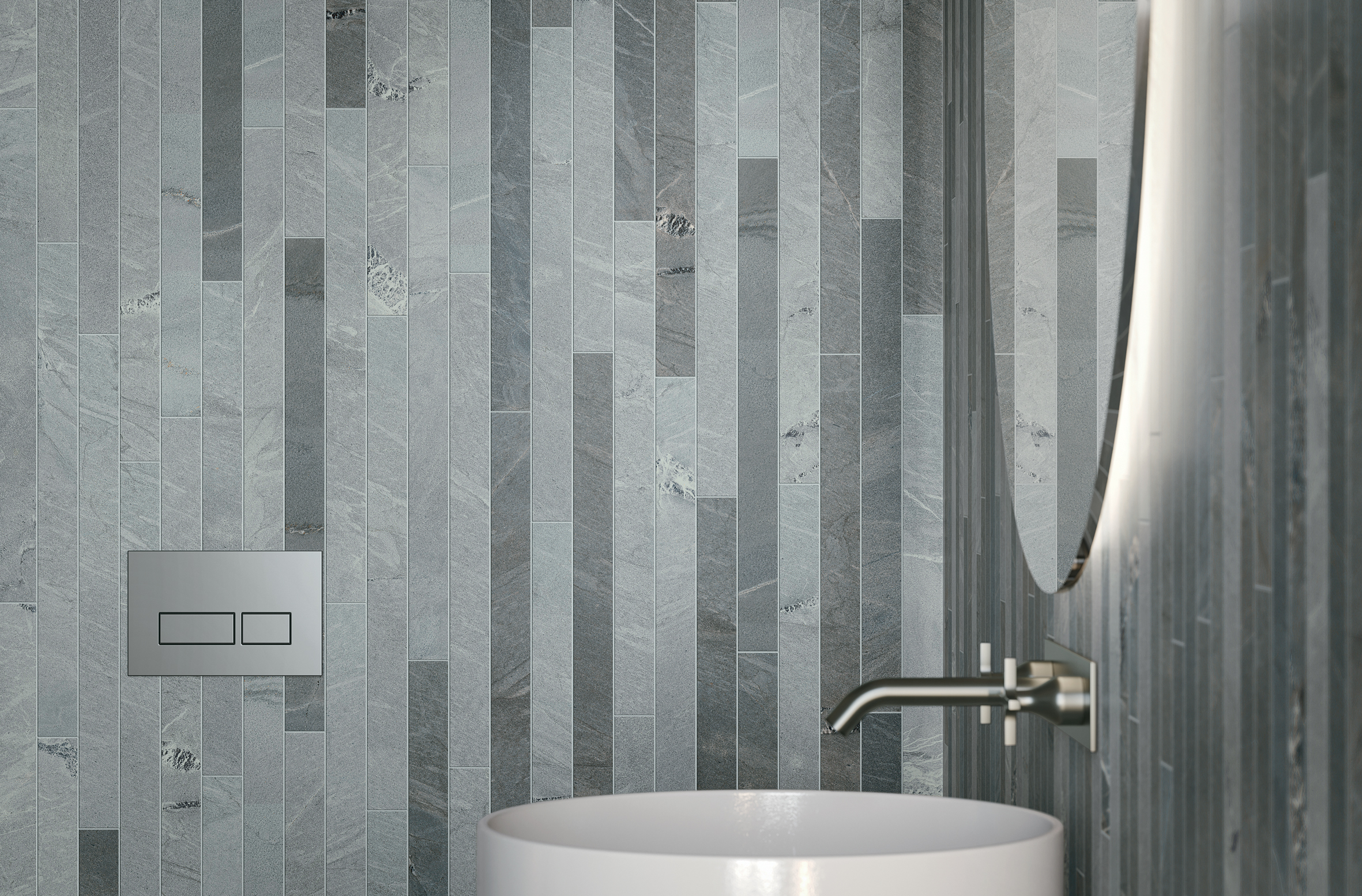 La superficie delle piastrelle è disegnata da infinite venature minerali di colore bianco, riprese in modo esatto dal materiale originale, in contrasto con un fondo ricco di sfumature di grigio. La collezione è presentata in due varianti colore: Fer e Quartz. La prima è identica alla sfumatura color cenere della pietra originale, mentre la seconda è una interpretazione in una gamma più chiara.