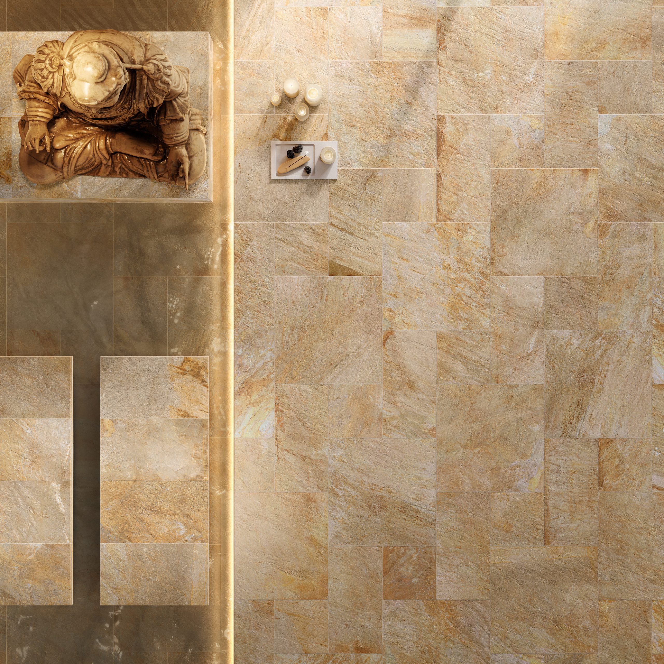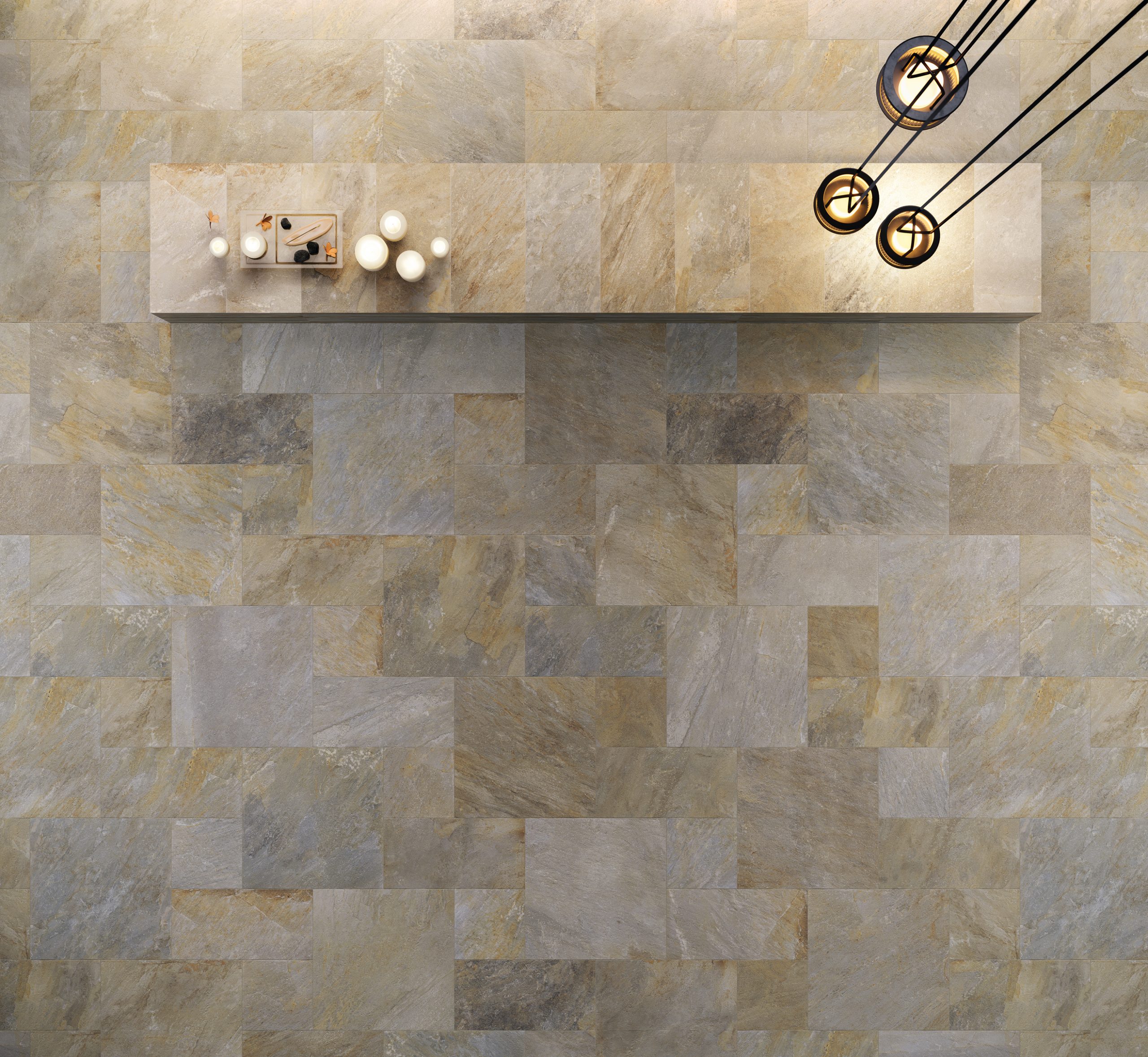 Zéphyr è proposta nel colore originale Grey, che, su un tonalità dominante di colore grigio verde, mantiene tutta la varietà cromatica della pietra originale, e nel colore Gold, ottenuto attraverso una selezione delle pietre dai toni più caldi e dorati.