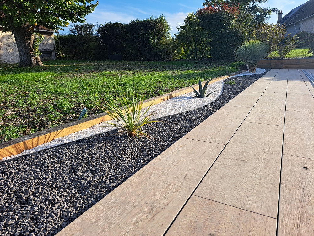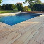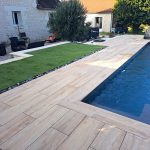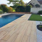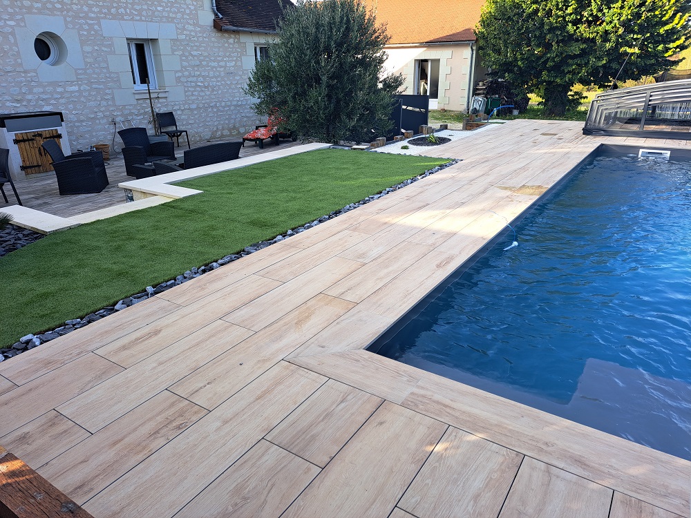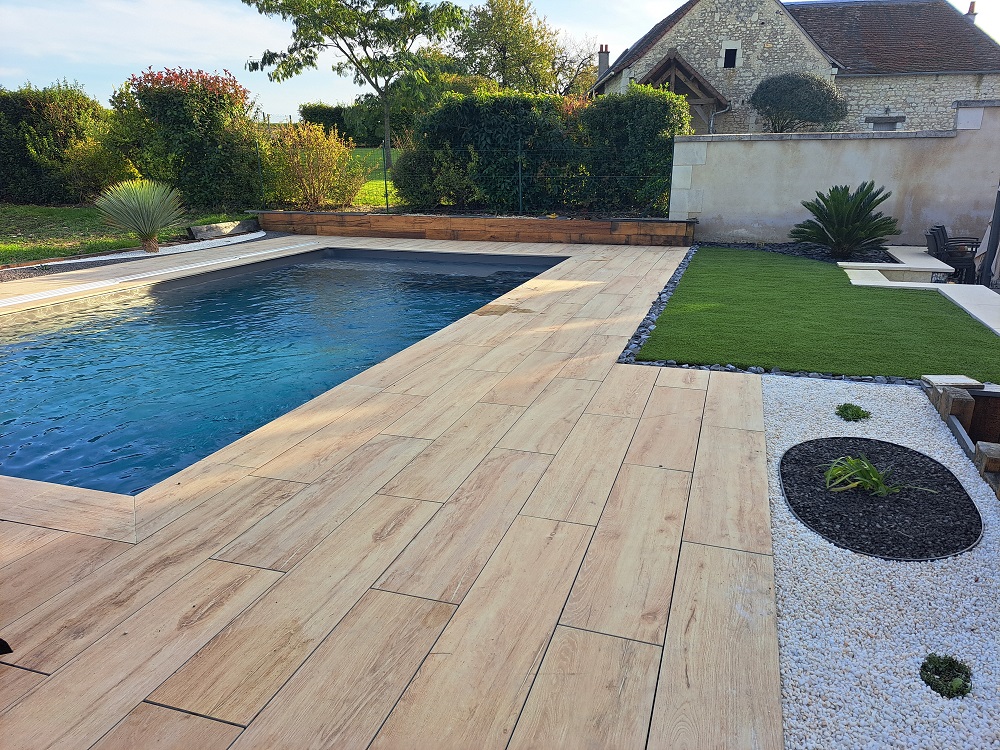 Questo progetto di allestimento intorno alla piscina mostra il lavoro accurato di Chatel Granulats. La scelta della collezione Abéa trasforma completamente lo spazio grazie al suo effetto legno molto riuscito.