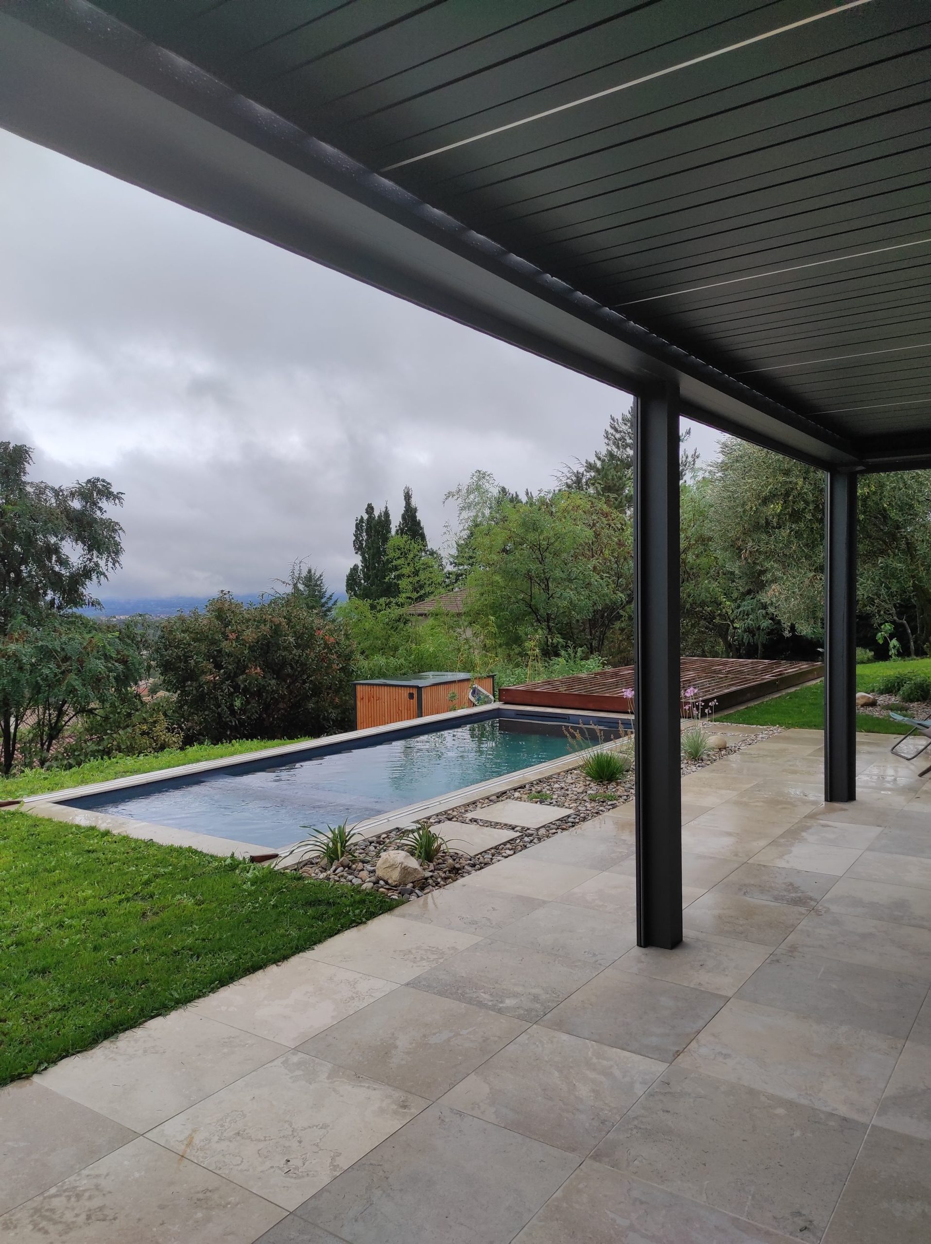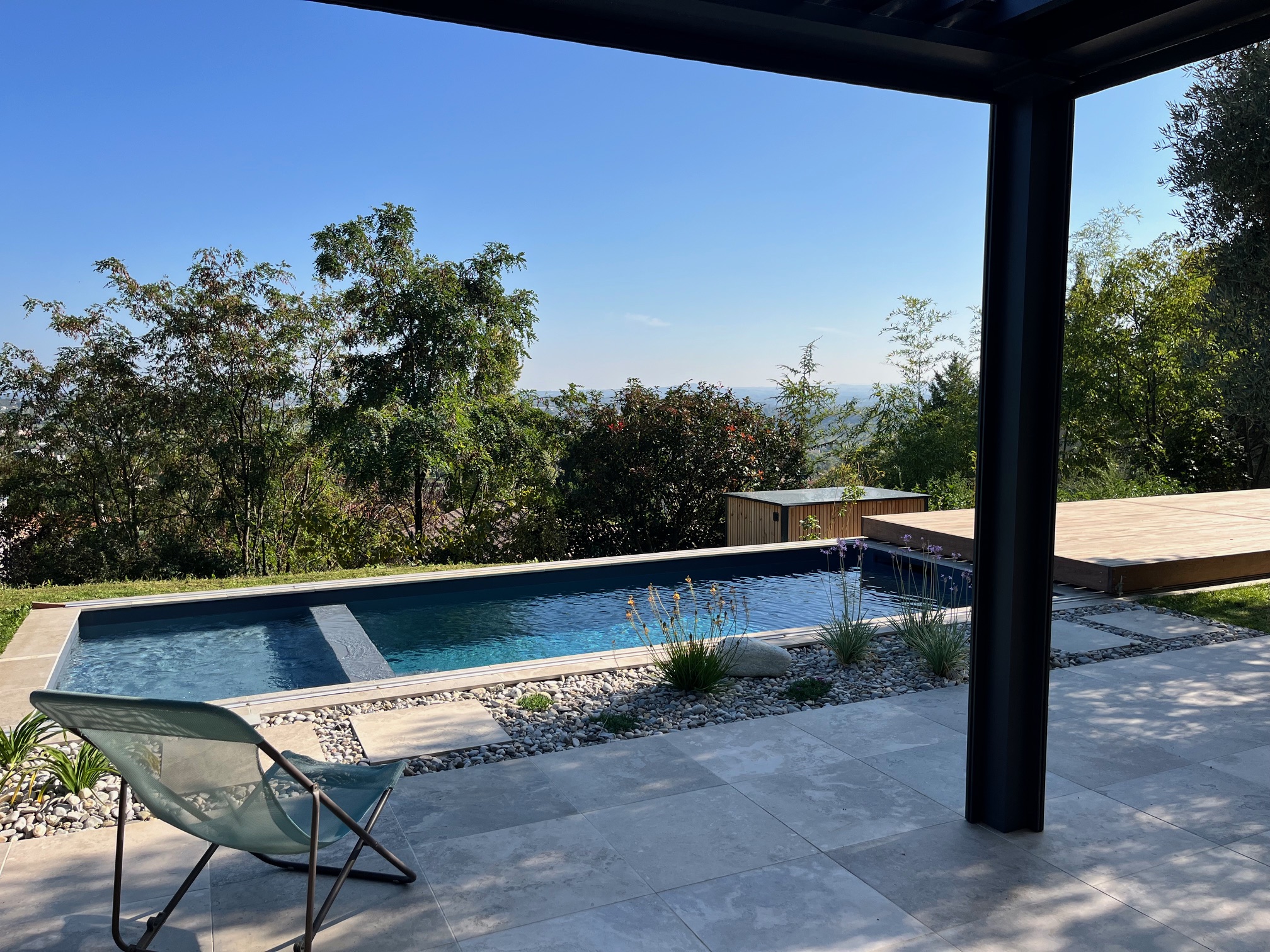 La terrazza, ombreggiata da un pergolato bioclimatico, si affaccia su una piscina dalle dimensioni perfettamente adatte alla vita familiare e all’ambiente paesaggistico.