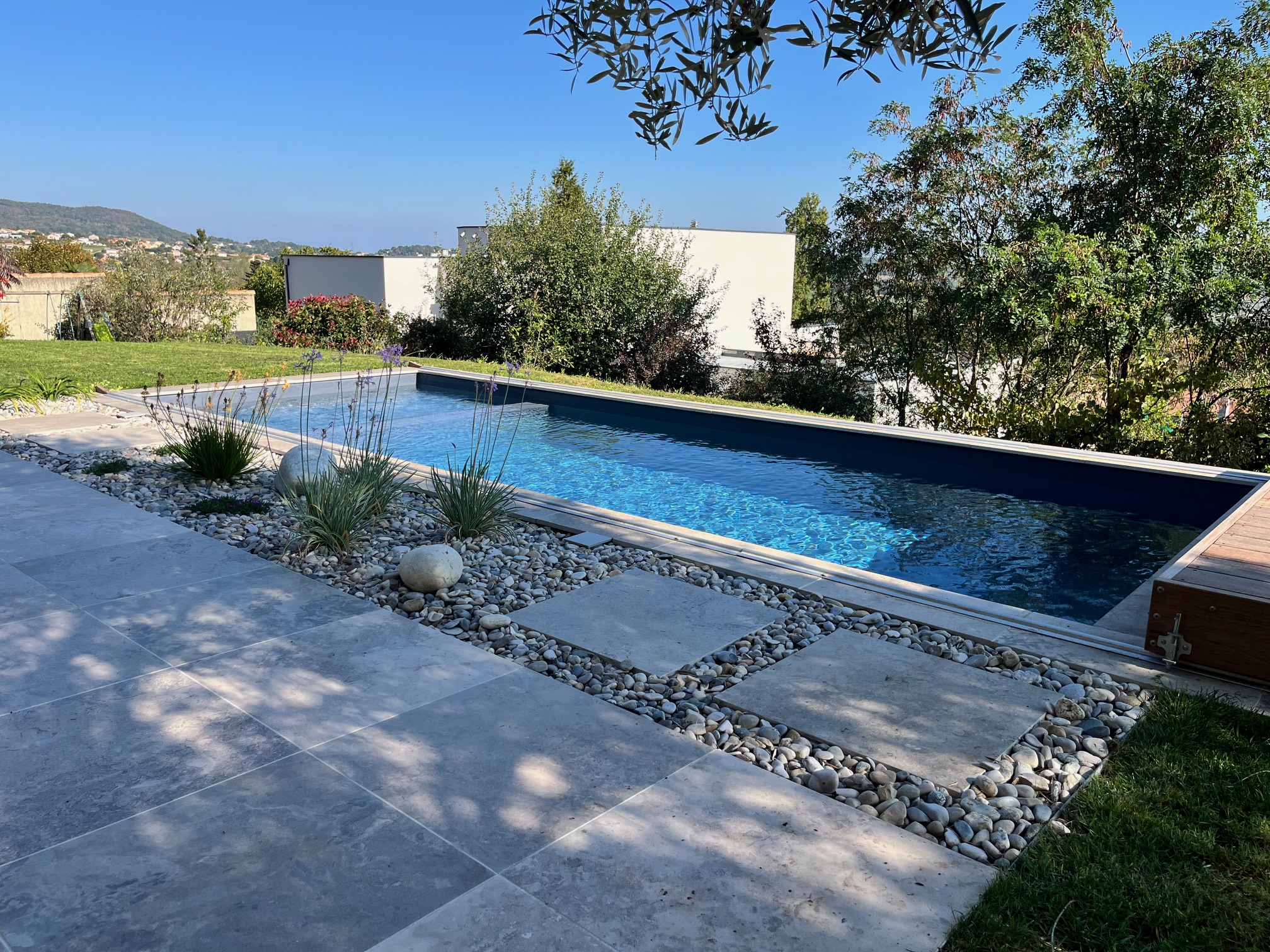 A completare questo spazio, è stata integrata una terrazza in legno su binari: una scelta estetica e pratica, che permette di coprire la piscina in tutta sicurezza, senza rompere l’armonia creata da Solithe.