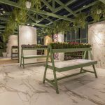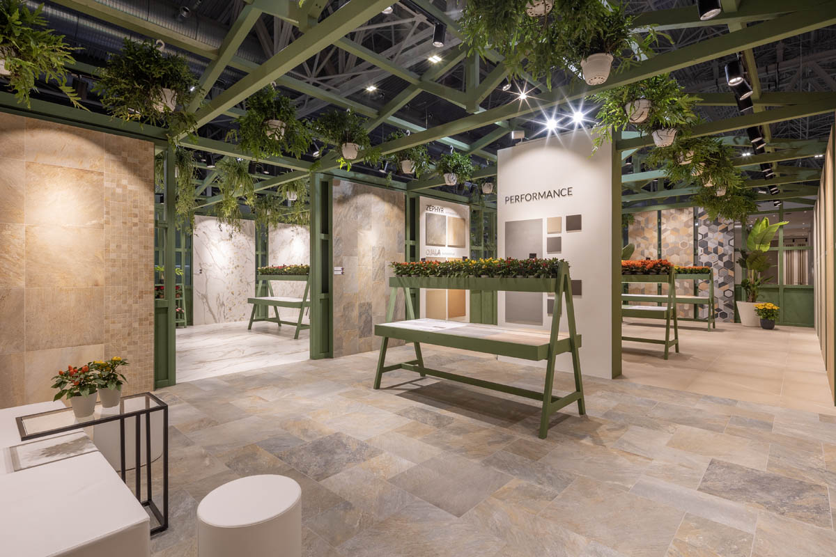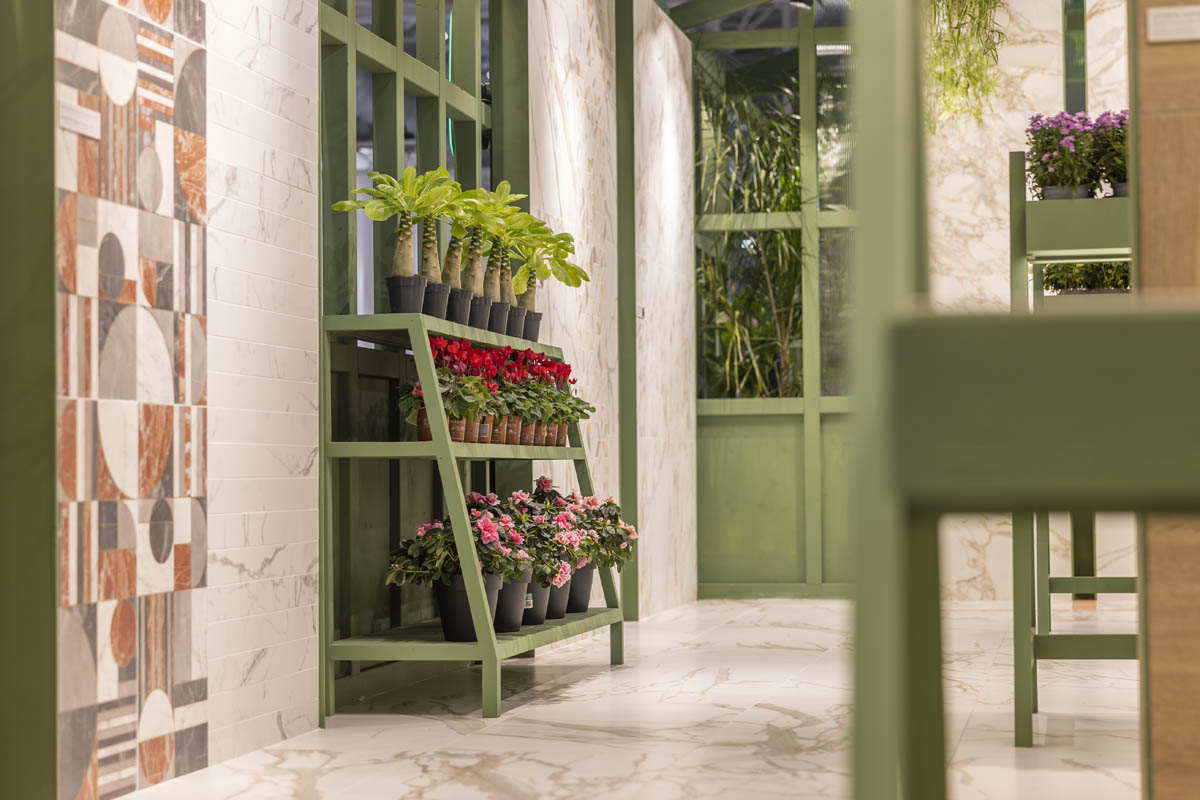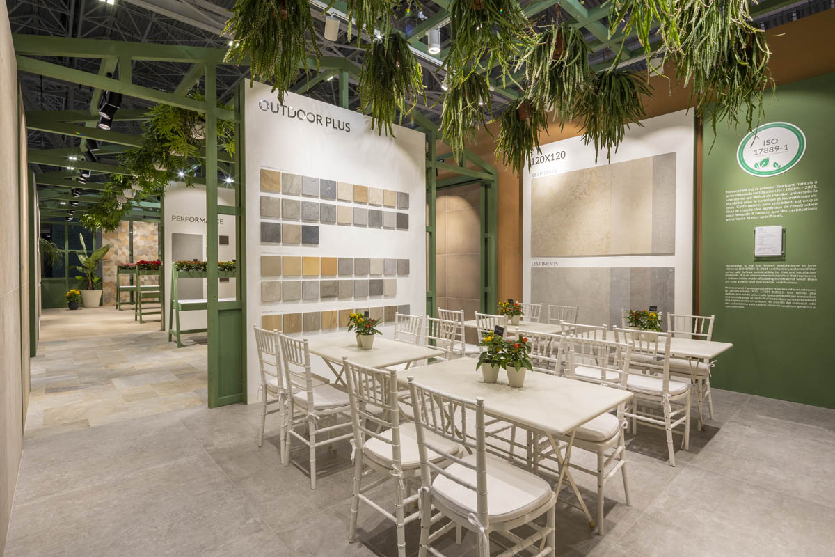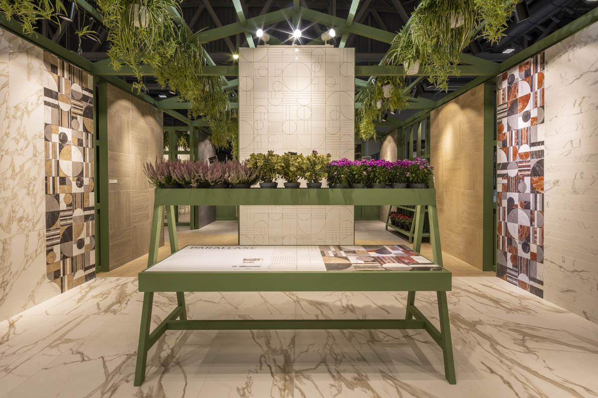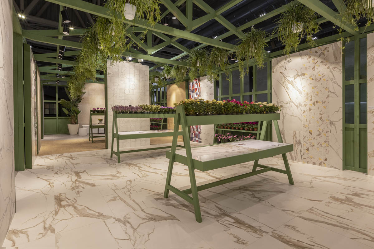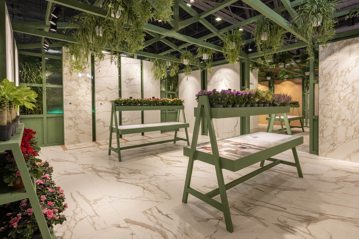 La scenografia di Chlorophylle ci guida attraverso un vivaio per scoprire le sette nuove collezioni effetto marmo, terracotta, legno, cemento e pietra. Questo tributo ai vegetali è anche l’occasione per celebrare il conseguimento di una nuova certificazione legata alla sostenibilità dei suoi prodotti, la norma ISO 17889:1