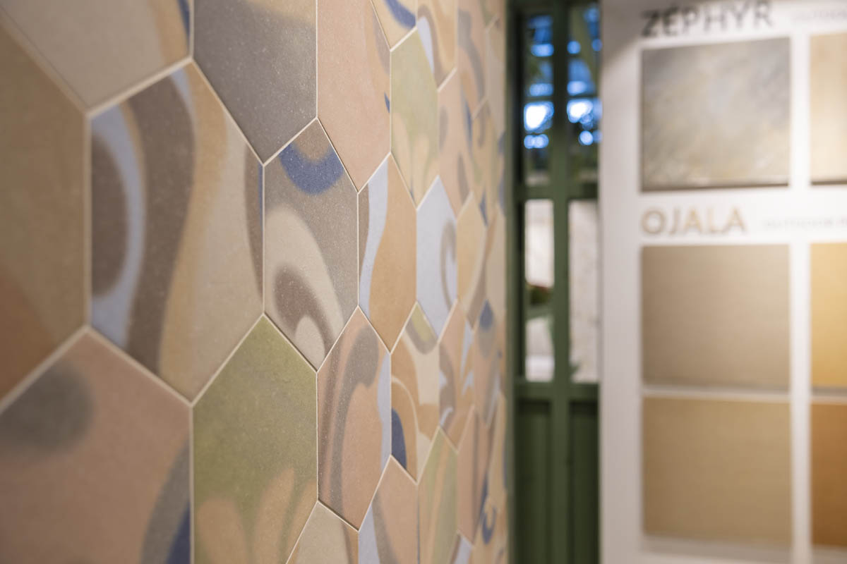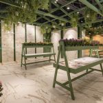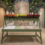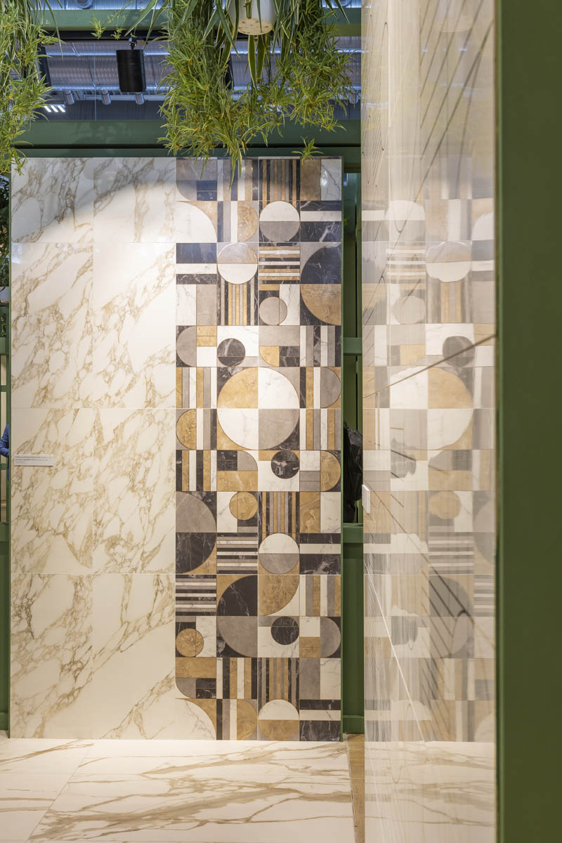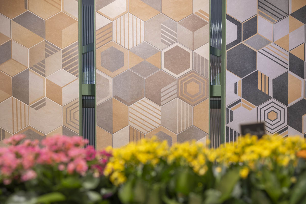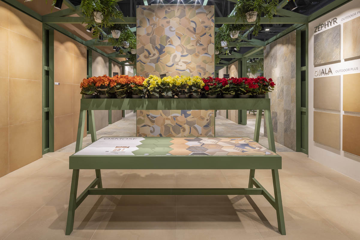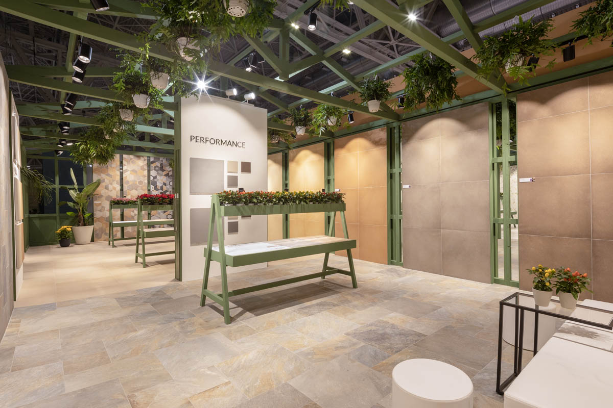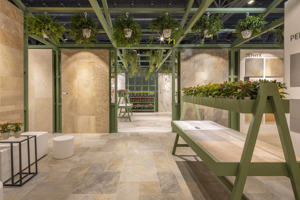 La scenografia di Chlorophylle ci guida attraverso un vivaio per scoprire le sette nuove collezioni effetto marmo, terracotta, legno, cemento e pietra. Questo tributo ai vegetali è anche l’occasione per celebrare il conseguimento di una nuova certificazione legata alla sostenibilità dei suoi prodotti, la norma ISO 17889:1