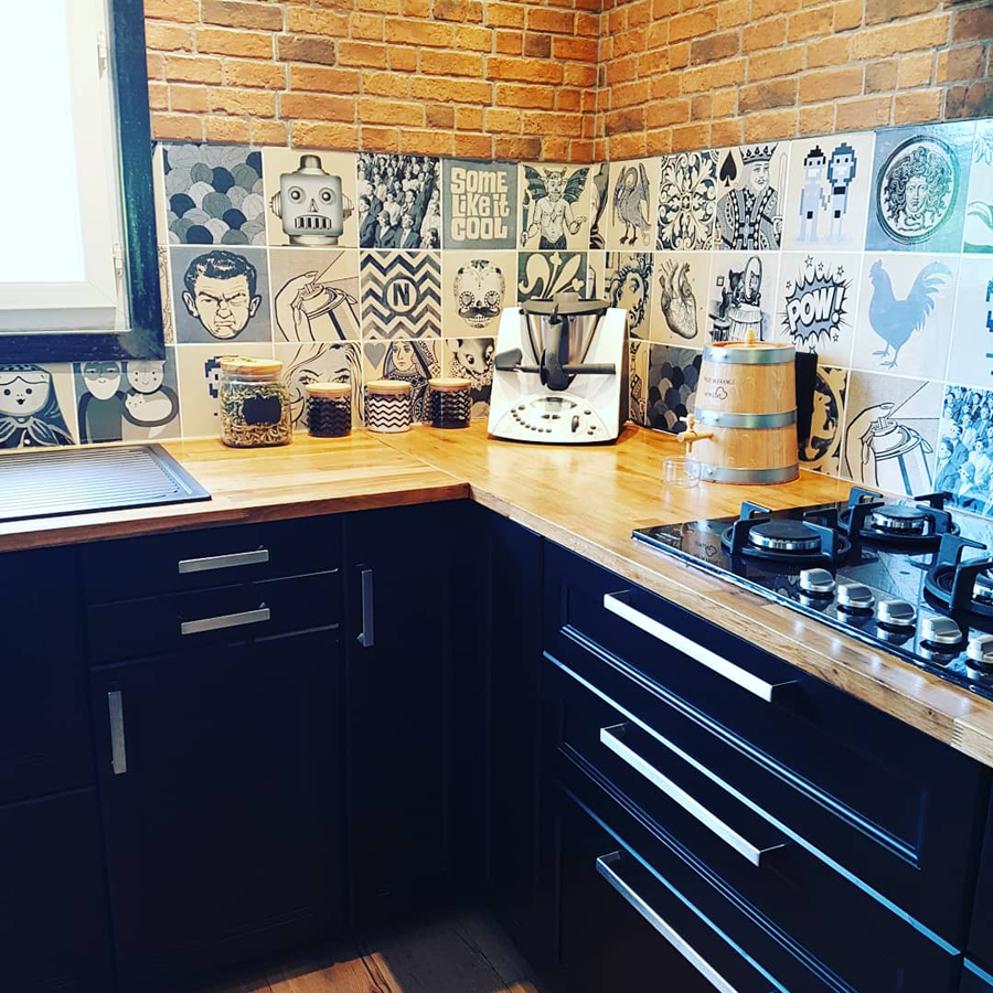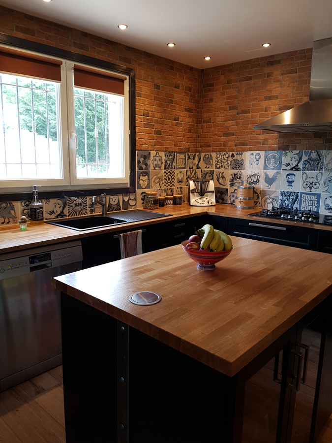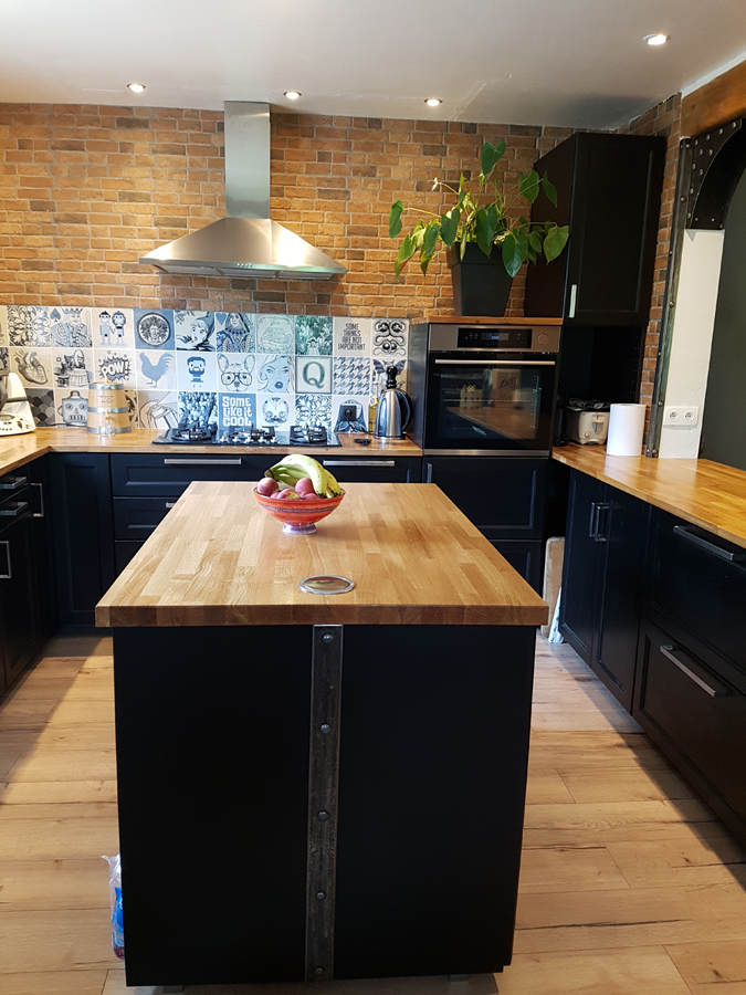 Una cucina che combina il piano in legno, le finiture in metallo e le piastrelle Indigo Decor mix