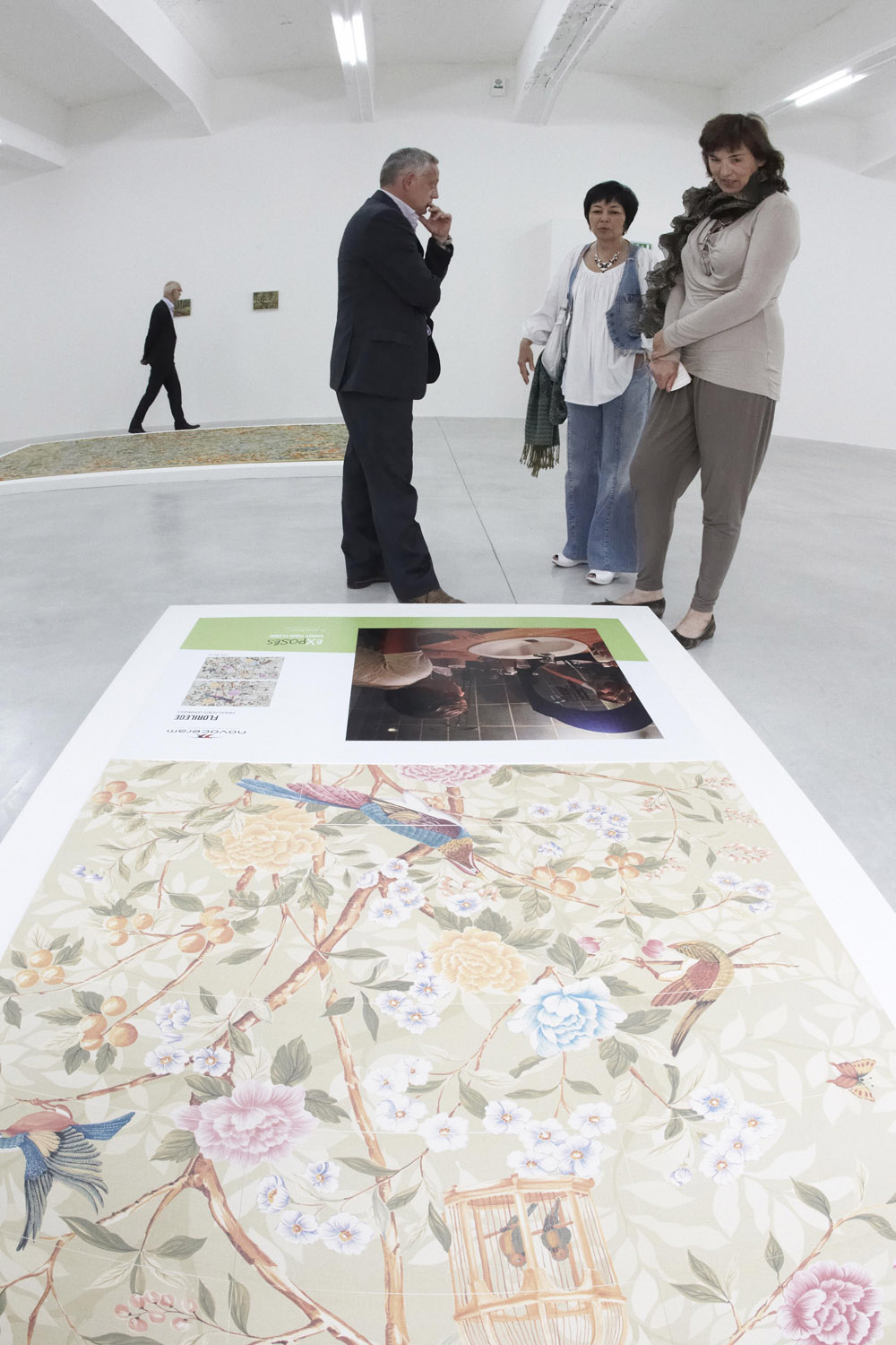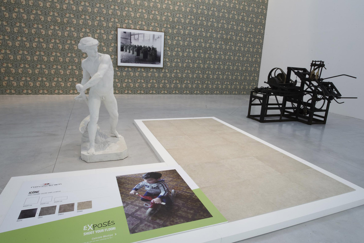 In questa foto, scattata all’inizio del percorso, si vede bene quanto le due iniziative siano strettamente legate. Da una parte, le migliori fotografie del concorso on line permettono di alimentare la presentazione delle ultime collezioni “exposées” (esposte) su pedane rialzate rispetto al pavimento del Museo, come – in questo caso – la serie Icône. D’altra parte, le opere degli artisti presentate nell’ambito dell’esposizione Le Monde comme Volonté et comme Papier-Peint, ispirata al romanzo di Michel Houellebecq, costituiscono un quadro eccezionale per la messa in scena delle nuove collezioni di Novoceram.