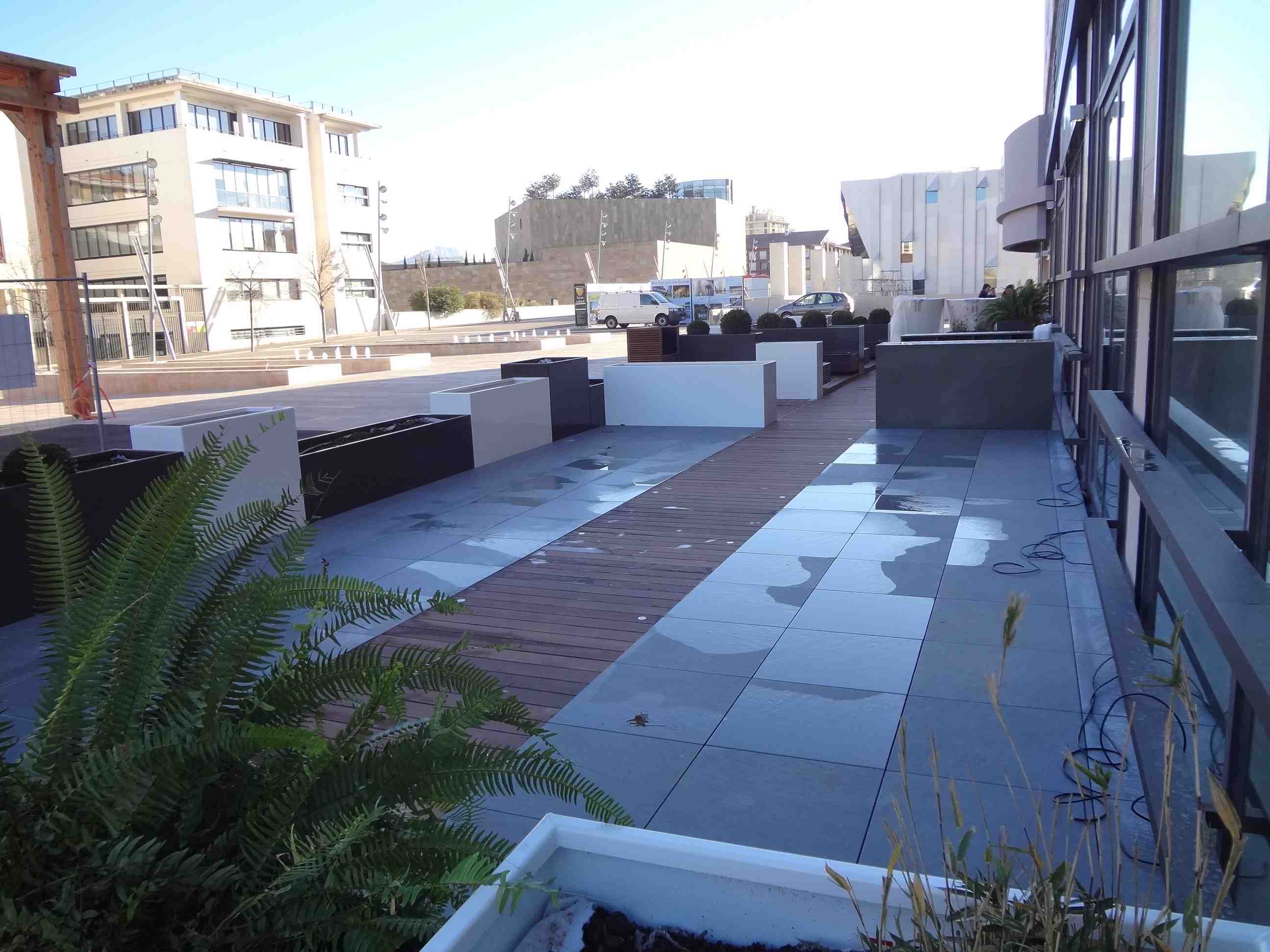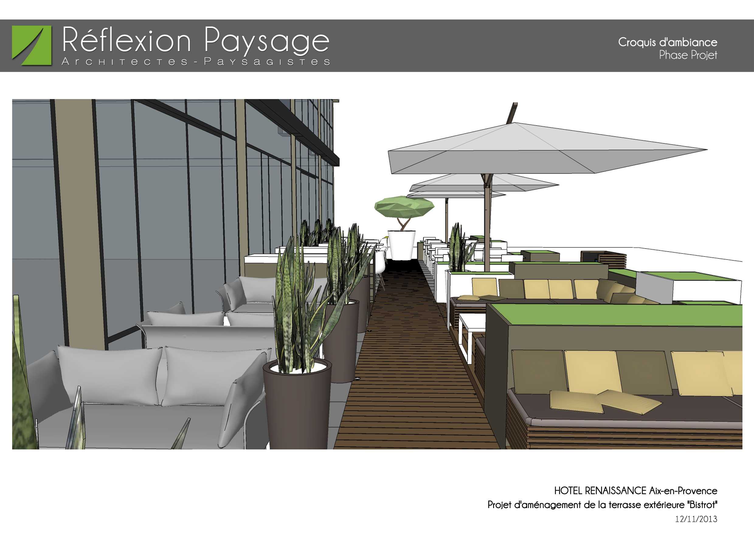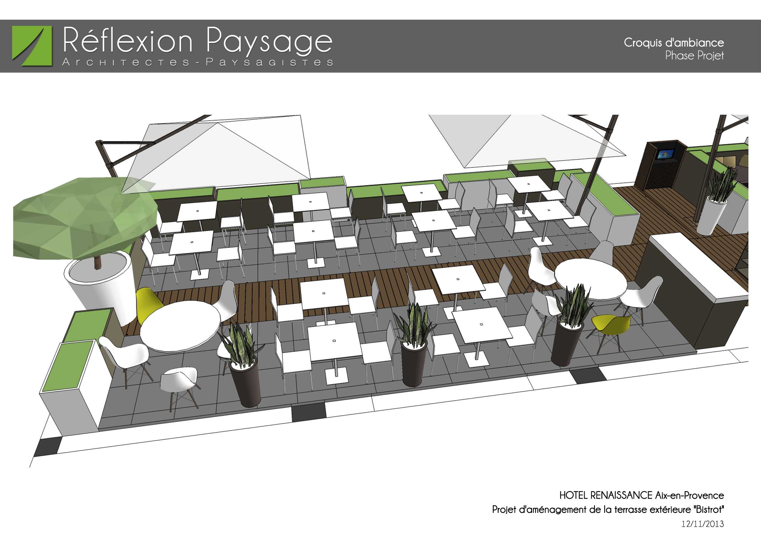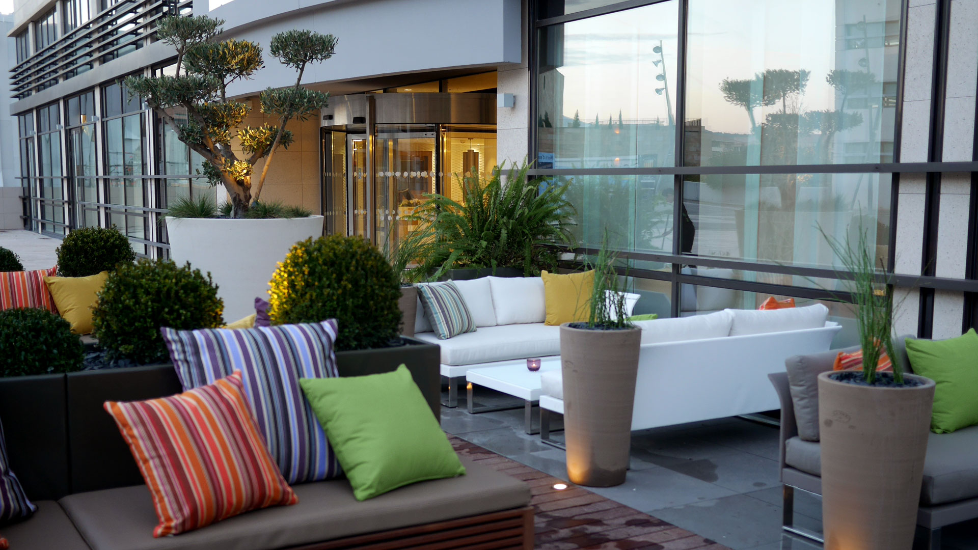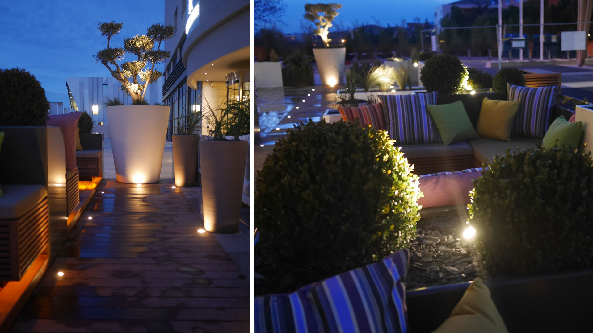 Concezione delle terrazze esterne per il ristorante “Le comptoir du clos” e “Le clos”. Spirito contemporaneo e accogliente per un’area di ristorazione e uno spazio lounge in cui si mescolano pietre, vasi in terracotta, cuscini, vegetazione grafica. Il secondo terrazzo dedicato al relax si compone di poltrone, divani, pouf e vasi con grandi vegetali.