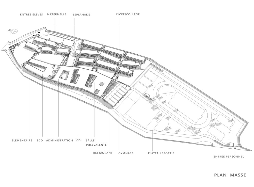 Il programma comprende la costruzione di un polo scolastico sull’area occupata precedentemente dagli impianti sportivi, che comprende scuola dell’infanzia, scuola primaria, scuola media inferiore e superiore per un totale di 2 500 studenti. Vincitore del Grand Prix AFEX 2012 de l’architecture française dans le monde.