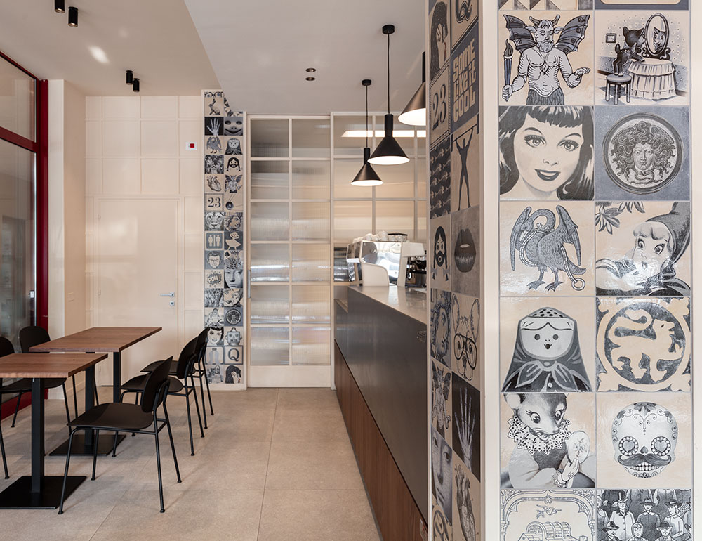 un nuovo look per Mama Moka, un piccolo bar a Casalgrande in provincia di Reggio Emilia, progetto firmato dall’architetto Stefano Lodesani che ha saputo dare una impronta inconfondibile a questo locale grazie anche alla collezione Indigo che si abbina perfettamente allo stile pop industriale.