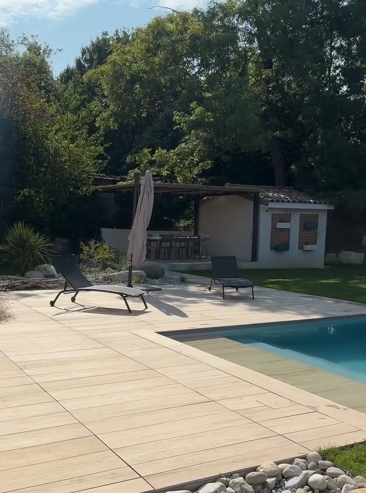 Il bordo piscina è rivestito con la collezione Abéa di Novoceram, una piastrella effetto legno che conferisce un’estetica calda e naturale all’intero progetto. Questa scelta permette di integrare armoniosamente la zona della vasca nel suo ambiente paesaggistico.
