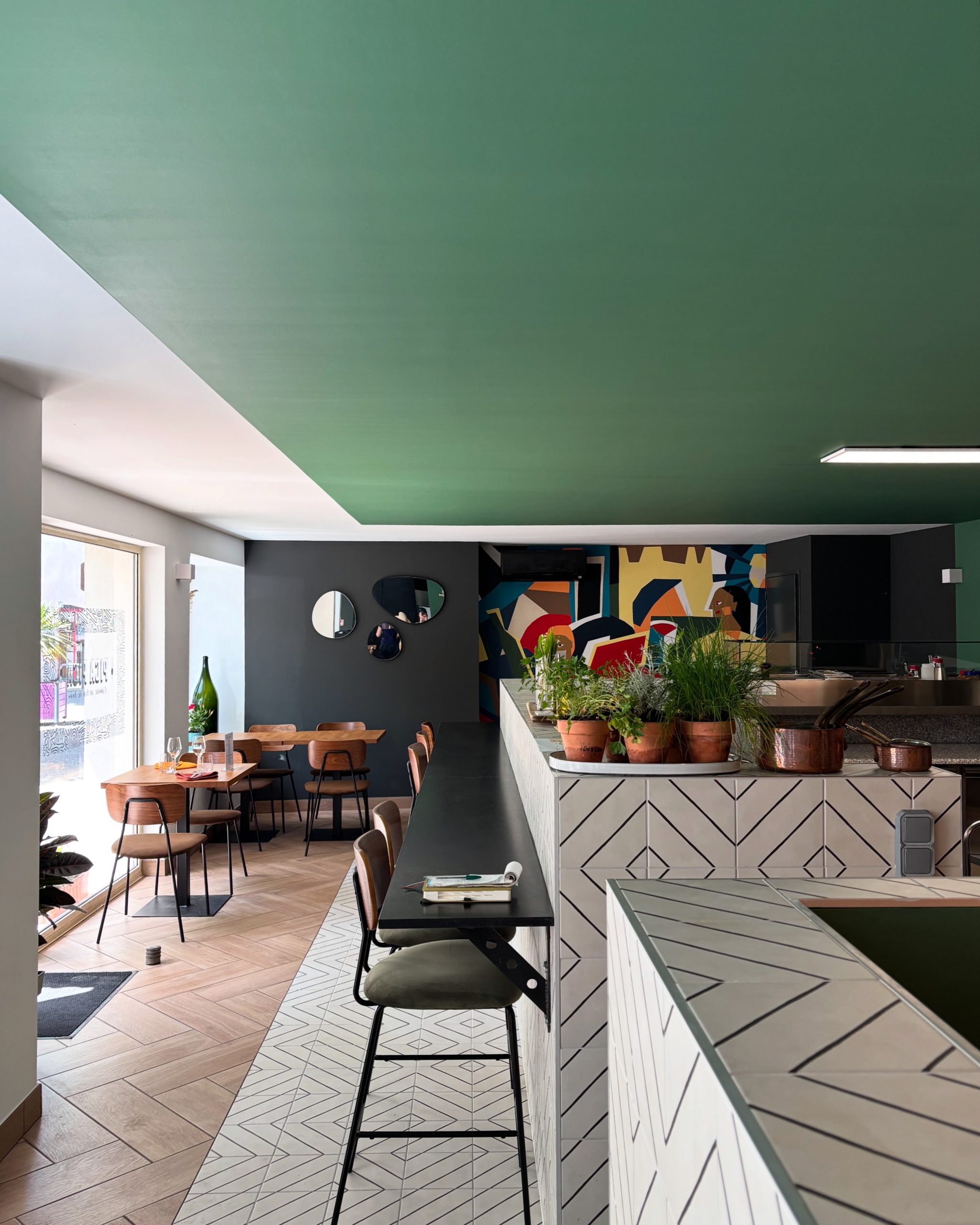 La collezione Bohème di Novoceram è stata utilizzata su una parte del pavimento, nonché sulle superfici del bar e della cucina. La sua estetica decorativa, ispirata alle piastrelle in cemento, permette di dare ritmo ai volumi e di creare zone distinte all’interno del locale.