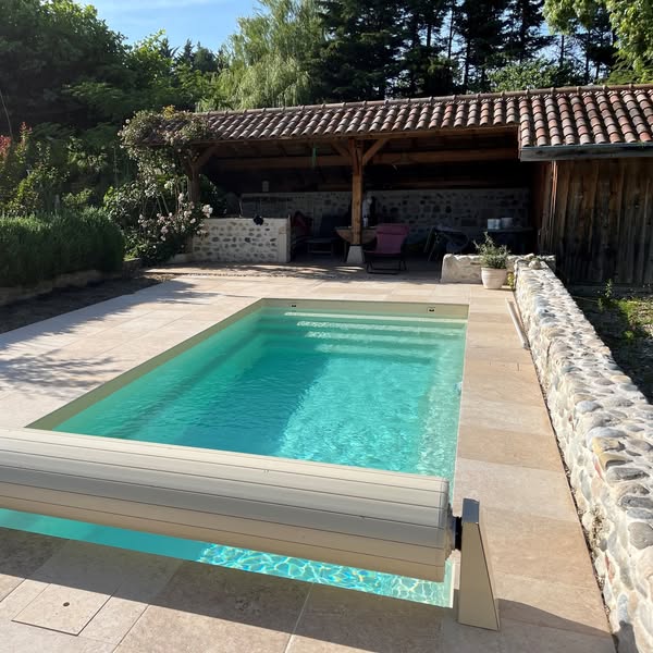 Il bordo piscina è stato completamente rinnovato con la collezione Tiber, le cui sfumature ispirate al travertino si armonizzano perfettamente con il muretto in pietra adiacente.