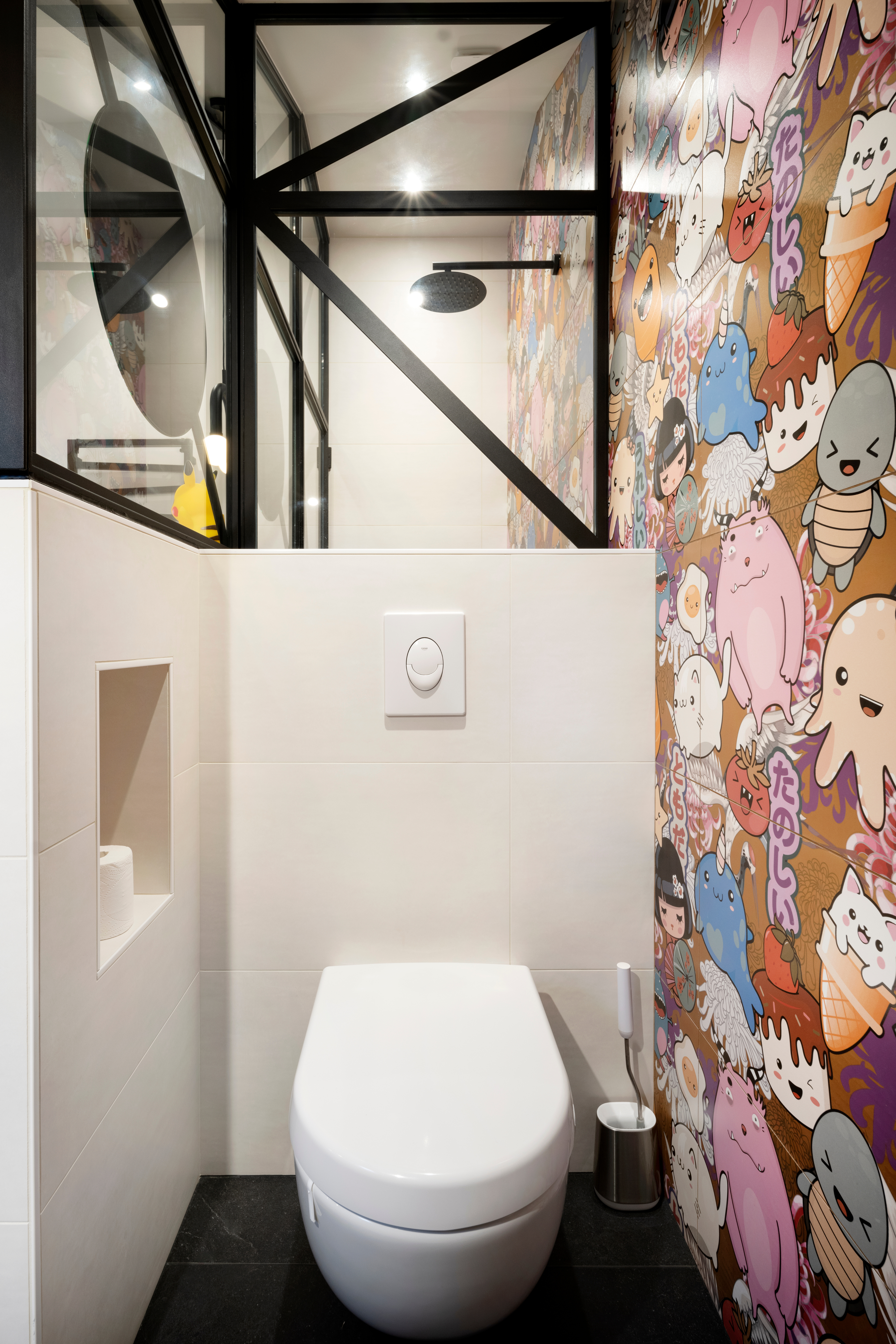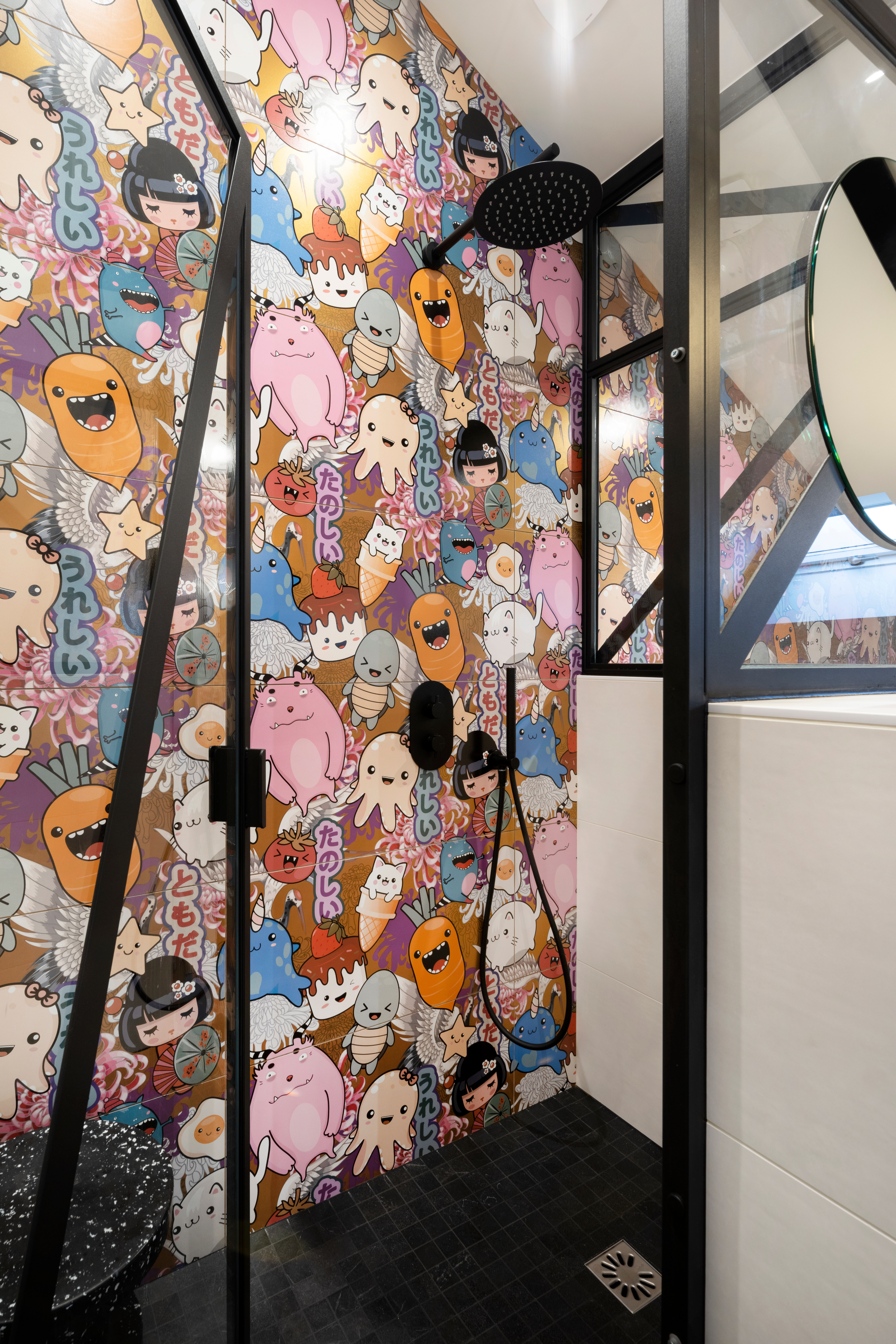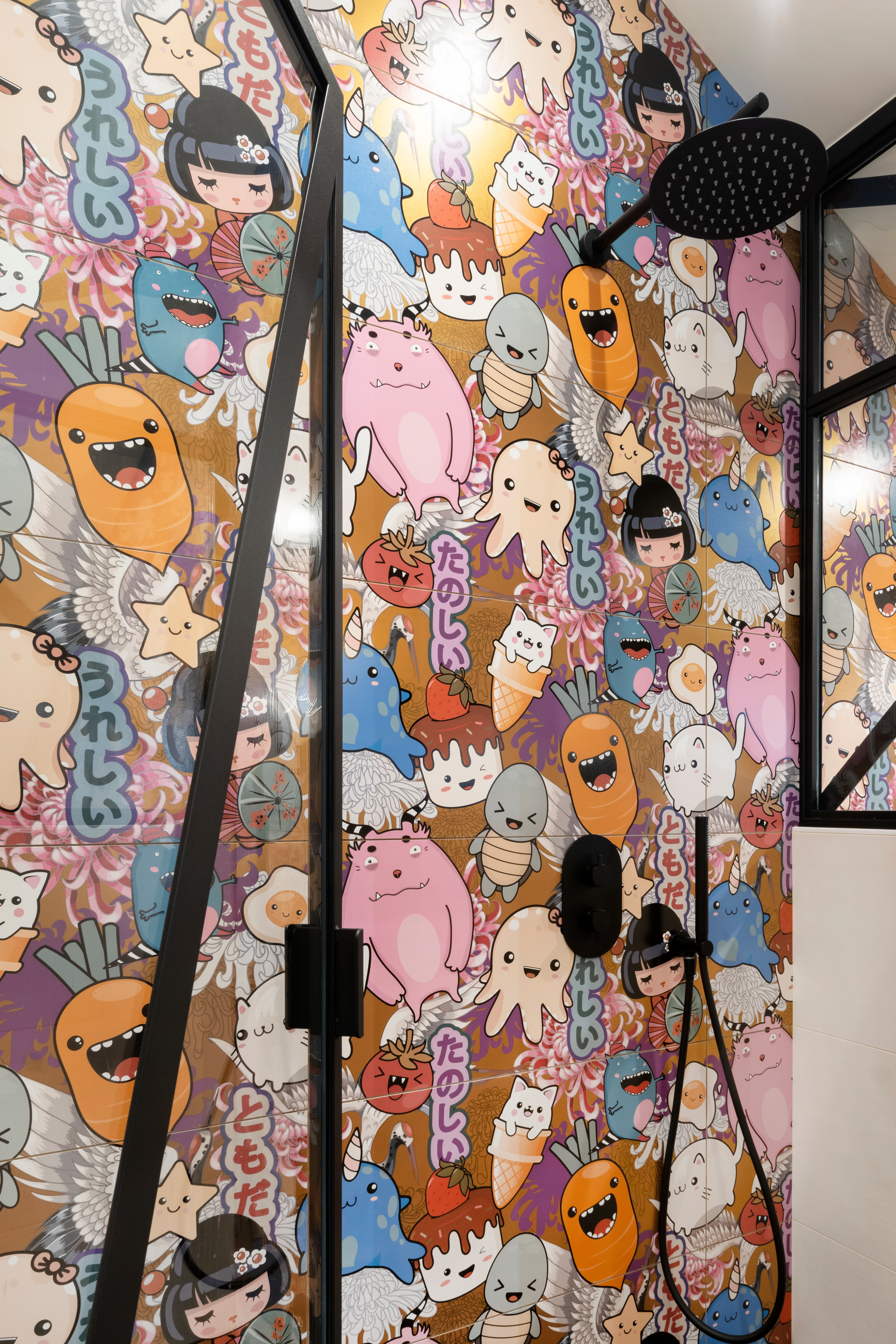 In questo progetto audace e giocoso, l’architetto Maud Pierrot ha creato una suite padronale unica, dove creatività e originalità si fondono. La collezione di piastrelle Kawaii di Novoceram veste la zona bagno con un tocco di allegria colorata, ispirata al mondo pop giapponese. Questo decoro vivace, abbinato a un’elegante palette monocromatica e a moderni elementi geometrici, porta una ventata di freschezza pur mantenendo un’estetica pulita. Questo progetto dimostra la capacità dell’architetto di progettare spazi che riflettono la personalità di chi li abita.