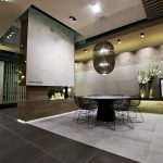 Il lampadario Plass di Foscarini cattura gli sguardi e si sposa perfettamente con i toni neutri della collezione Ciment.