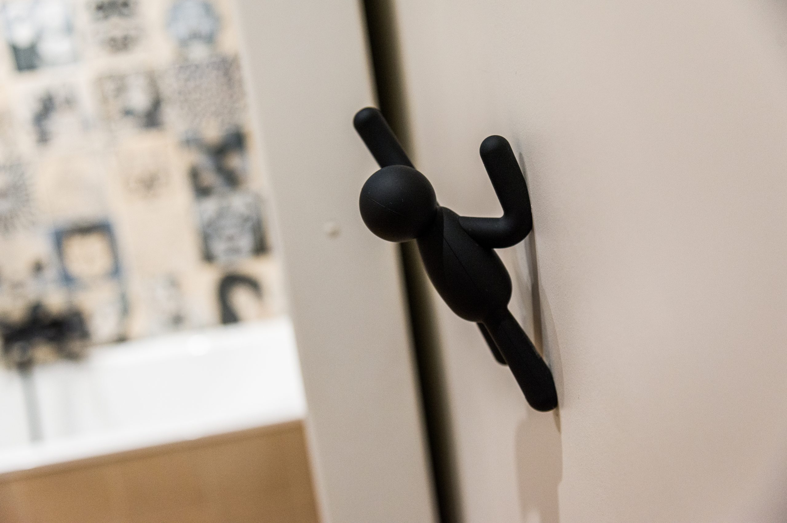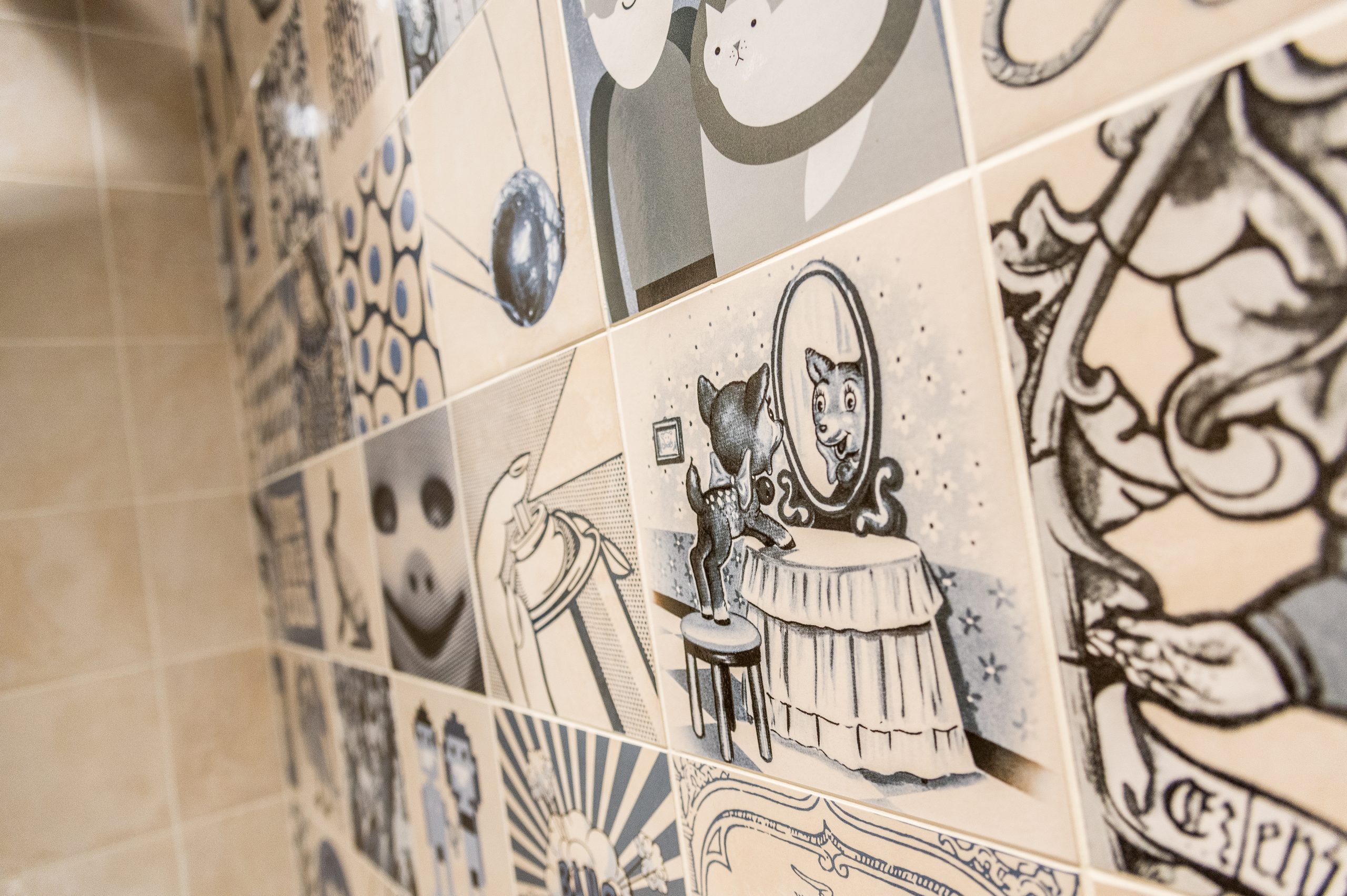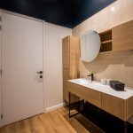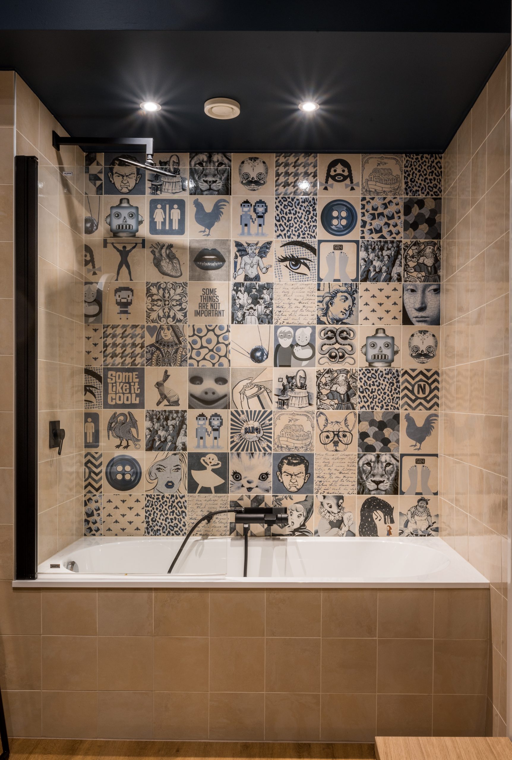 Ogni dettaglio, dal soffitto blu intenso alla rubinetteria nera opaca, è stato attentamente studiato per mettere in risalto le sfumature delle piastrelle e trasformare questo spazio in un vero e proprio bozzolo di ispirazione.